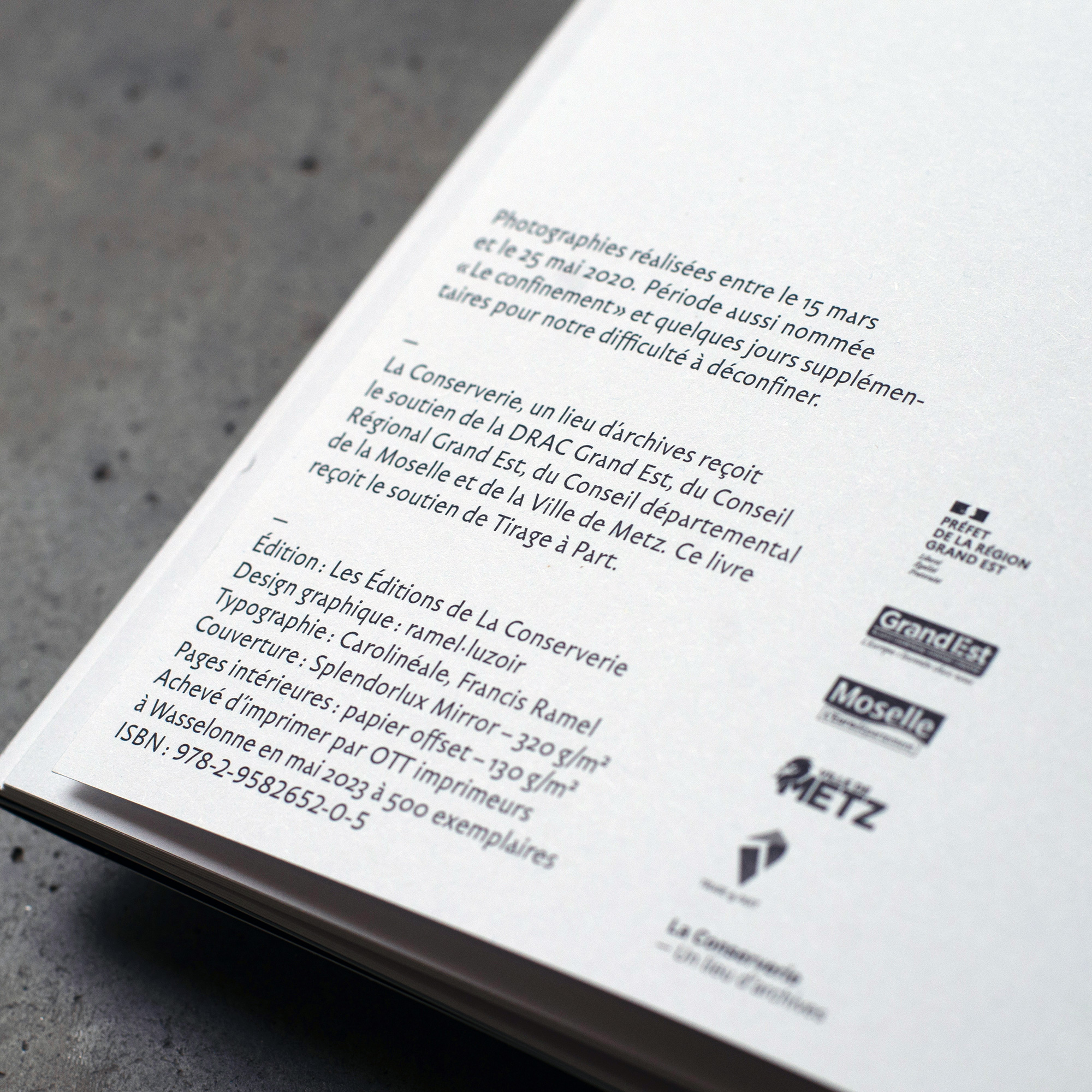 Conceived by Odilon Roelens-Delrez and Anne Delrez and published in France by Éditions de la Conserverie, this elegant book comprises a series of arty photographs made by the authors between March 15 and May 25, 2020, that is during the confinement. The volume was designed by the ramel · luzoir studio in Strasbourg, using for all texts the typeface Carolinéale, designed by Francis Ramel and published by PampaType.