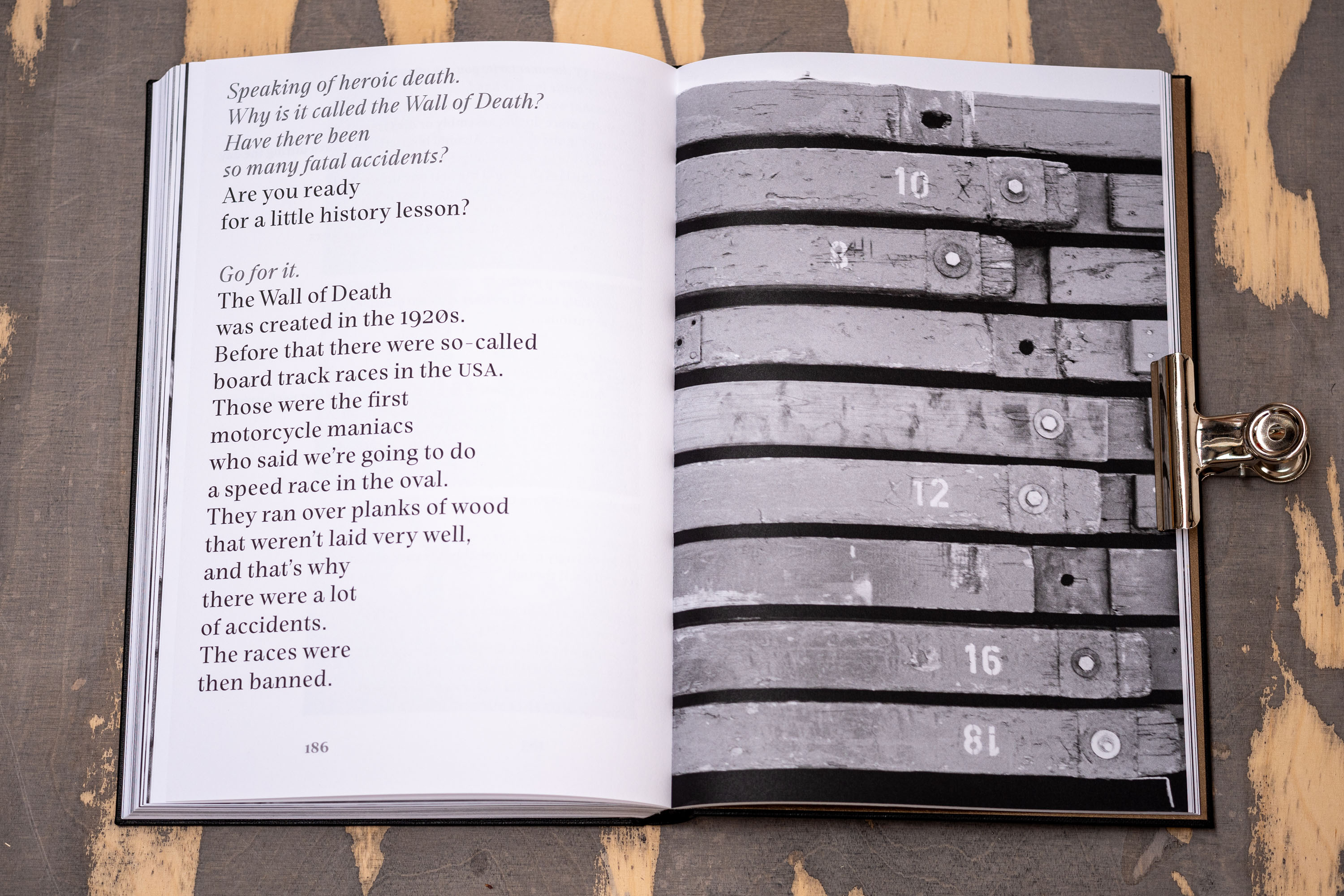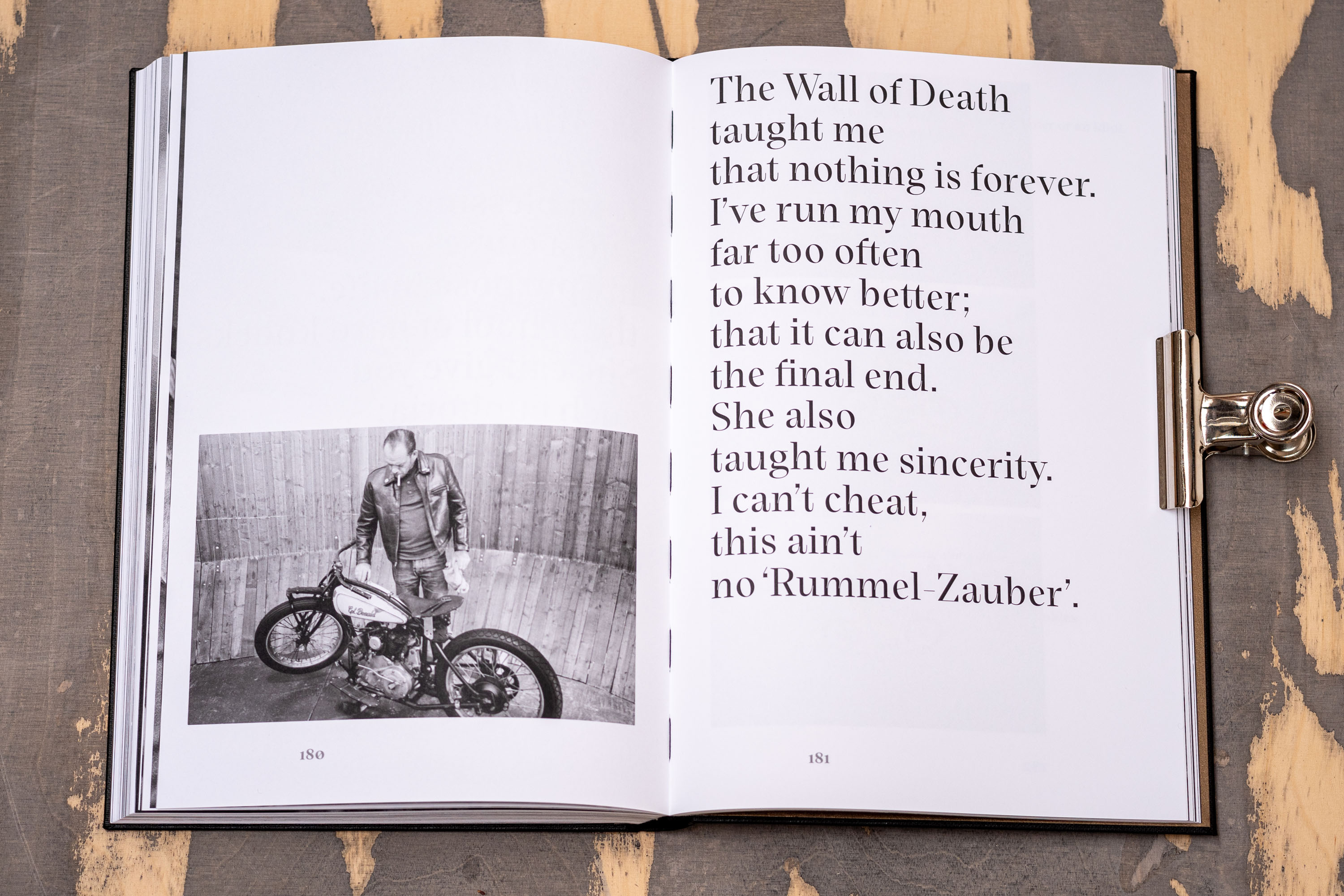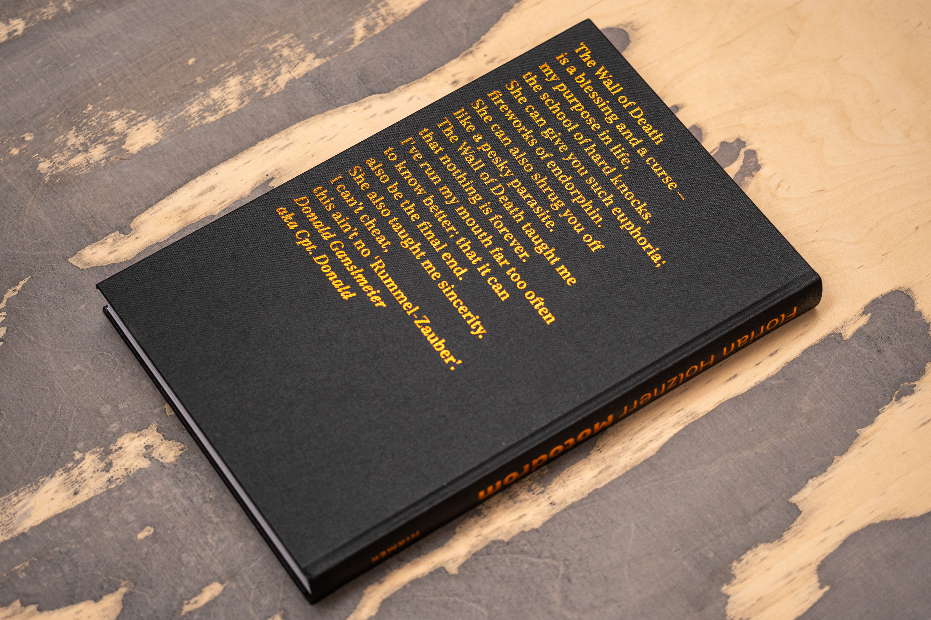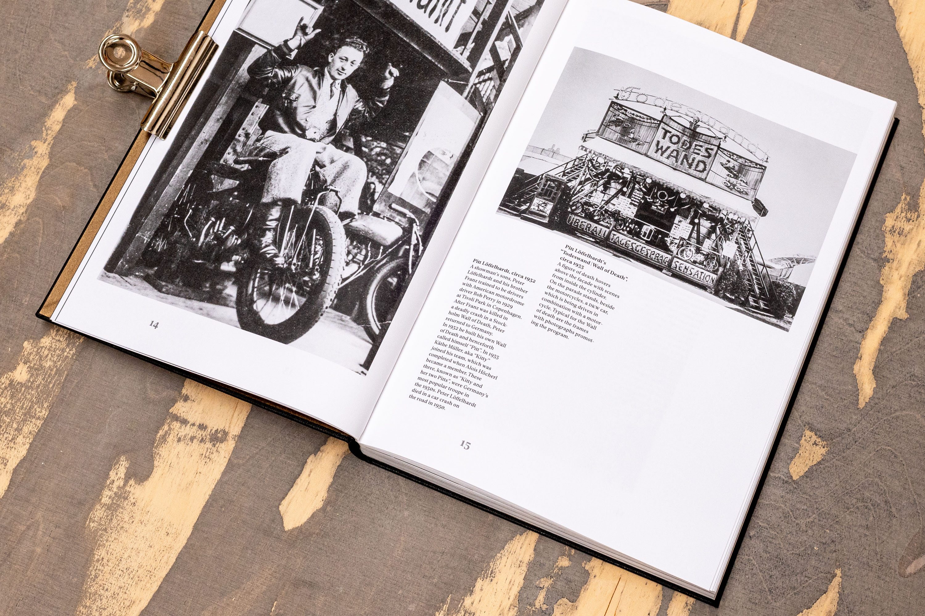 For several years the Munich photographer Florian Holzherr accompanied the steep-wall motorcyclists around Donald Ganslmeier with his analogue camera while setting up the Wall of Death and riding and then dismantling it again, and then in their lives on the road. The result is images which show the story of an artistry that is threatened with extinction. In impressive, unfiltered black-and-white pictorial language accompanied by powerful texts, the volume enables the reader to learn of the fascination and passion, and also of the risk, as it provides an insight into the lives of the artists beyond the show.