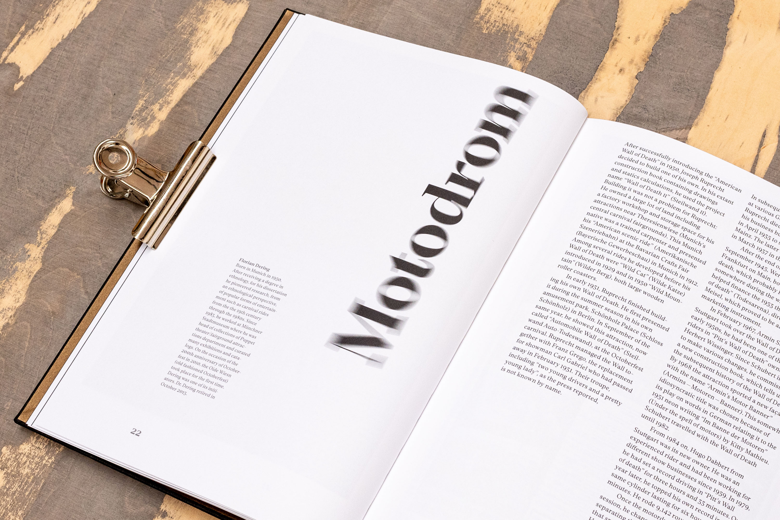 In 2023, Clemens Schedler (Büro für konkrete Gestaltung) designed this book on the photographic work of Florian Holzherr, about the oldest travelling motordrome, or Motodrom in German. To contrast with this quite unexpected subject, he chose to work on a delicate layout. He played with black and a subtle tone of grey, to recall the black and white photographs. Schedler worked with BVH Bart Display for the titles and BVH Bart for the texts. He even used the alternate g in Roman styles and the alternates closed g and y in Italics!