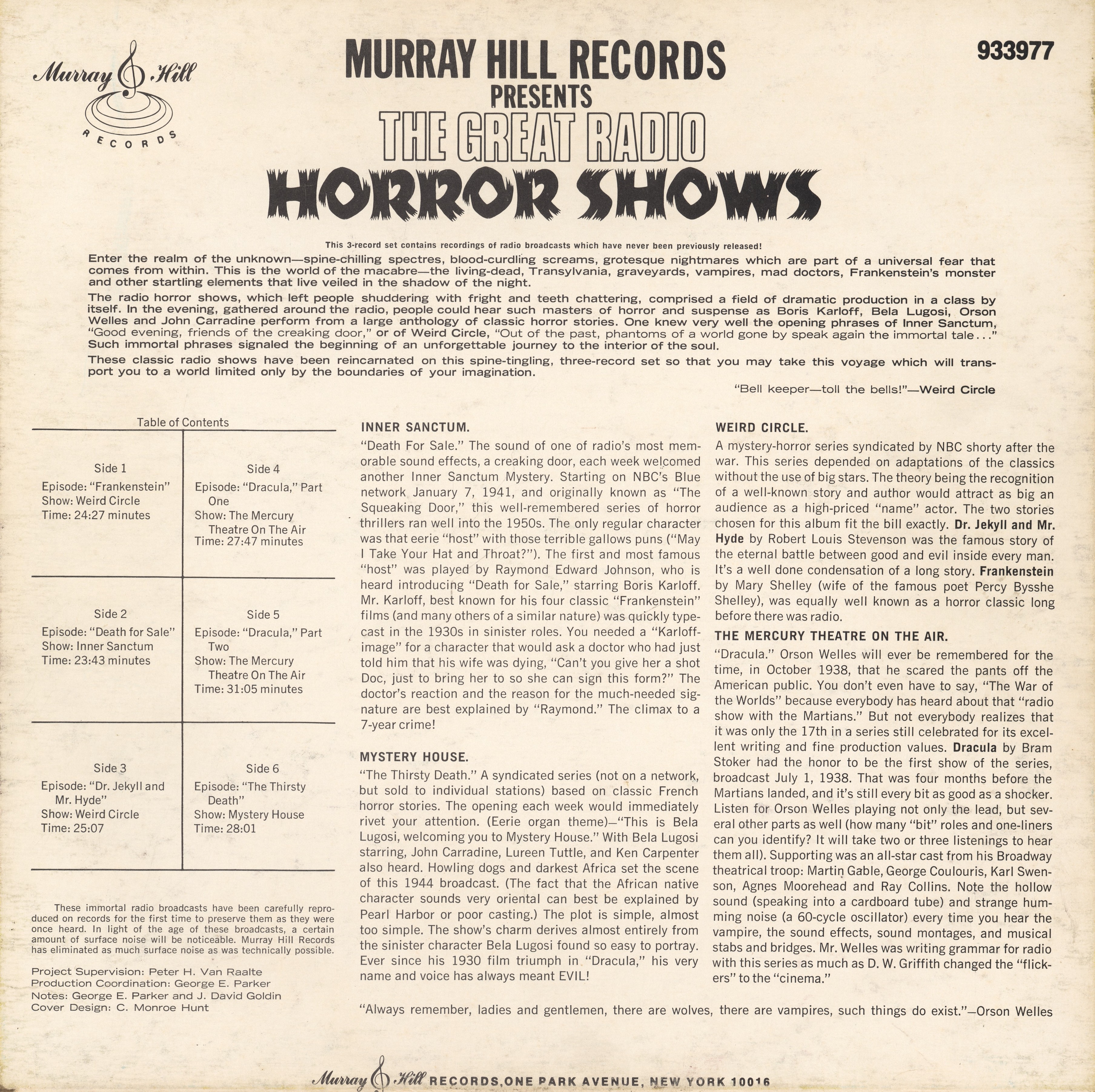 The episodes include extracts from Mary Shelley’s Frankenstein, Robert Louis Stevenson’s Dr. Jekyll and Mr. Hyde, and Bram Stoke’s Dracula, and feature the voice talents of Boris Karloff, Raymond Edward Jackson, Agnes Moorehead, Orson Welles, and John Carradine, among others.