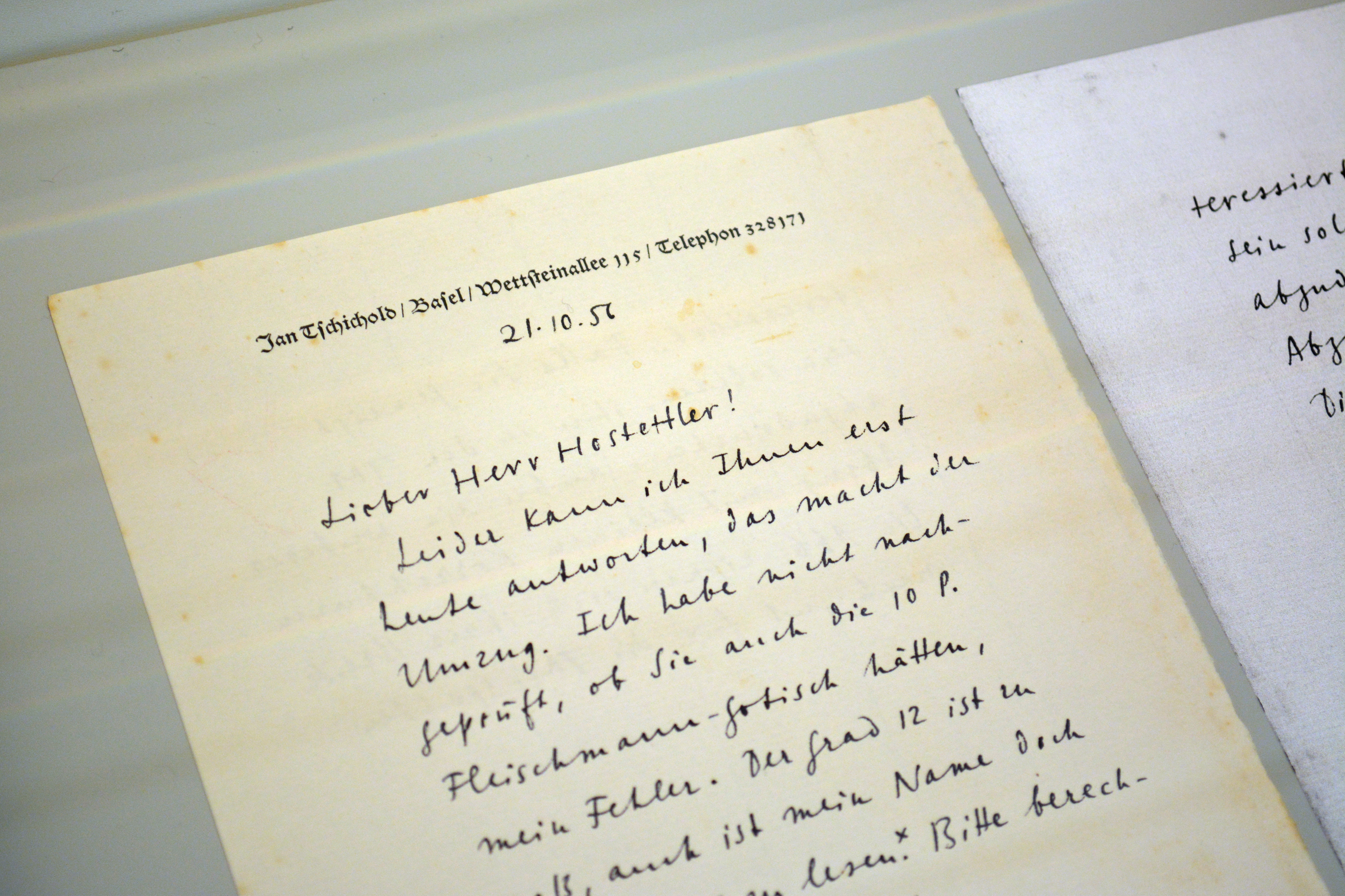I was surprised to see that in the mid-1950s, Jan Tschichold used Alte Schwabacher as the typeface for his personal letterhead. This letter from October 1956 is addressed to Rudolf Hostettler. The year before, Tschichold moved back to Basel to work for Hoffmann-La Roche.