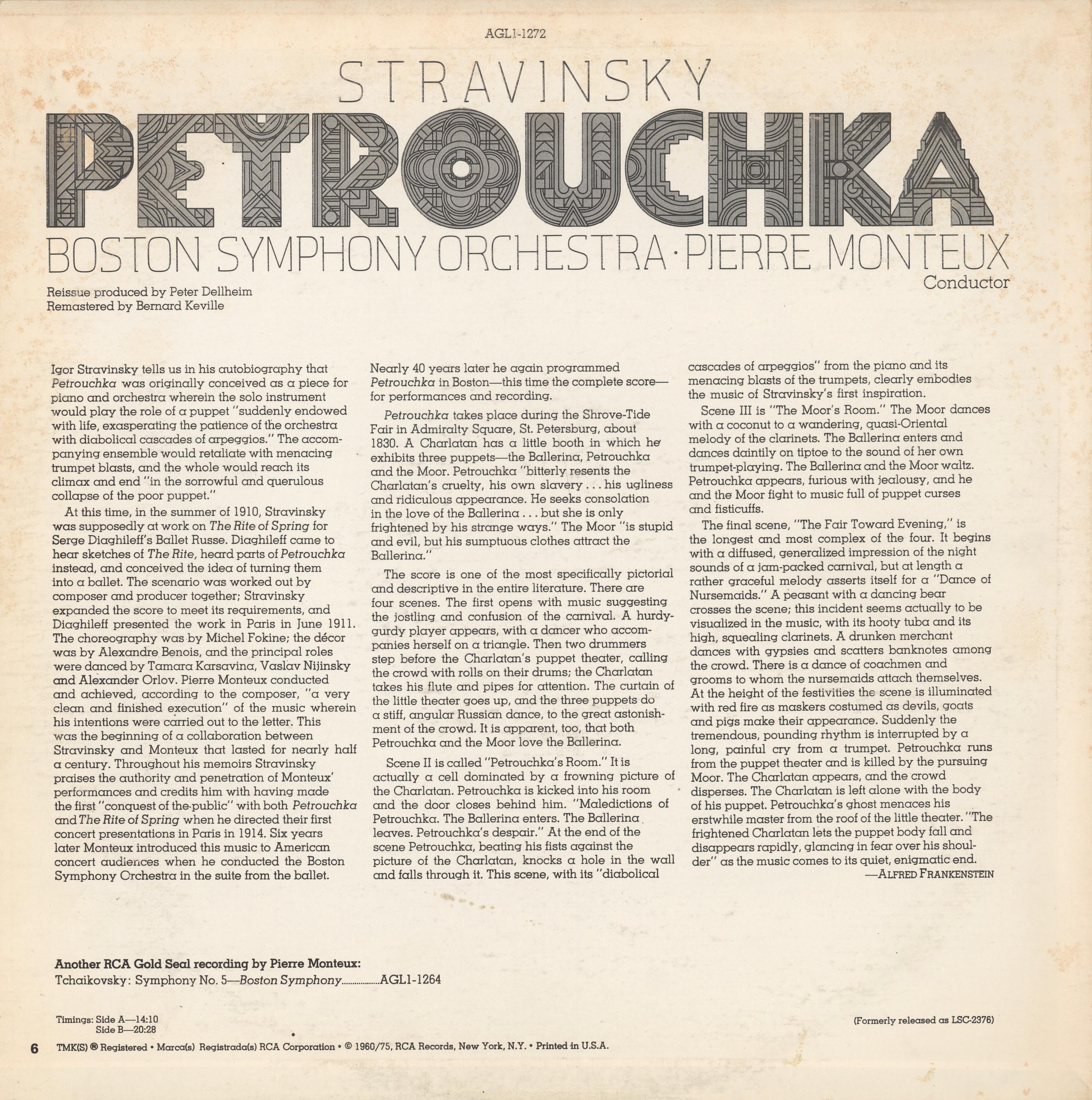 Boston Symphony Orchestra – Petrouchka by Igor Stravinsky album art Contributed by Florian Hardwig on Feb 11th, 2024. Artwork published in 1975. Source: archive.org Internet Archive. License: All Rights Reserved. This performance of Stravinsky’s Petrouchka by the Boston Symphony Orchestra with conductor Pierre Monteux was recorded in January 1959 and originally released in 1960. For RCA’s 1975 reissue, the uncredited designer combined the heavily decorated Green Buzzard D with Aquarius 2, the lightest style of Ronald Arnholm’s semi-slab. [More info on Discogs] Source: archive.org Internet Archive. License: All Rights Reserved. Back cover with liner notes by Alfred Frankenstein set in Memphis. Source: archive.org Internet Archive. License: All Rights Reserved. Detail Typefaces More about Green BuzzardMore about AquariusGet AquariusMore about MemphisGet Memphis Formats Album Art (4306) Topics Music (6455) Designers/Agencies unknown (4275) Tagged withIgor Stravinsky (4)Boston Symphony Orchestra (2)Pierre Monteux (1)classical music (286)RCA Records (145)album records (2872)vinyl records (3412)back covers (2321)liner notes (182)Alfred Frankenstein (1) Artwork location United States (10069) New York City (2978) In SetsPhoto-Lettering, Inc. (Florian Hardwig) (631)New Music (Joe Shriner) (34) Post a comment Name Email – will not be published Website Your response Submit Comment More Green Buzzard in use Mongo Santamaria – Mongo’s Way album art1971Stanisław ZagórskiContributed by Florian Hardwig Glen Campbell – The Glen Campbell Album album art1973unknownContributed by Florian Hardwig Three Tough Guys movie poster1974Charles MollContributed by Patrick Concannon Sponsor More in Music Ravshana Kurkova – “Забота”2020Kirill GluschenkoContributed by Threedotstype 1969 Newport Jazz Festival Poster1969unknownContributed by Stephen Coles Gilles Marchal, “Pauvre Buddy River” sheet music or poster1970unknownContributed by Matthijs Sluiter Global Relations – Global World Wide Web Party2020Hugo MutContributed by Hugo Mut Staff Pick More in Album Art Suzie Soprano – “Pop Out” single coverc. 2020Julian GrönbergSimbayu StudiosContributed by Julian Grönberg Peter Covent – The Happy Sound of Peter Coventalbum art1971Klaus WittContributed by Florian Hardwig The Beach Boys – Today! album art1965unknownContributed by Robby Rhodes Eddie Floyd – Soul Street album art1974The Stax OrganizationContributed by Florian Hardwig Staff Pick More Fonts In Use The Exorcist (1973) movie posters1973Bill GoldDan PerriContributed by Patrick Concannon Staff Pick Tulipes posters, Jardin botanique Genèvec. 1979Line GuibentifSaskia Pernin-WikströmSuzanne Van HoveContributed by Mathieu Christe Staff Pick “Dylan” poster1967Milton GlaserBob CatoContributed by Florian Hardwig Staff Pick La Voz de Almería2013Cases i AssociatsContributed by TypeTogether Staff Pick