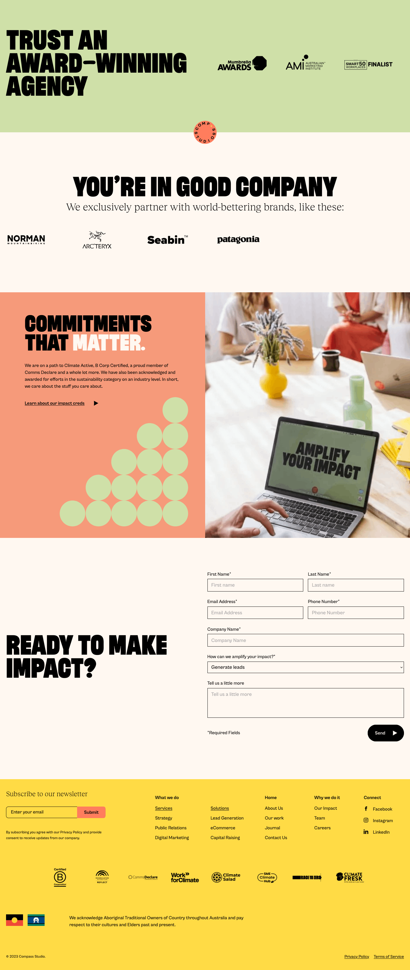 Compass Studio visual identity Contributed by Art Grootfontein on Nov 13th, 2023. Artwork published in 2023. Compass Studio. License: All Rights Reserved. Compass Studio is a digital marketing agency based in Barangaroo, Australia. TMRRW Studio was in charge of creating their new visual identity. They used Flexible as main typeface for their communication, in addition to Reckless Neue for the subheadings and Cabinet Grotesk for the body copy. Compass Studio. License: All Rights Reserved. Compass Studio. License: All Rights Reserved. Compass Studio. License: All Rights Reserved. Compass Studio. License: All Rights Reserved. Compass Studio. License: All Rights Reserved. Source: www.compass-studio.com Compass Studio. License: All Rights Reserved. Homepage (top) Source: www.compass-studio.com Compass Studio. License: All Rights Reserved. Homepage (bottom) Typefaces More about FlexibleGet FlexibleMore about Reckless NeueGet Reckless NeueMore about Cabinet GroteskGet Cabinet Grotesk Formats Web (5522) Branding/Identity (8298) Topics Services (1528) Designers/Agencies TMRWW Studio (1) Tagged withPR/marketing agencies (54)identities (2292)typeface combinations (3839)all caps (7409)underlined (733)glyphs substituted by images (111)social media (1050)quotes (521)business cards (1508)bottles (455)passes (52)posters (1389)variable fonts (204)web forms (53)web footers (92) Artwork location Australia (639) In Setsbb (Leonardo de la Fuente) (1305) Post a comment Name Email – will not be published Website Your response Submit Comment More Flexible in use Le Figurant by Éric Chassé2024Dorian DanielsenContributed by Art Grootfontein Newington table packaging2022Invisible CreatureContributed by Art Grootfontein À la recherche d’Alex P. by Carole Dionc. 2022Dorian DanielsenContributed by Art Grootfontein Sponsor More in Services Population Foundation of Indiac. 2020Lopez DesignContributed by Sharp Type Umbel2024Signal Type FoundryPost StudioContributed by Max Phillips villeville.co2025Ville KansanenContributed by Jonas Pelzer Phœnix Insurance Co. letterhead1870Oscar H. HarpelContributed by Stephen Coles More in Branding/Identity GSKc. 2020Wolff OlinsContributed by F37® Foodhallen2018CodeamContributed by Gareth Hague Korea International Art Fair 20212021Studio fntContributed by Rutherford Craze Staff Pick Anoma2022Studio FableContributed by Sakshi Jalan More Fonts In Use Cinemaissí Film Festival 20222022Pol Solsona StudioContributed by Playtype Foundry Staff Pick Bibelen, Det Norske Bibelselskapc. 2024MolbergerContributed by Smuss Studio Staff Pick The Whitsun Weddings, Faber & Faber edition1964Berthold WolpeContributed by Stephen Coles Staff Pick Shotview website (2017)2017YESContributed by Love Lagerkvist Staff Pick