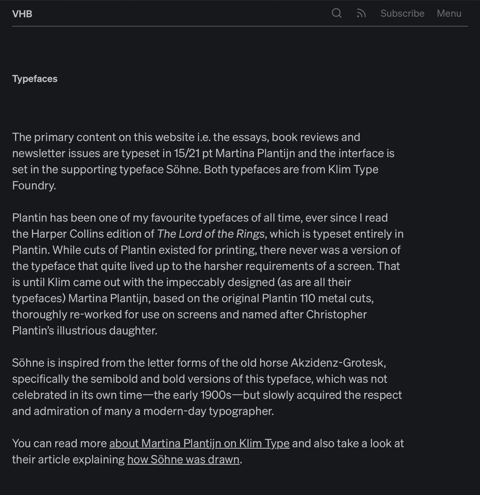 Long passages of text are set in Martina Plantijn making for easy, effortless reading on all screen sizes while Söhne, for the most part, handles the interface elements. Both typefaces disappear just enough so that they add to the design without overpowering the content, a characteristic that is admirable in any typeface and much more so while being used on a website that is so text-heavy.