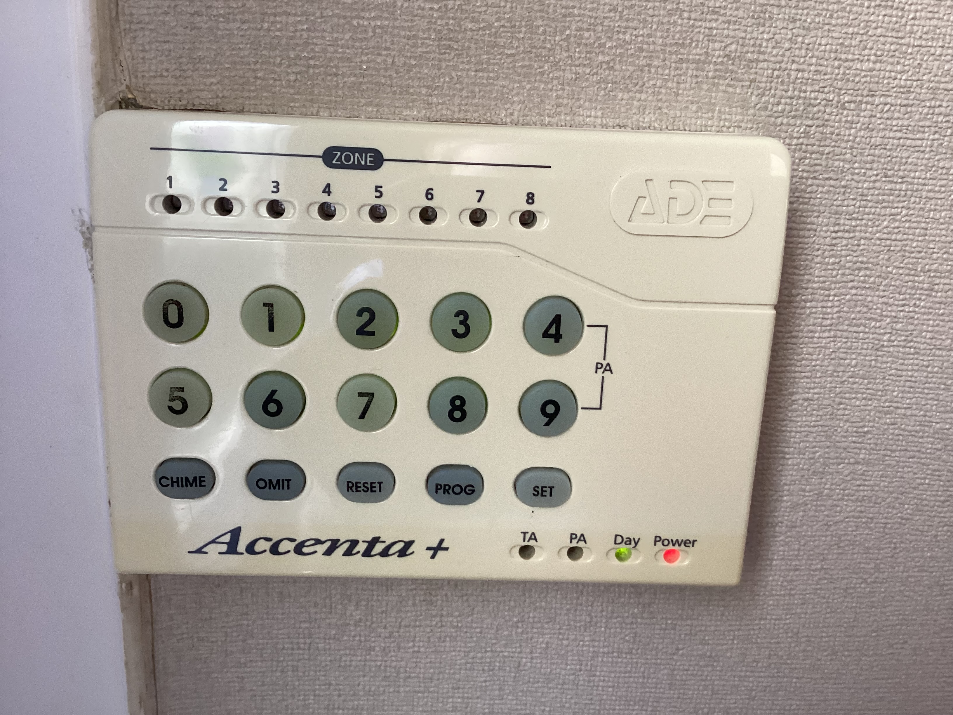 The Accenta is an alarm system first developed by Honeywell in the early 2000s. The Accenta+ ADE model shown here uses ITC Avant Garde Gothic for the buttons and Frutiger for the labels. “ADE” is based on Stop, while the Accenta+ logo appears to be Janson Text Bold Italic, stretched and further slanted.