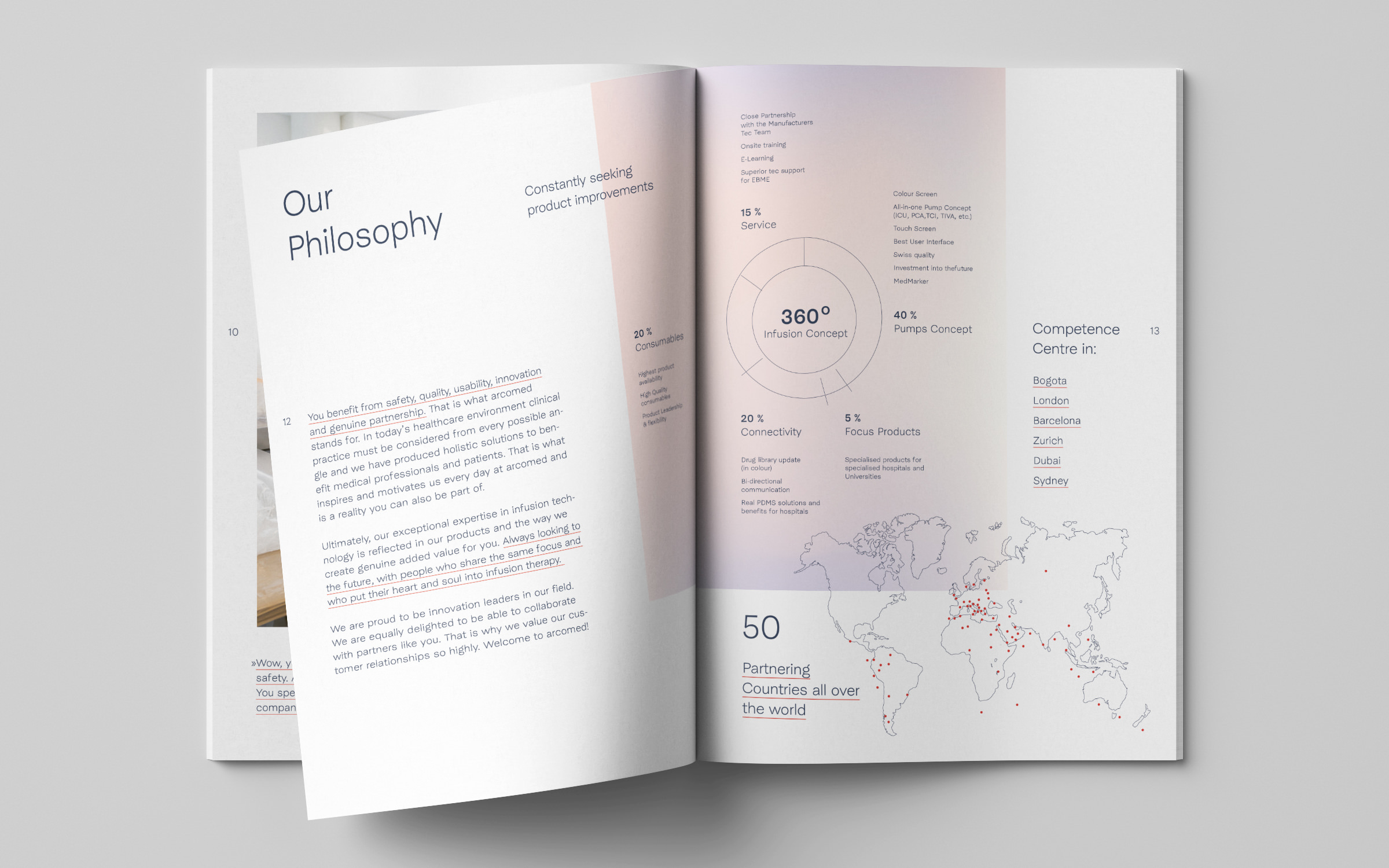 The typographic basis of the redesign is formed by the two fonts McQueen Grotesk Light and Medium, designed by Loris Olivier, Noheul Lee and Katja Schimmel. They ensure a light, unmistakable appearance both in printed material and on the website. The fonts support around 100 languages, which is very much in line with Arcomed’s international aspirations. Eduard Helmann describes the development of the new corporate design as follows: “When redesigning Arcomed AG, we first sharpened the brand and were then on the lookout for a typeface that had a technical feel, exuded precision and symbolized stability. With McQueen, we found exactly the typeface that expresses this.”