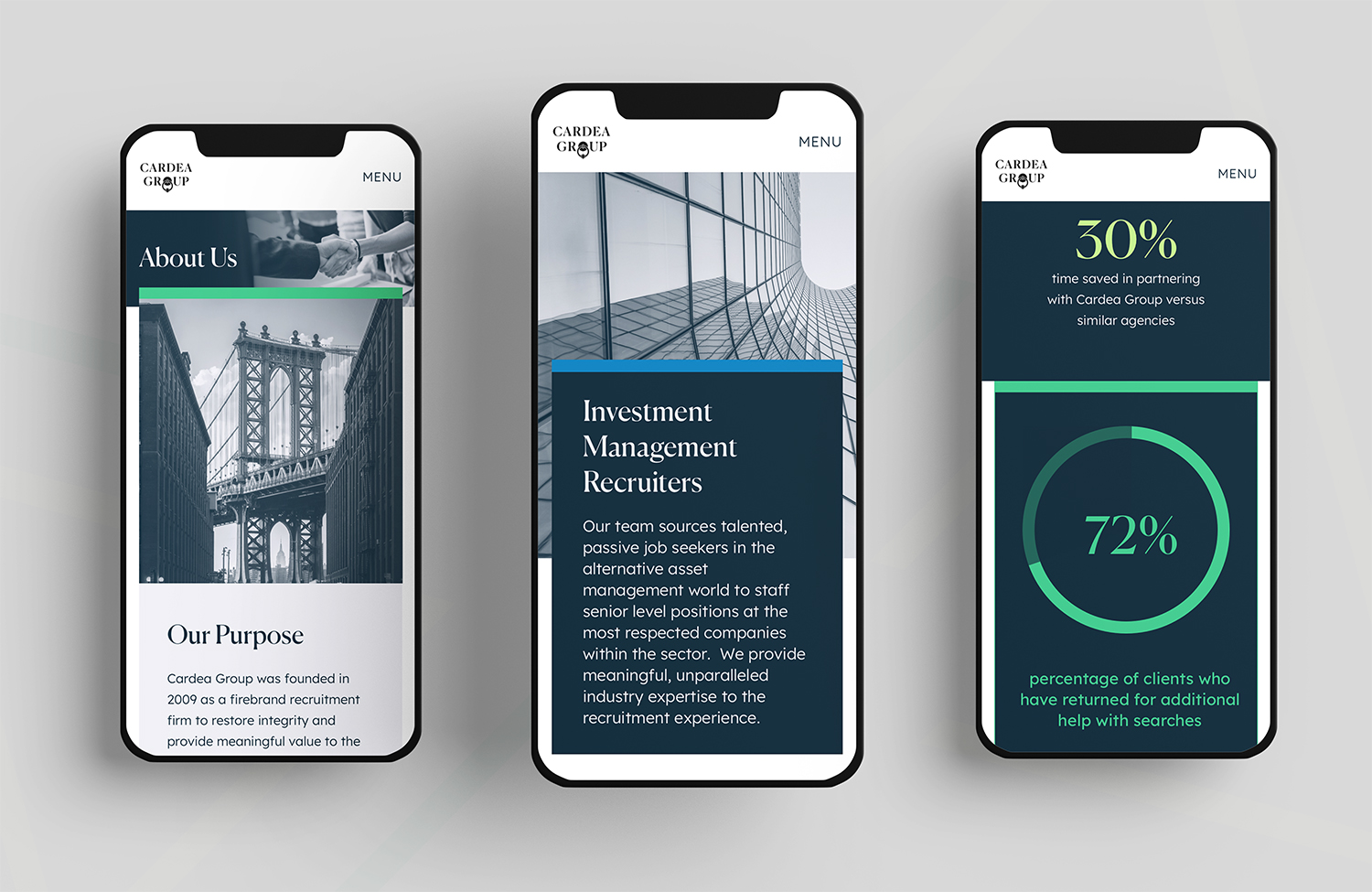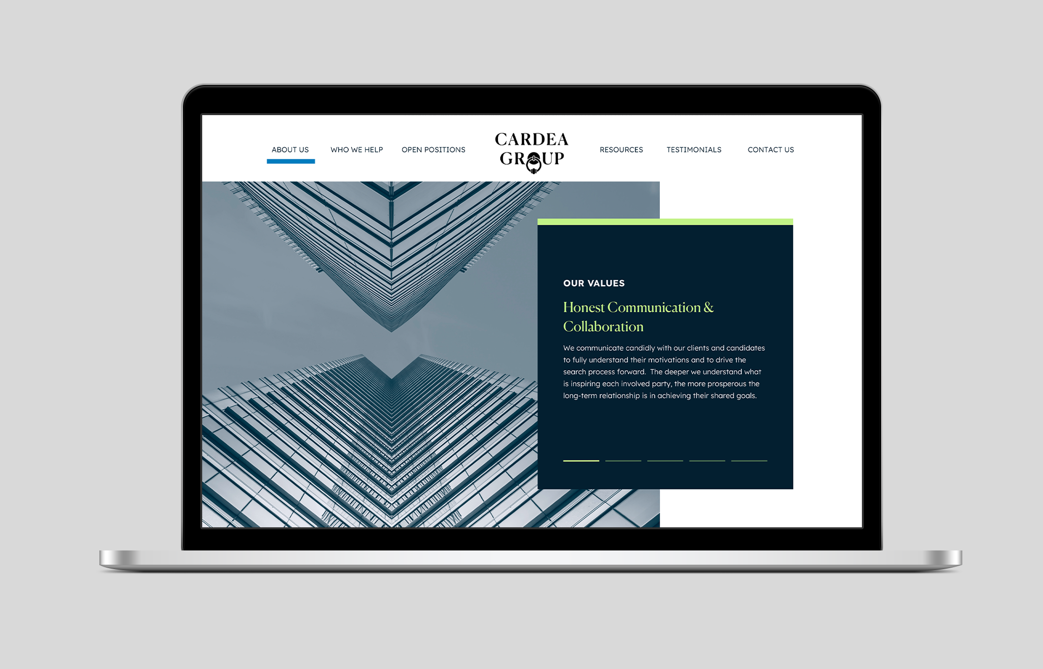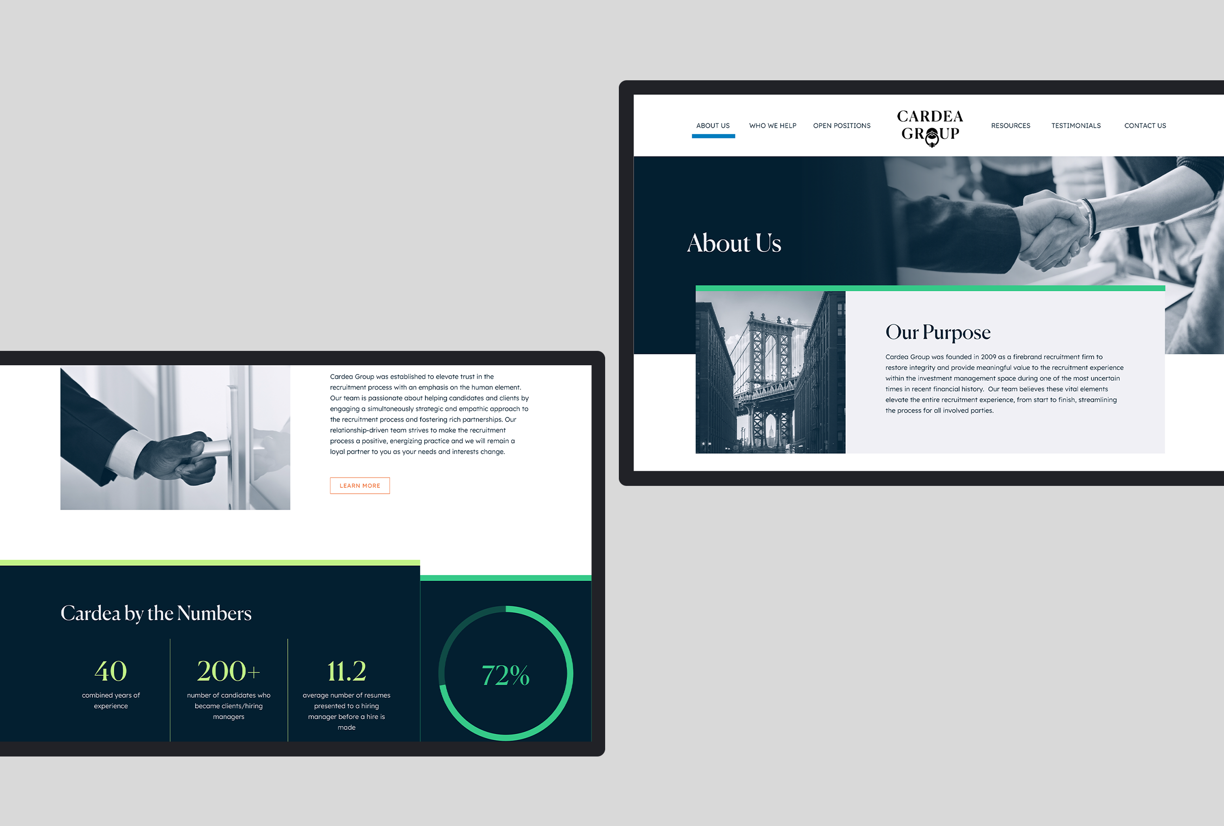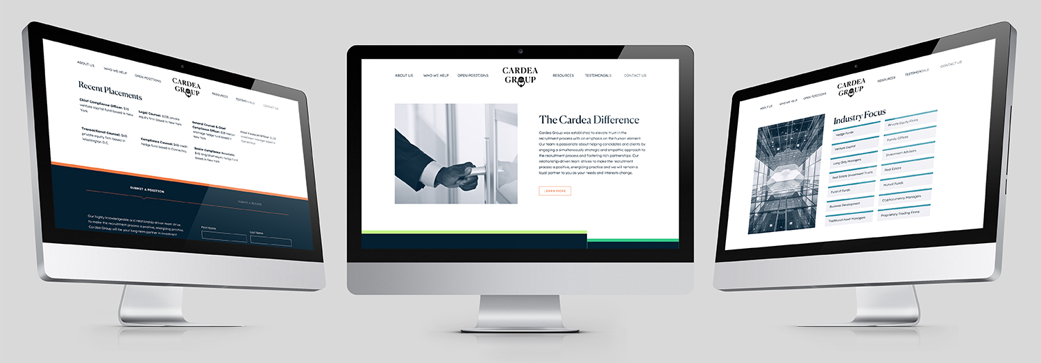 Facing the 2009 job market’s challenges, the Cardea Group emerged to foster connections in the alternative asset management sector. As they sought to update their decade-seasoned brand, we crafted a visual identity that reflects their boutique, innovative nature. Our approach included a modern color palette with cooler tones and warm accents for focus, ensuring ADA compliance and versatility in digital and print formats. The website’s duotone imagery and consistent graphic language enhance brand recognition. The visual identity combines a sophisticated, modern serif font with the rounded door knocker mark of their logo, balancing friendliness with professionalism. This emblem, pragmatic and aesthetically pleasing, anchors their boutique appeal. The website, enriched with animated elements, projects Cardea Group’s polished and successful image.