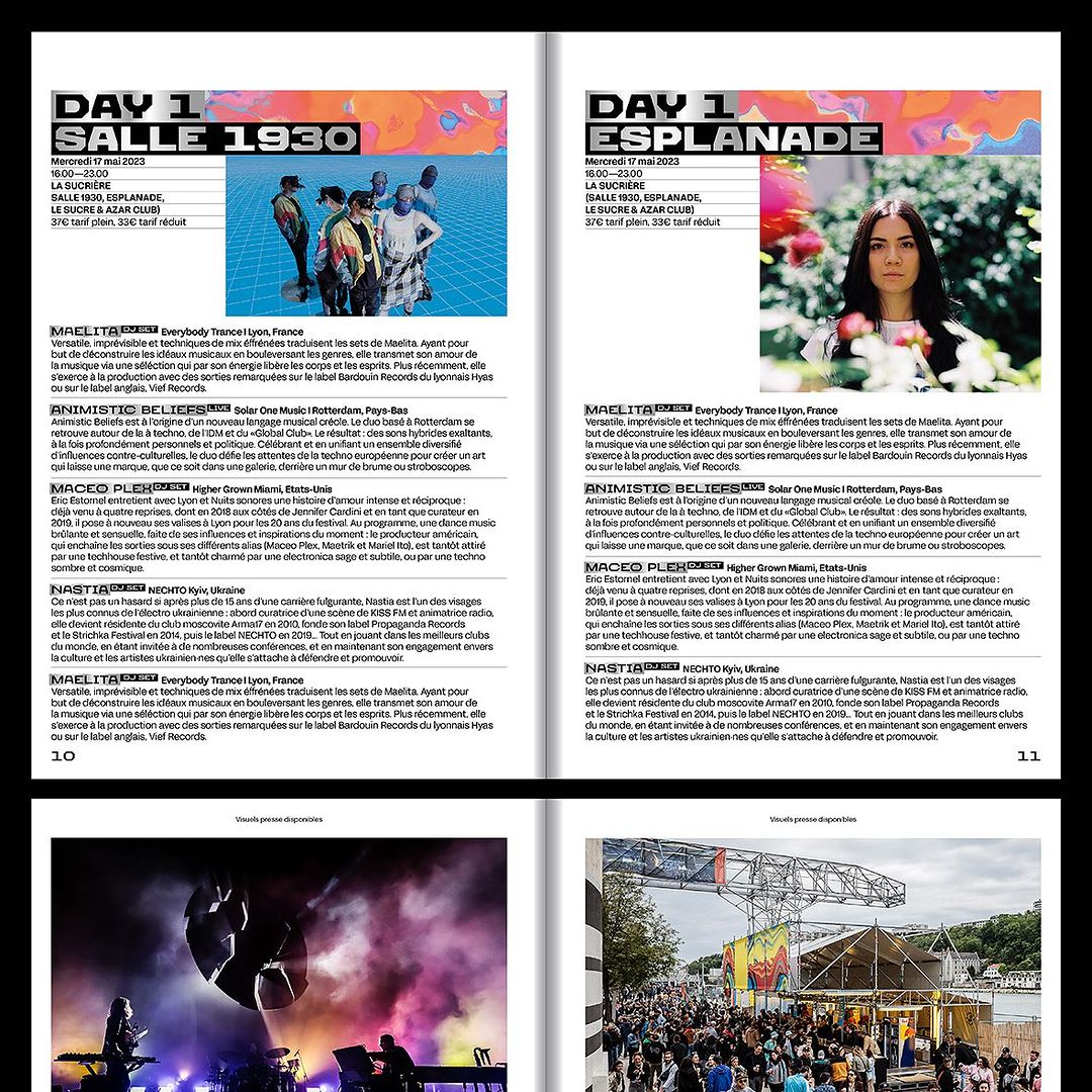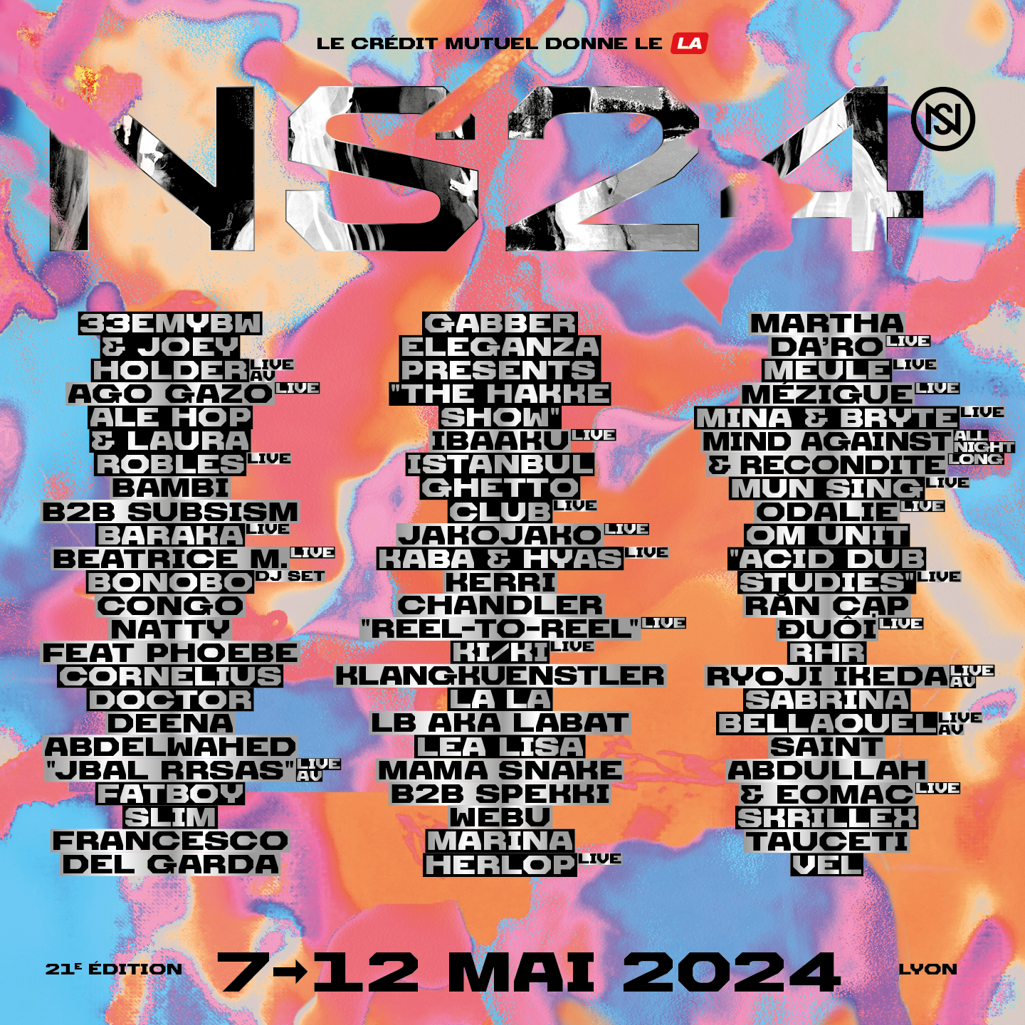 The Nuits sonores, or “Sonic Nights”, are a yearly festival held in Lyon, France. It revolves around electronic music and neighboring genres as much as around visual and performance art. In previous posts, we have featured the typography for the editions of 2011–2013 and of 2023. Every year, the task of developing the visual identity for Nuits sonores is assigned to a different designer or studio.