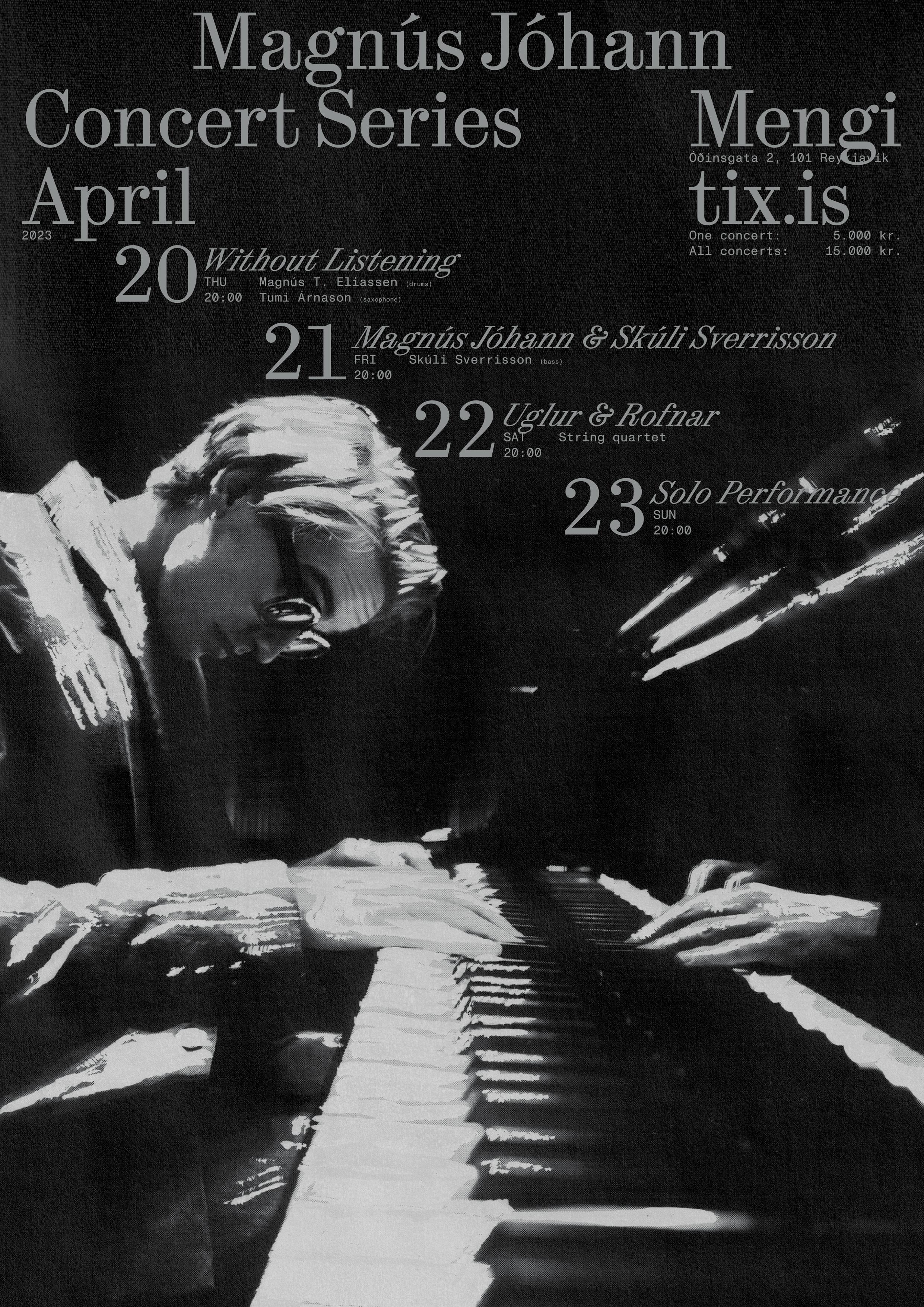Poster and social content for Magnús Jóhann, an Icelandic composer, producer and keyboardist, and his four-nights-in-a-row concert series at Mengi, Reykjavik.