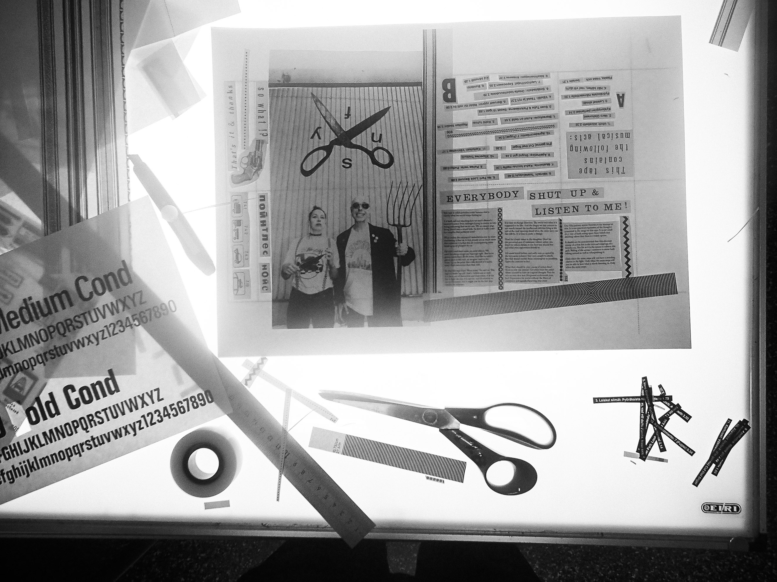 In making the zine I set up a couple of rules for myself: 1. All type (with the exception of the body copy) would be set by hand, meaning it would be cut and pasted, and 2. The tools used would be analogue (with the exception of a concession I made enabling me to use digital cameras when needed), 3. No rulers or other measuring devices would be allowed, everything had to be eyeballed, 4. Fonts would be used to one’s heart’s content and combined without too much thought or prejudice, and finally 5. Everything would be in black and white, because, well, punk is black and white!