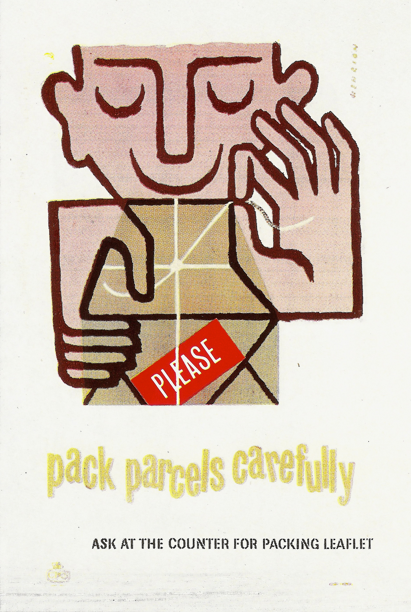 “A fine, bold design by Henrion as part of a common GPO theme of the time – packing parcels carefully. F H K Henrion was one fo the foremost of many German emigres of the 1930s who subsequently based themselves in the UK and did much to further the cause of design and commerical art.” — Mikey Ashworth