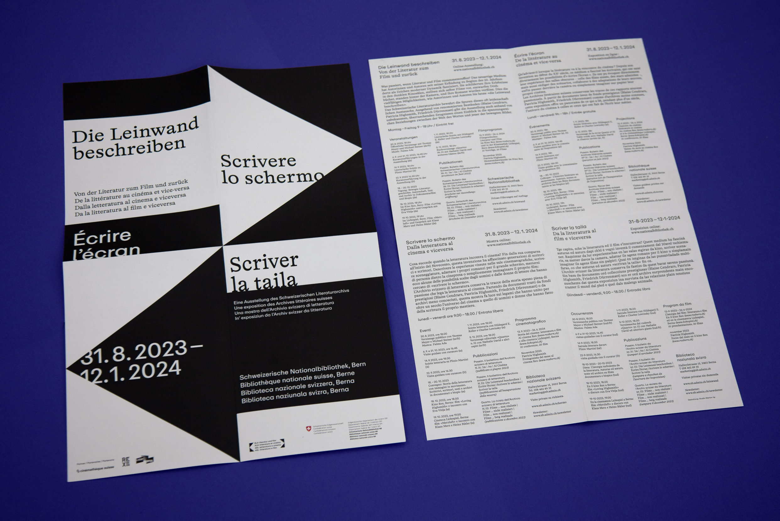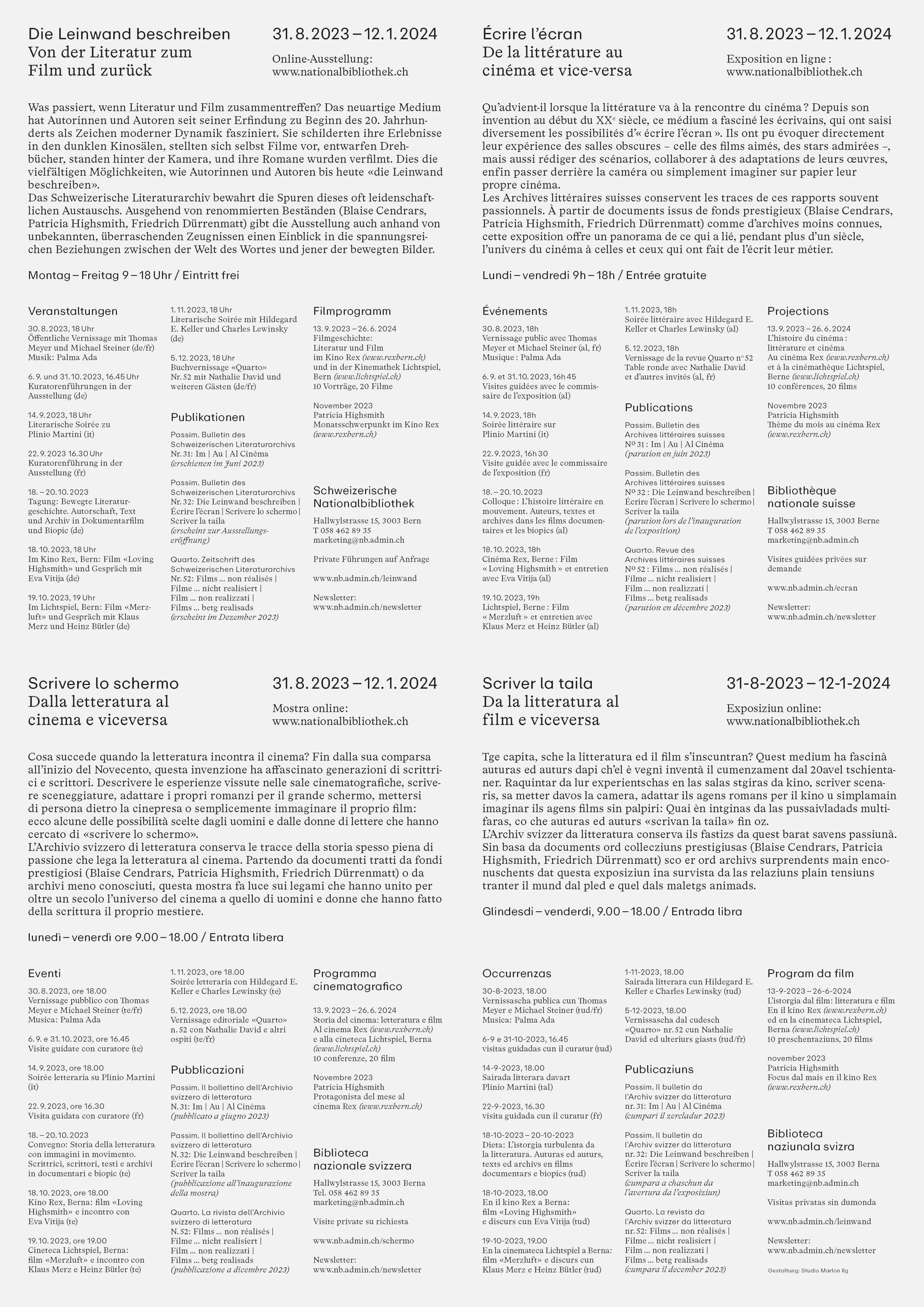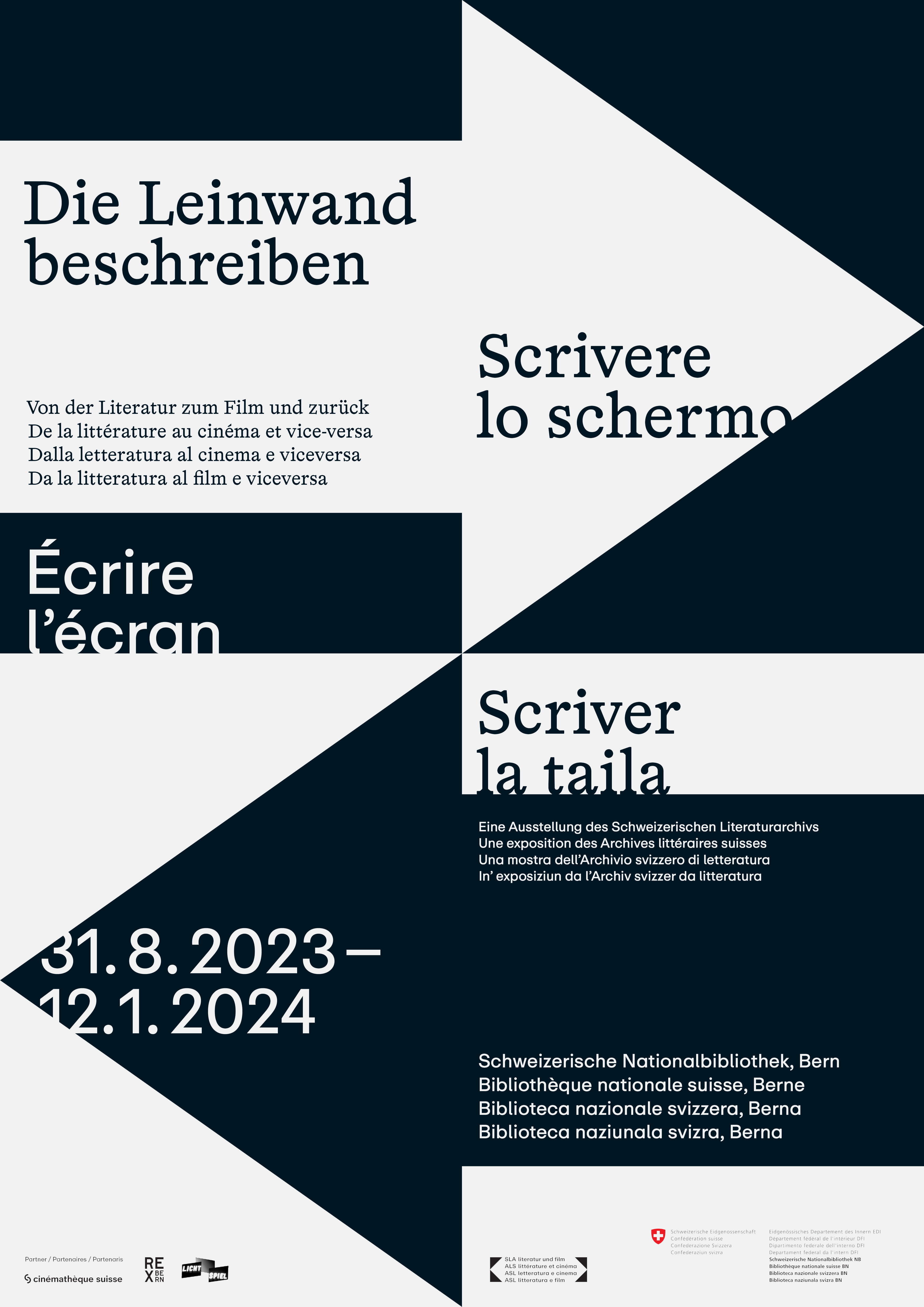 From 31 August 2023 to 12 January 2024 the Swiss National Library in Bern hosted the exhibition Writing the silver screen: from literature to cinema and vice versa (German: Die Leinwand beschreiben: von der Literatur zum Film und zurück).
