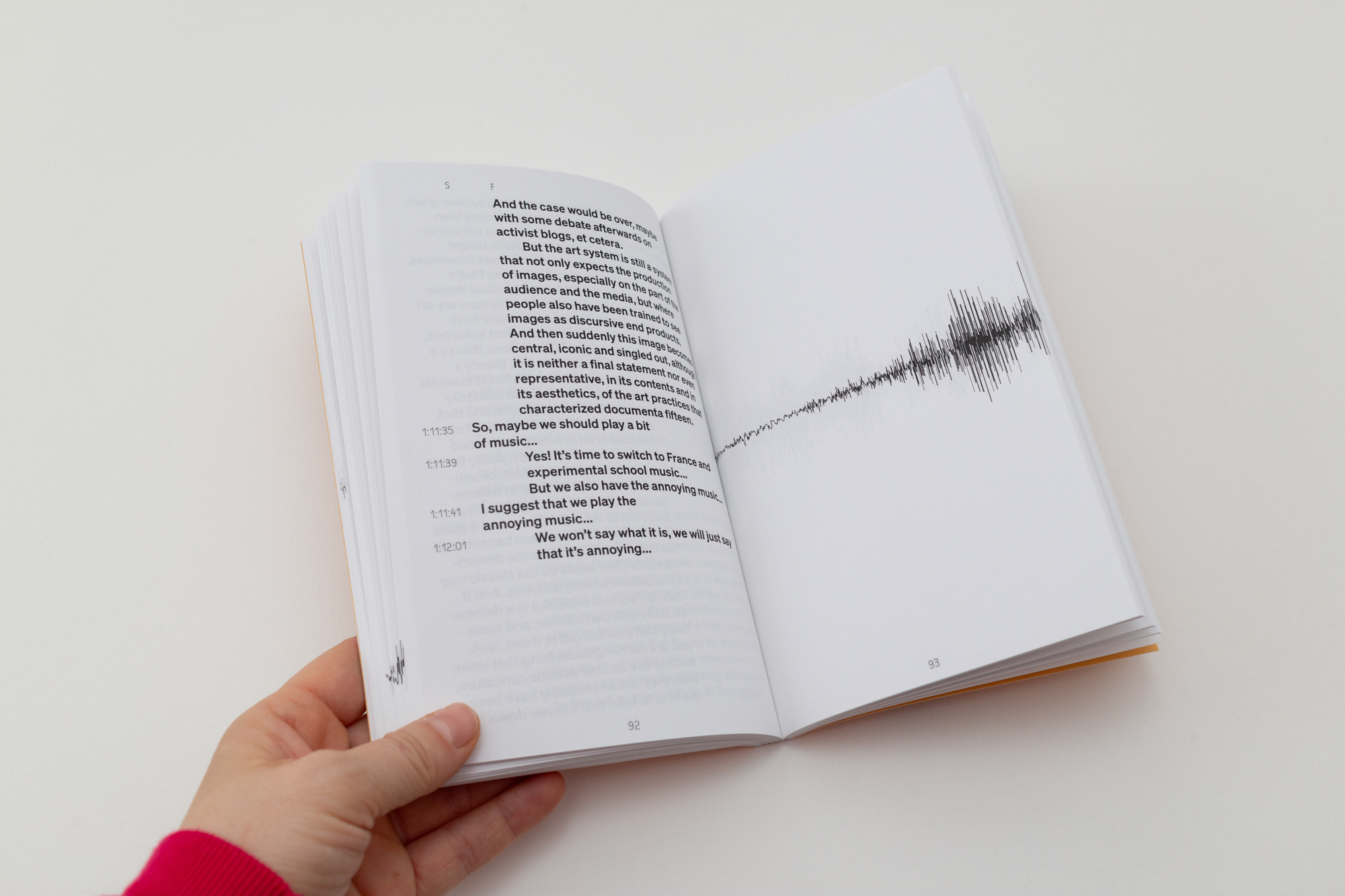 The conversation is a continuous layout, with the headlines mixed in. Pictures are small references and added as an appendix at the back. A simple guidance system for who’s speaking – and the sound waves of the three songs playing, breaking up the layout, visualising the pauses they’ve made in the interview.