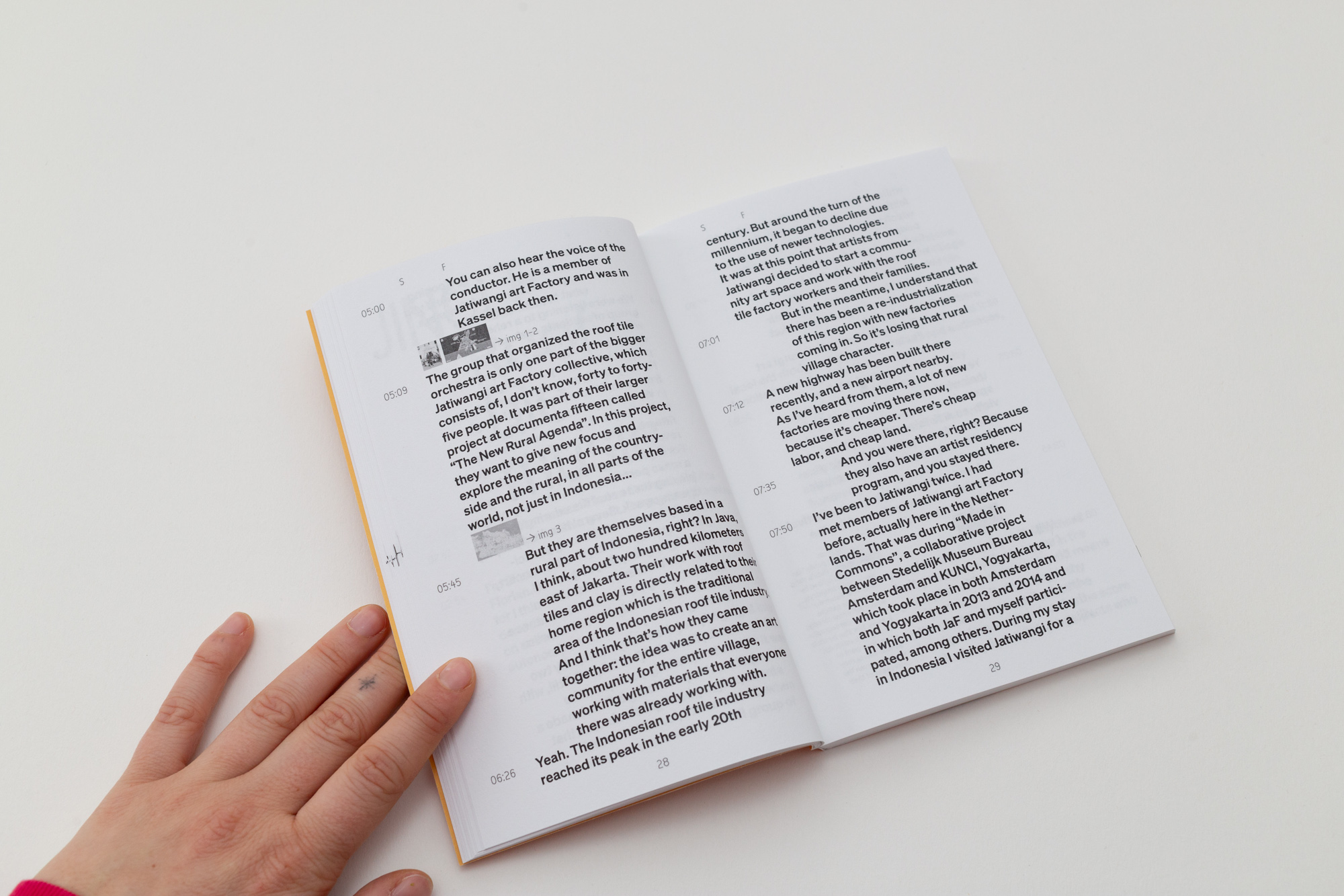 As the publication is based on a transcript of a radio interview, it was important for me to visualise its origins in the layout: an ongoing conversation, with no headlines or images in between, just three pieces of music playing. Only at the very beginning the two speakers introduce themselves, so why show their names every time they talk?