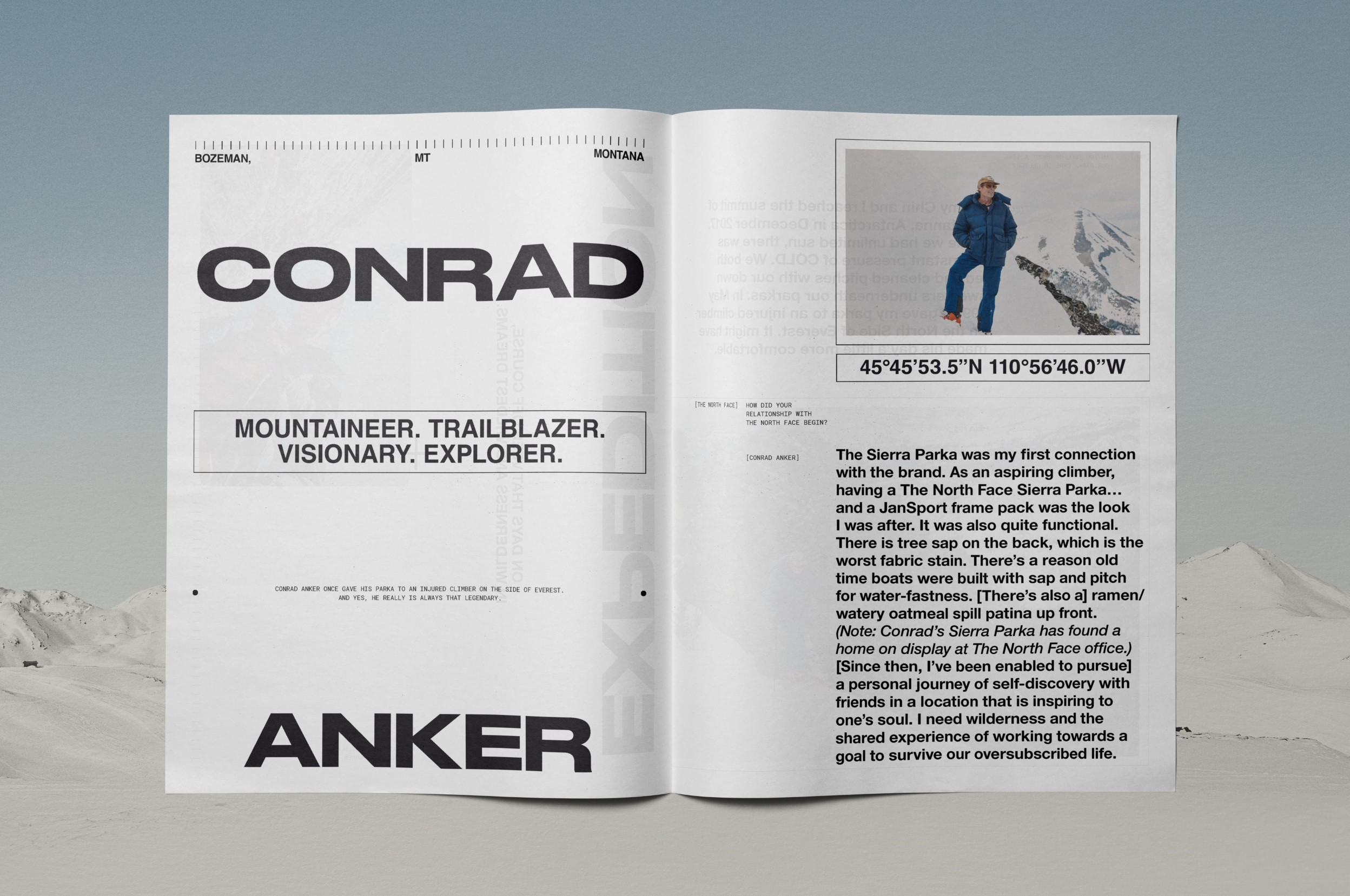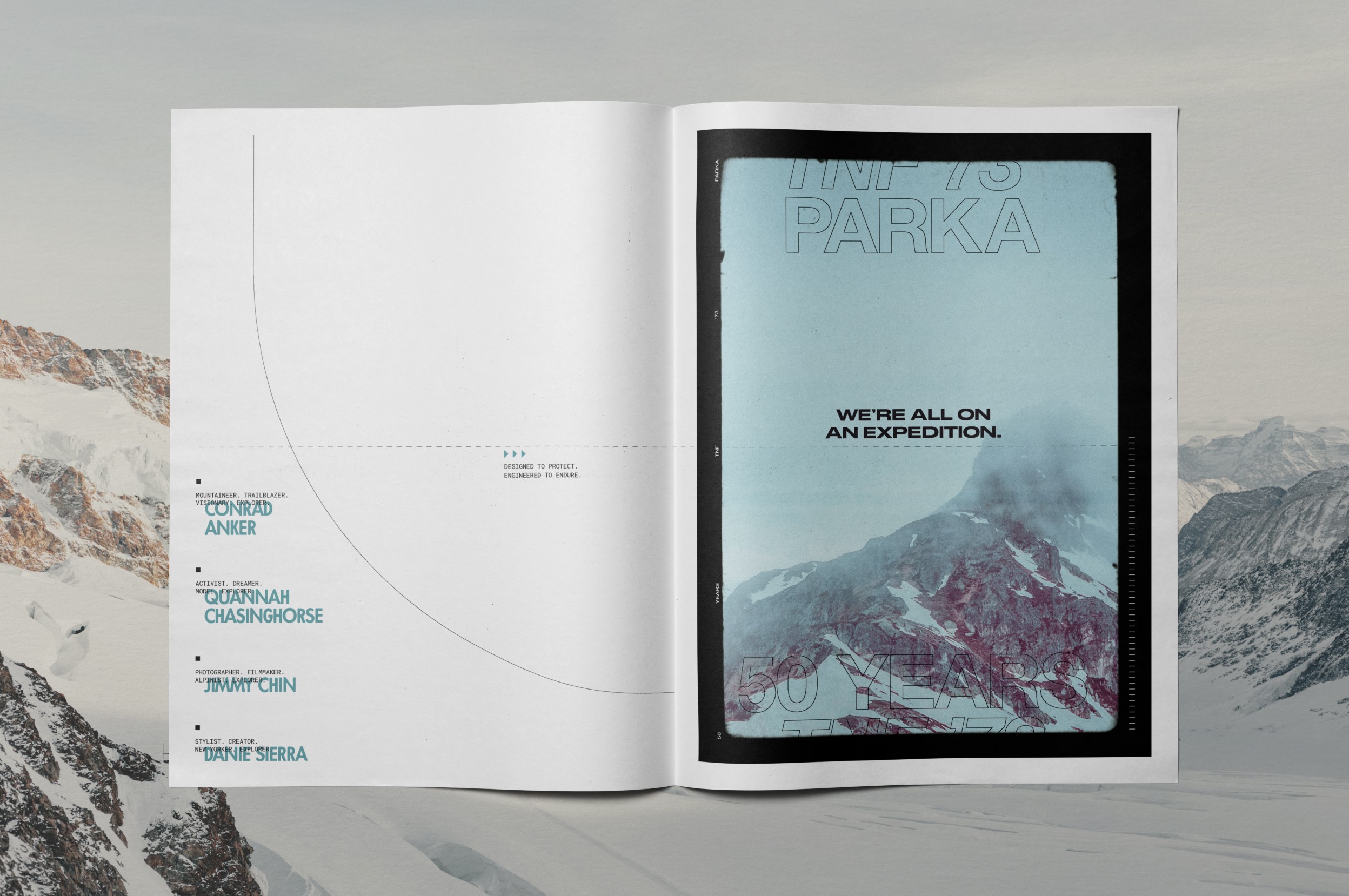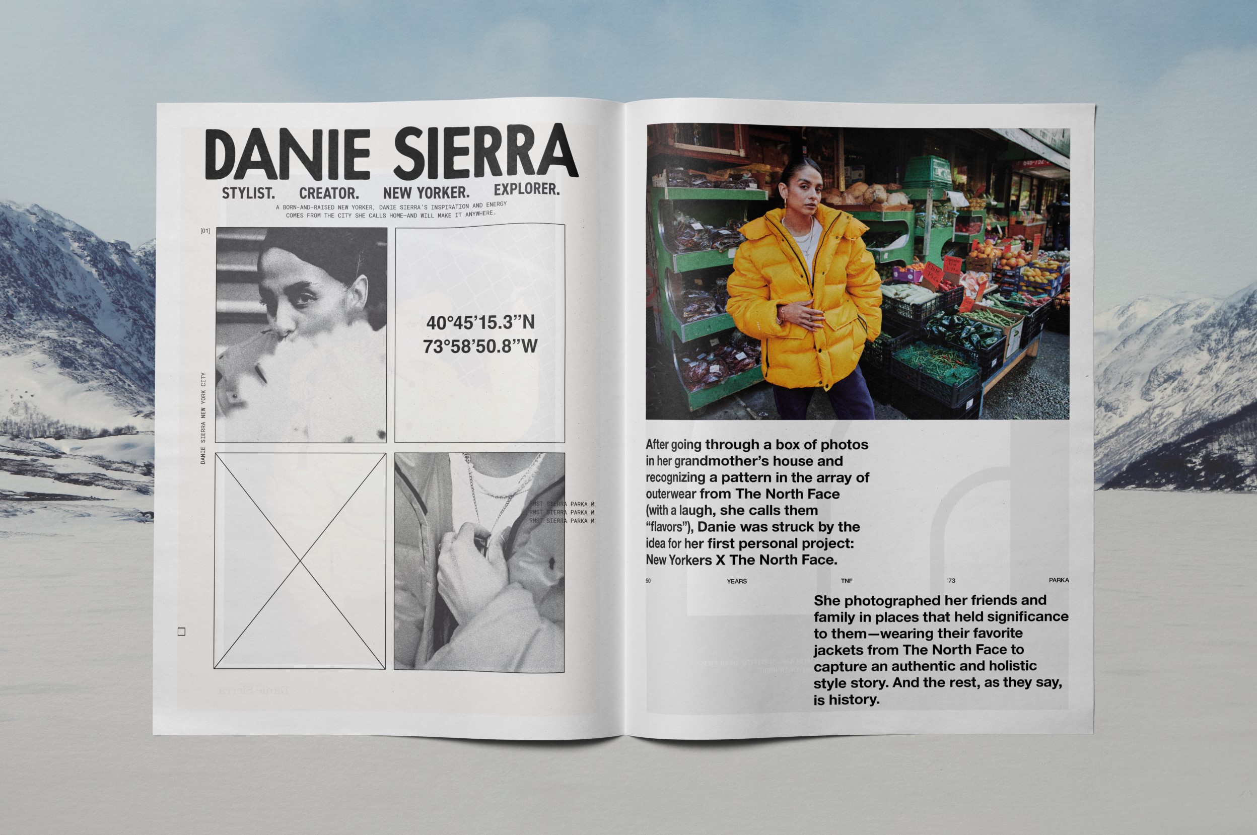 This system enabled us to integrate campaign photography and written interviews with some absolutely incredible people. Conrad Anker and Jimmy Chin recount epic stories of mountaineering, Quannah Chasinghorse shares what The North Face has meant to her in her advocacy and sustainability work, and Danie Sierra’s speaks of the parka’s resonance in urban culture. We had the immense pleasure of laying out their words alongside beautiful photography, from the heights of the Rocky Mountains to the streets of New York.