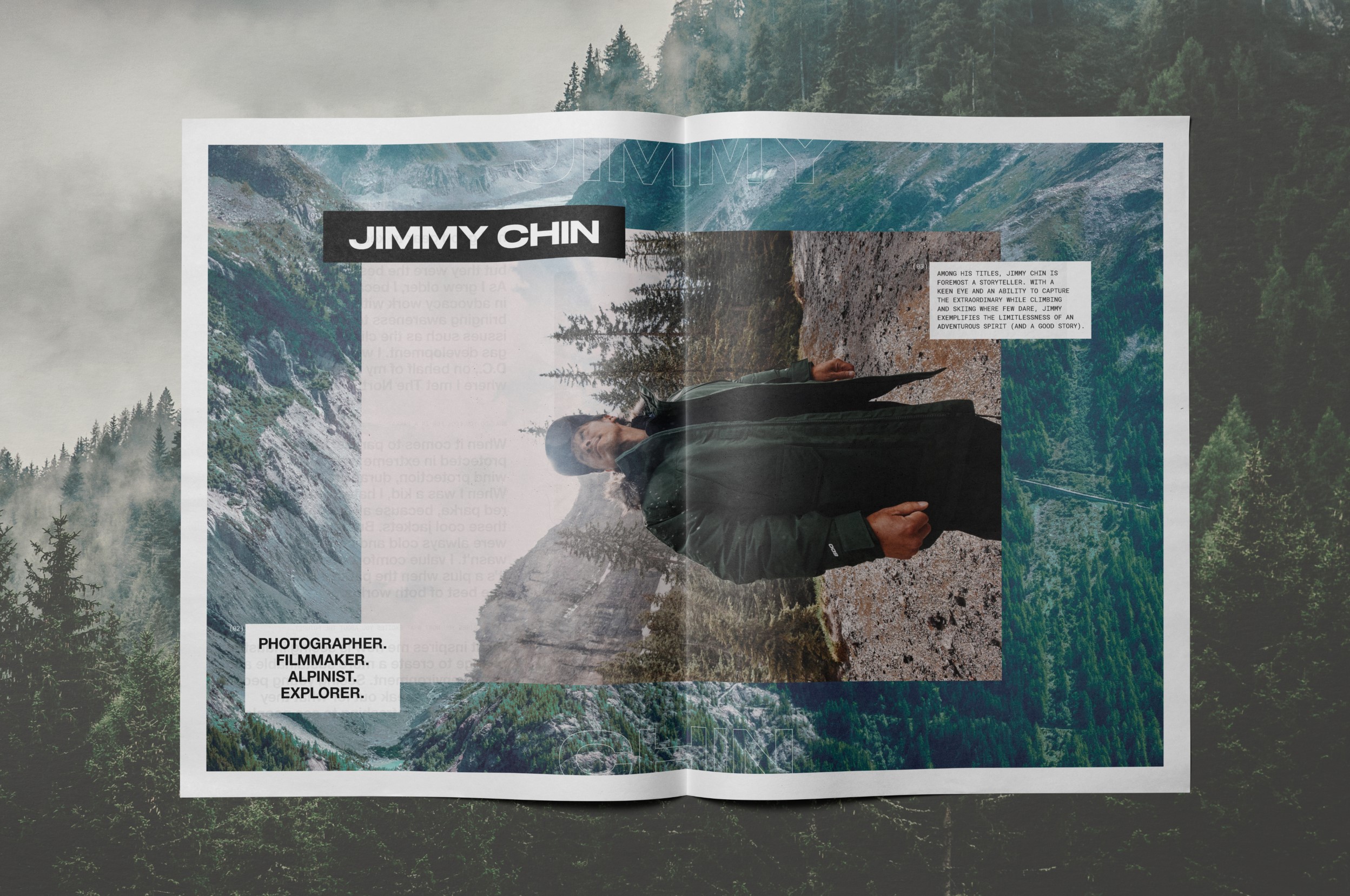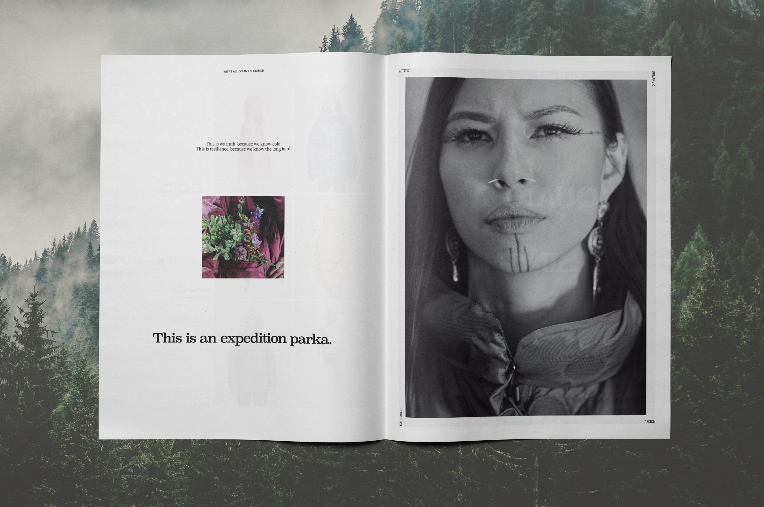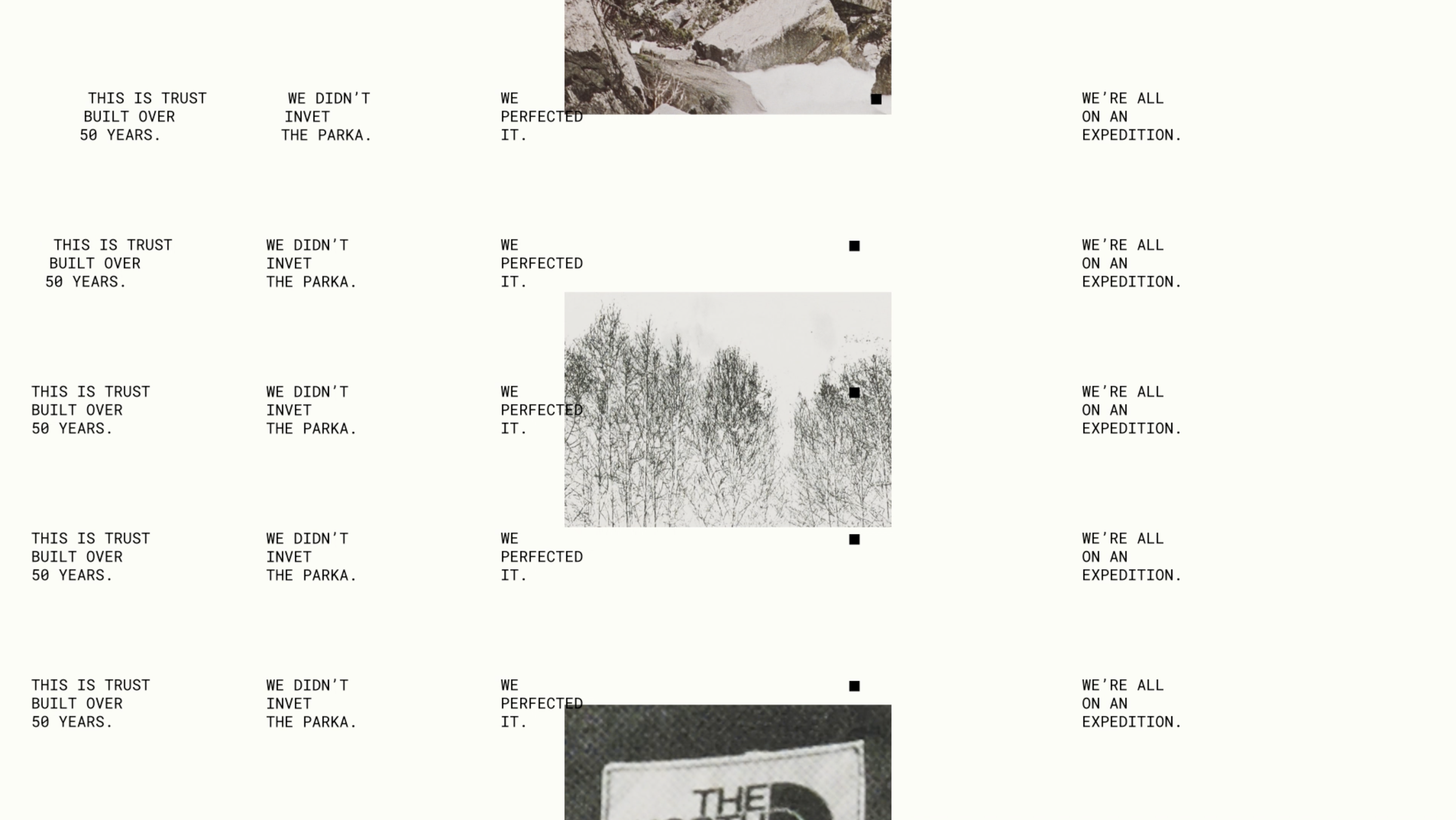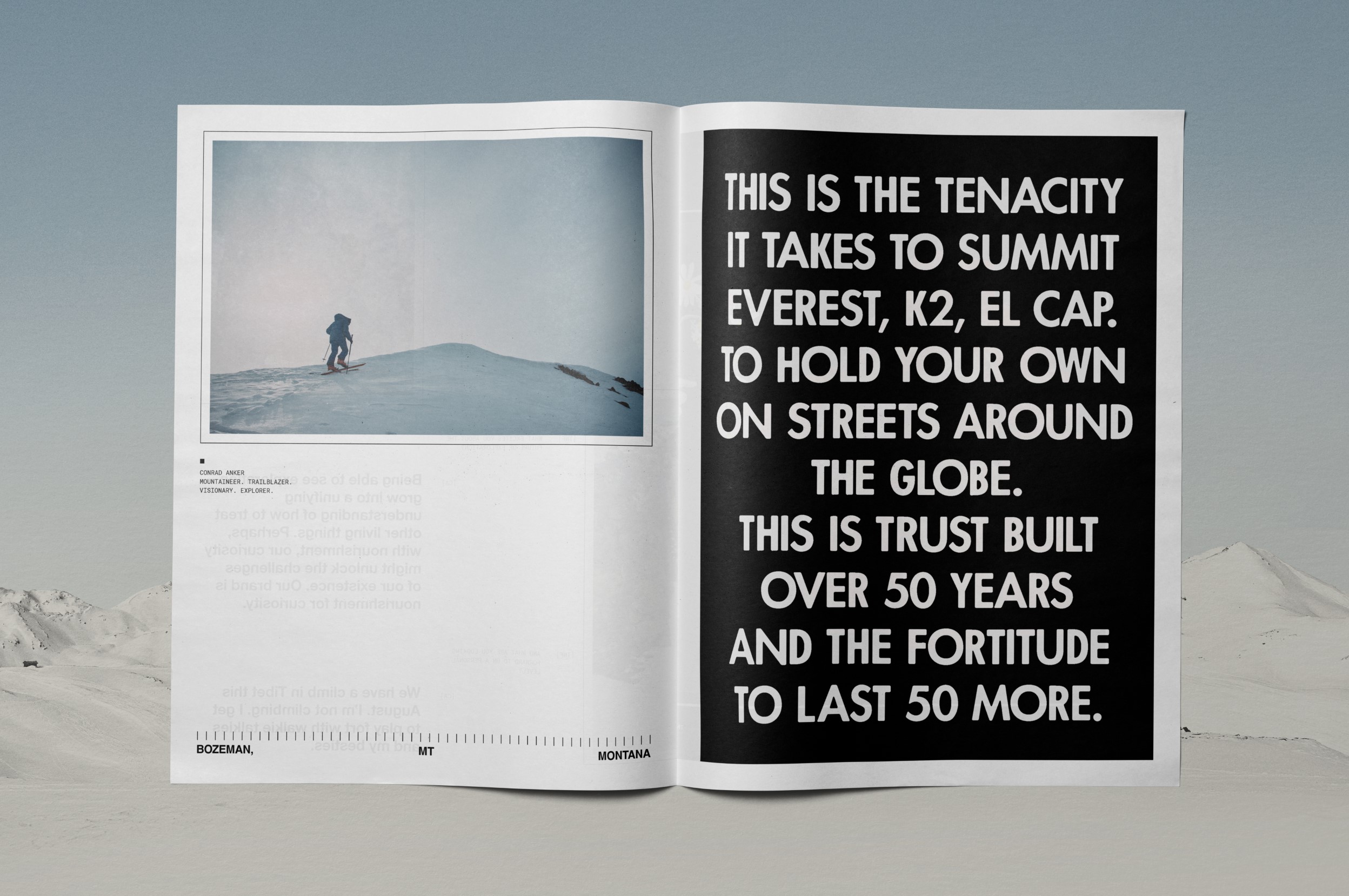 This system enabled us to integrate campaign photography and written interviews with some absolutely incredible people. Conrad Anker and Jimmy Chin recount epic stories of mountaineering, Quannah Chasinghorse shares what The North Face has meant to her in her advocacy and sustainability work, and Danie Sierra’s speaks of the parka’s resonance in urban culture. We had the immense pleasure of laying out their words alongside beautiful photography, from the heights of the Rocky Mountains to the streets of New York.