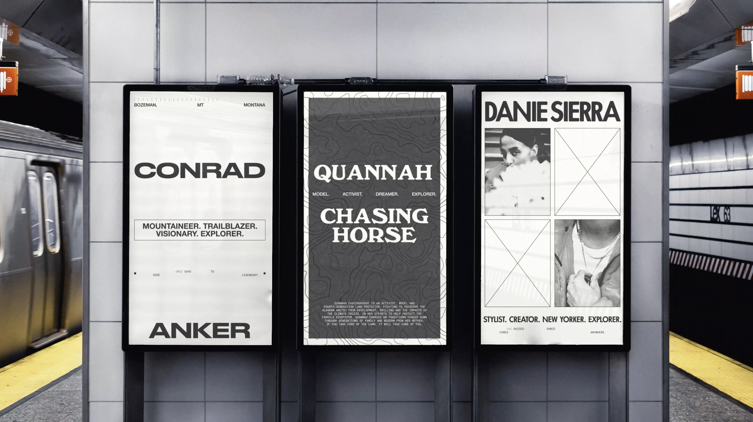 Druk Wide, Futura Passata, and Windsor made for perfect hero typefaces to carry this diverse cast of fascinating ambassadors – ranging from a bit nostalgic to very forward looking. They’re supported by Neue Helvetica and Roboto Mono.