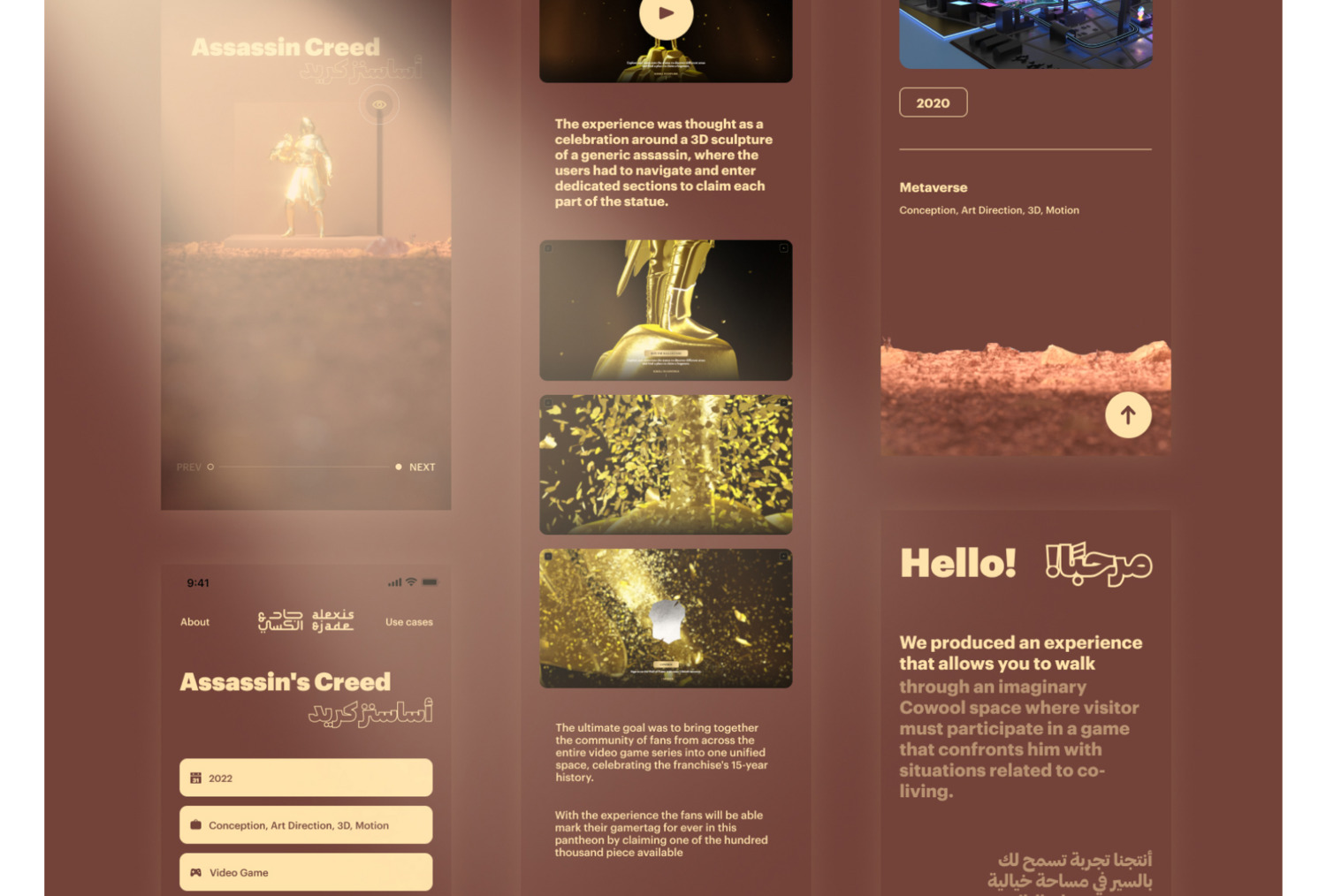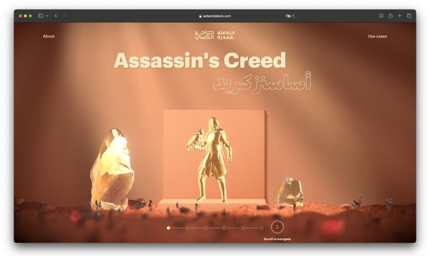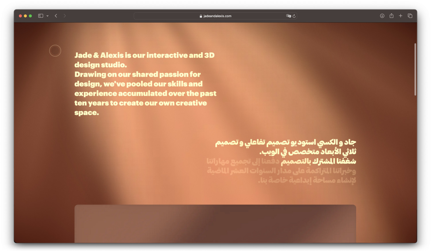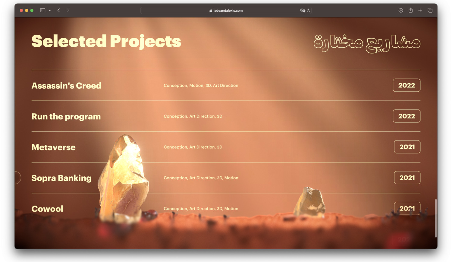 Based in Paris and Dubai, CGI studio Jade and Alexis is engaged in interactive installations, AR, VR, motion design and 3D graphics. In 2021, Jade and Alexis guided a tour around metaverses and they designed a website to celebrate the Assassin’s Creed game’s birthday in 2022 . The studio opted for a concise use of Graphik Arabic from Commercial Type on their own website.