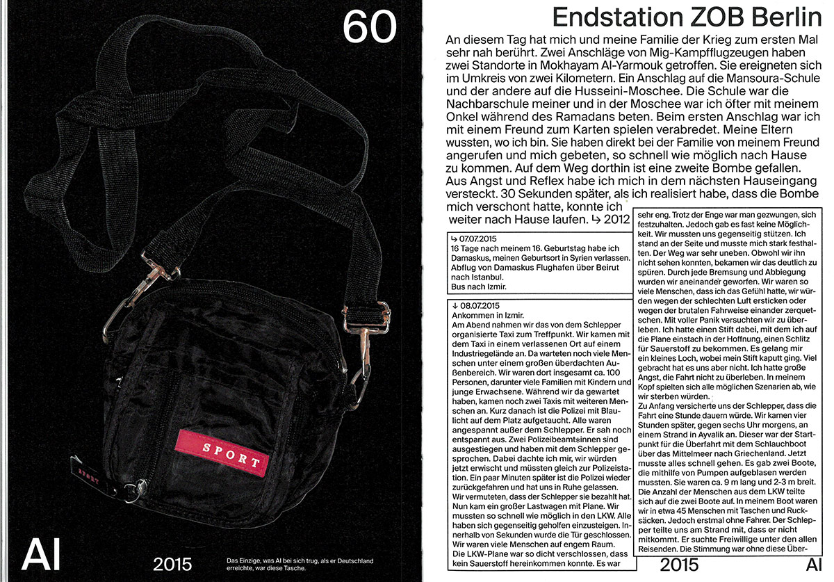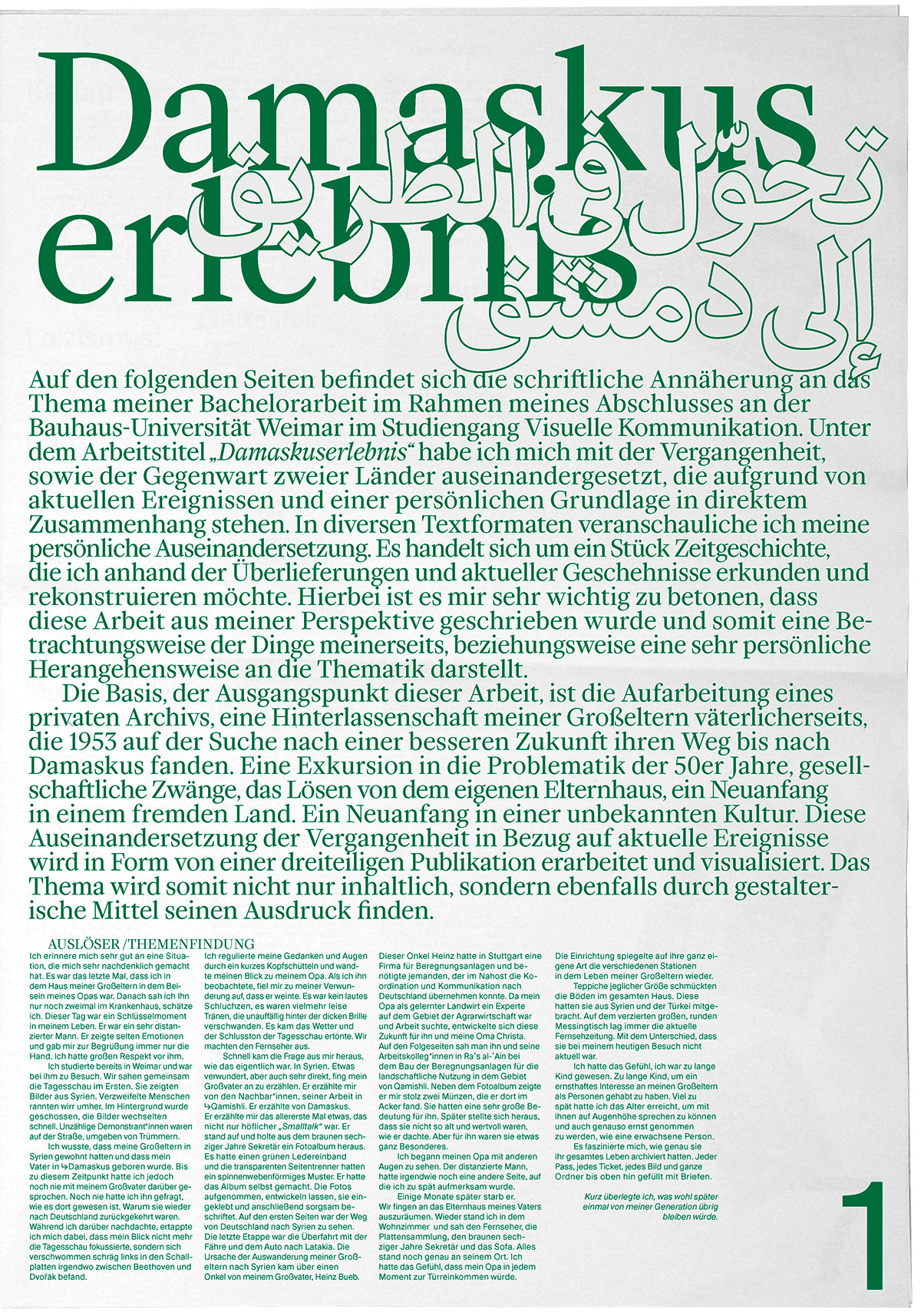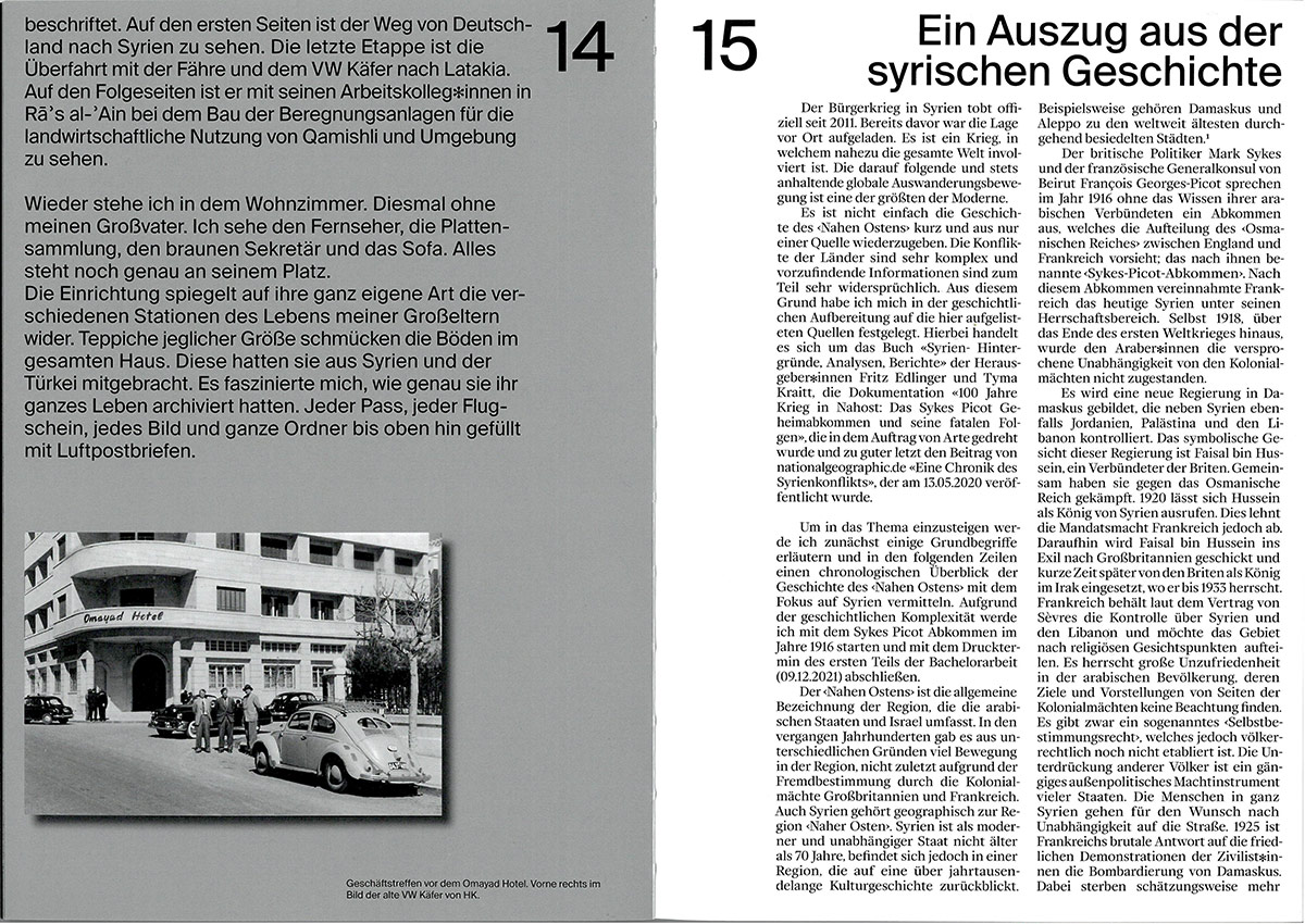 Damaskuserlebnis (“Damascus experience”) is a student work made at the Bauhaus-Universität Weimar, presenting a collection of diverse contributions related to the country of Syria. Fifteen contributors offer insight into their very personal Syria between the years 1953 and 2022. The intention of this work is to sensitize our society to different cultural contexts in terms of integration and unbiased communication. It is intended to encourage people to become active, to profess values and to stand up for one another. I see my role as a designer as creating visibility, with the help of thoughtful design. Design that informs and collaborates with others to create a something new.