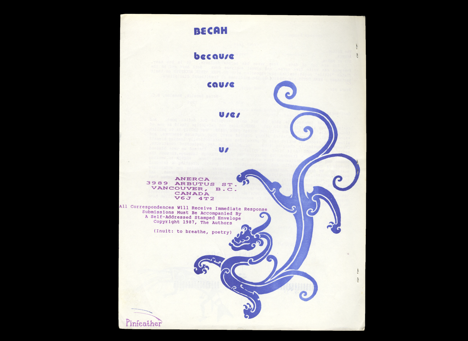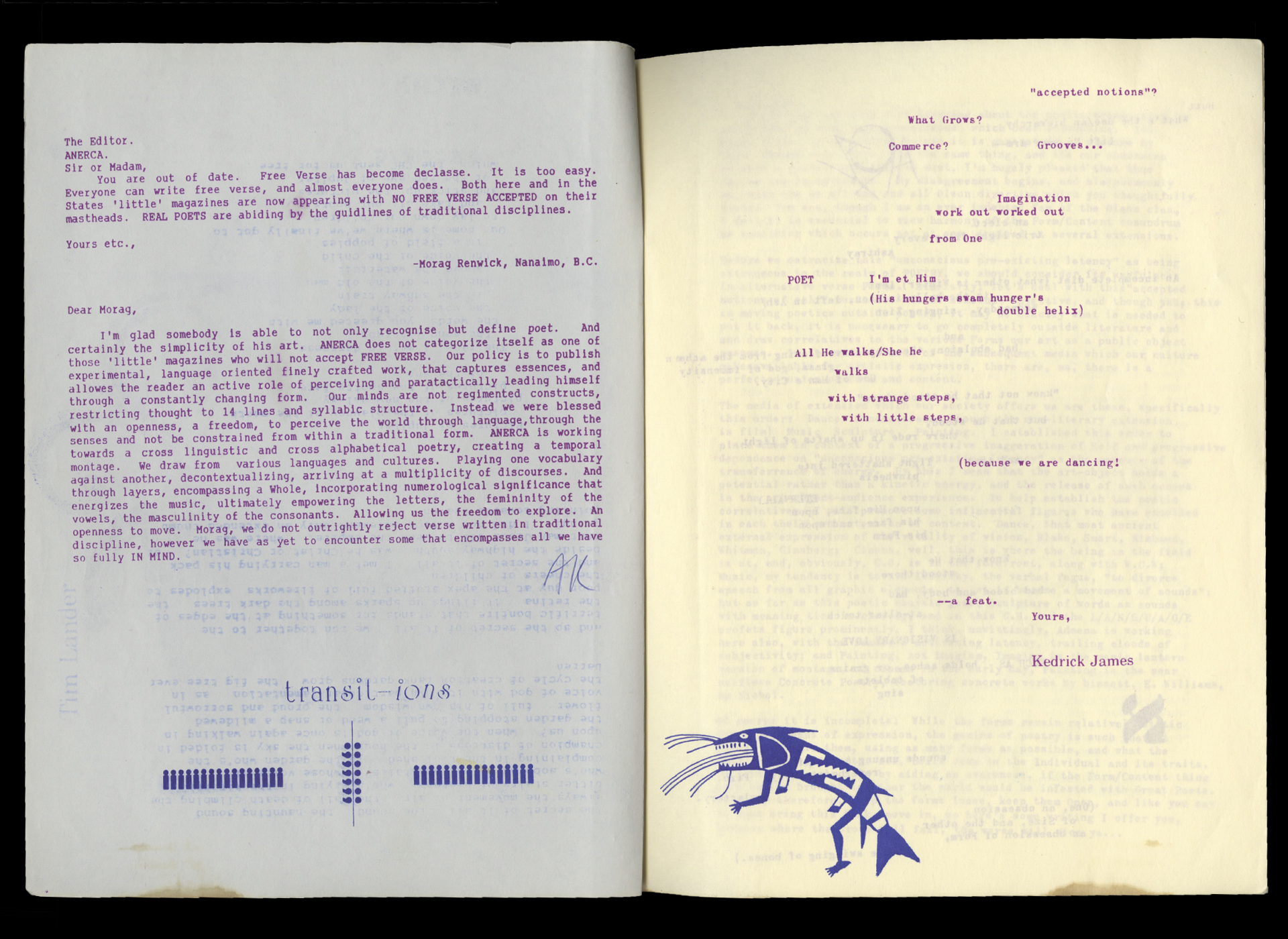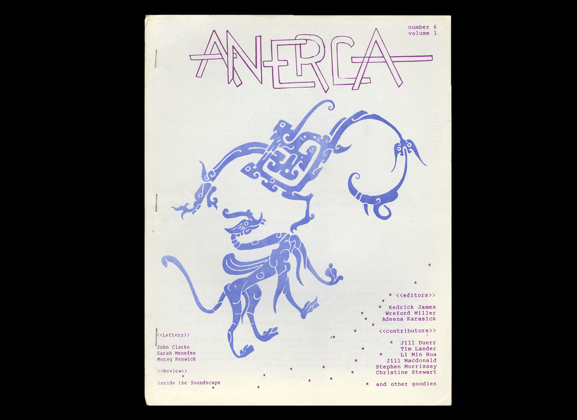 Anerca, meaning “to breathe” or “to make poetry” in the Inuit language, is a Canadian small press poetry review. Edited by the trio Kedrick James, Wreford Miller, and Adeena Karasick, the sixth issue features contributions from poets Jill Duerr, Tim Lander, Li Min Hua, Jill Macdonald, Stephen Morrissey, and Christine Stewart.