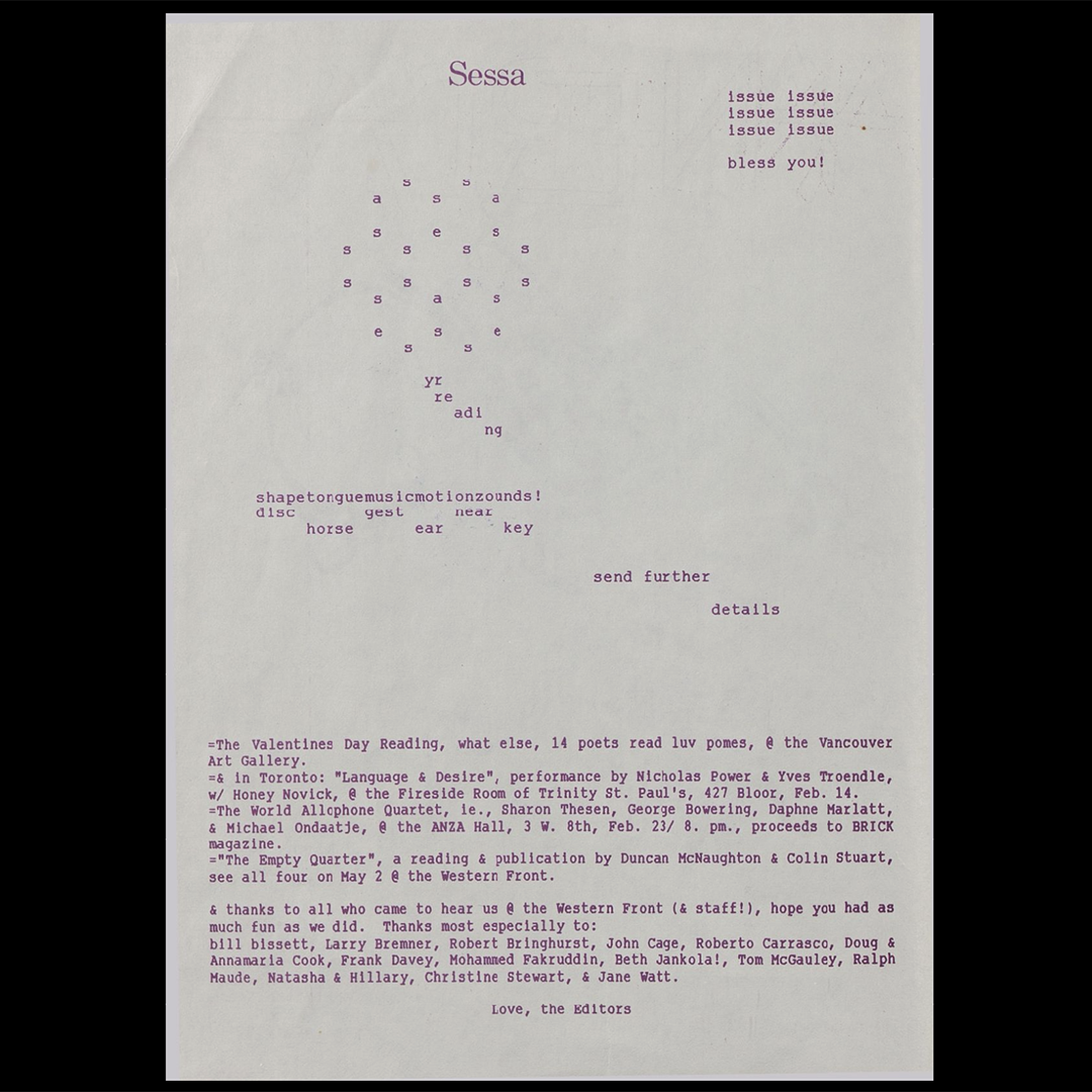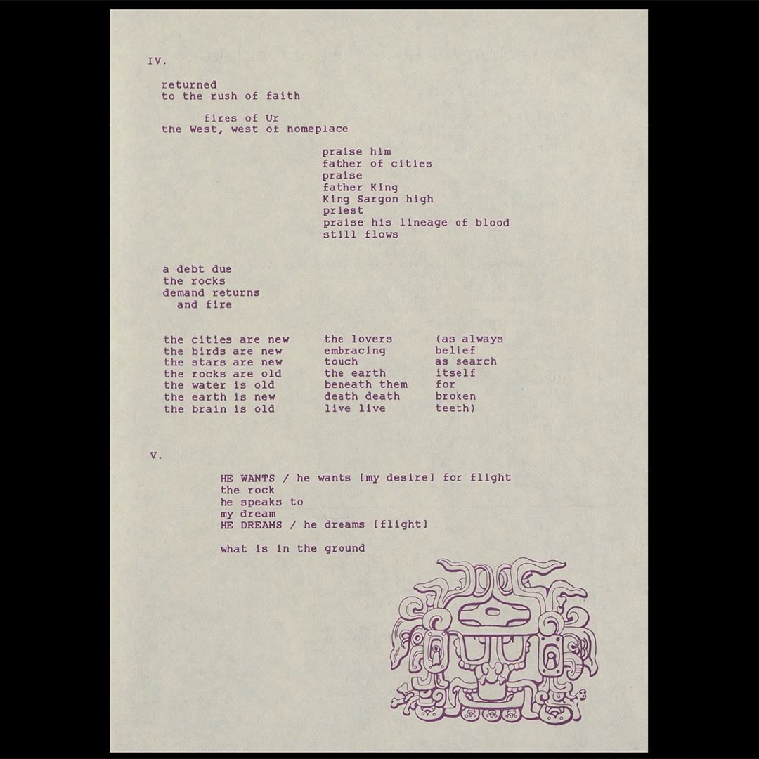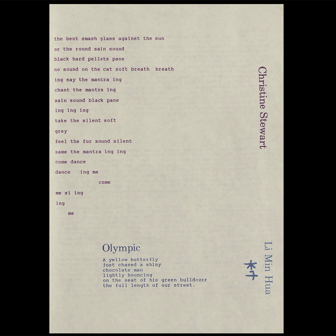 The body text is composed of a set of four typewriter typefaces including Courier, and possibly “Imperial Elite” from an Olivetti Lettera 22 model. Two of them remain unidentified: the condensed version on Sessa’s page and the extended one, composing the mailing address on the back cover. They appear to related to Courier. The layout is complemented by Century Schoolbook for author names, along with University Roman, Pump, and Stam (all available from Letraset), used as illustrative elements on single glyphs and short words.