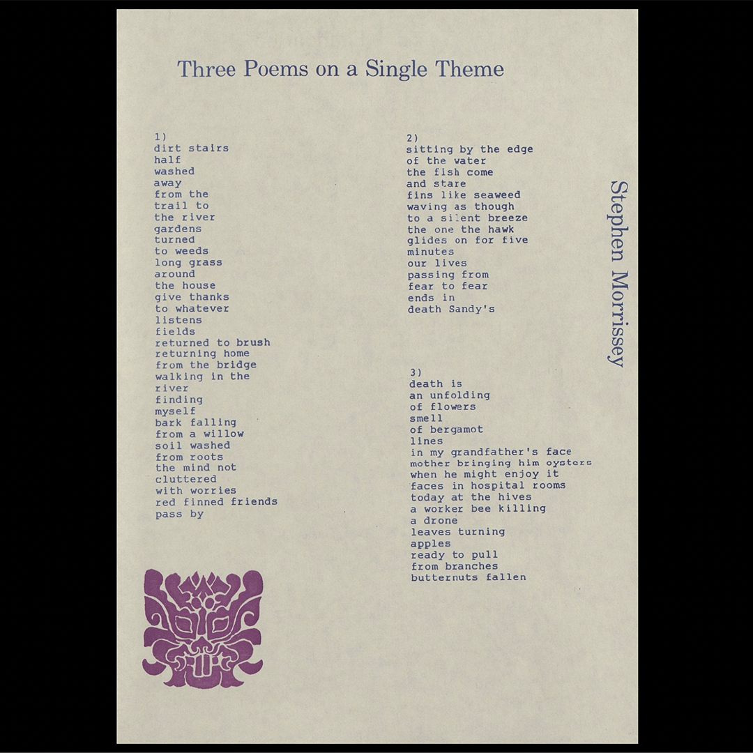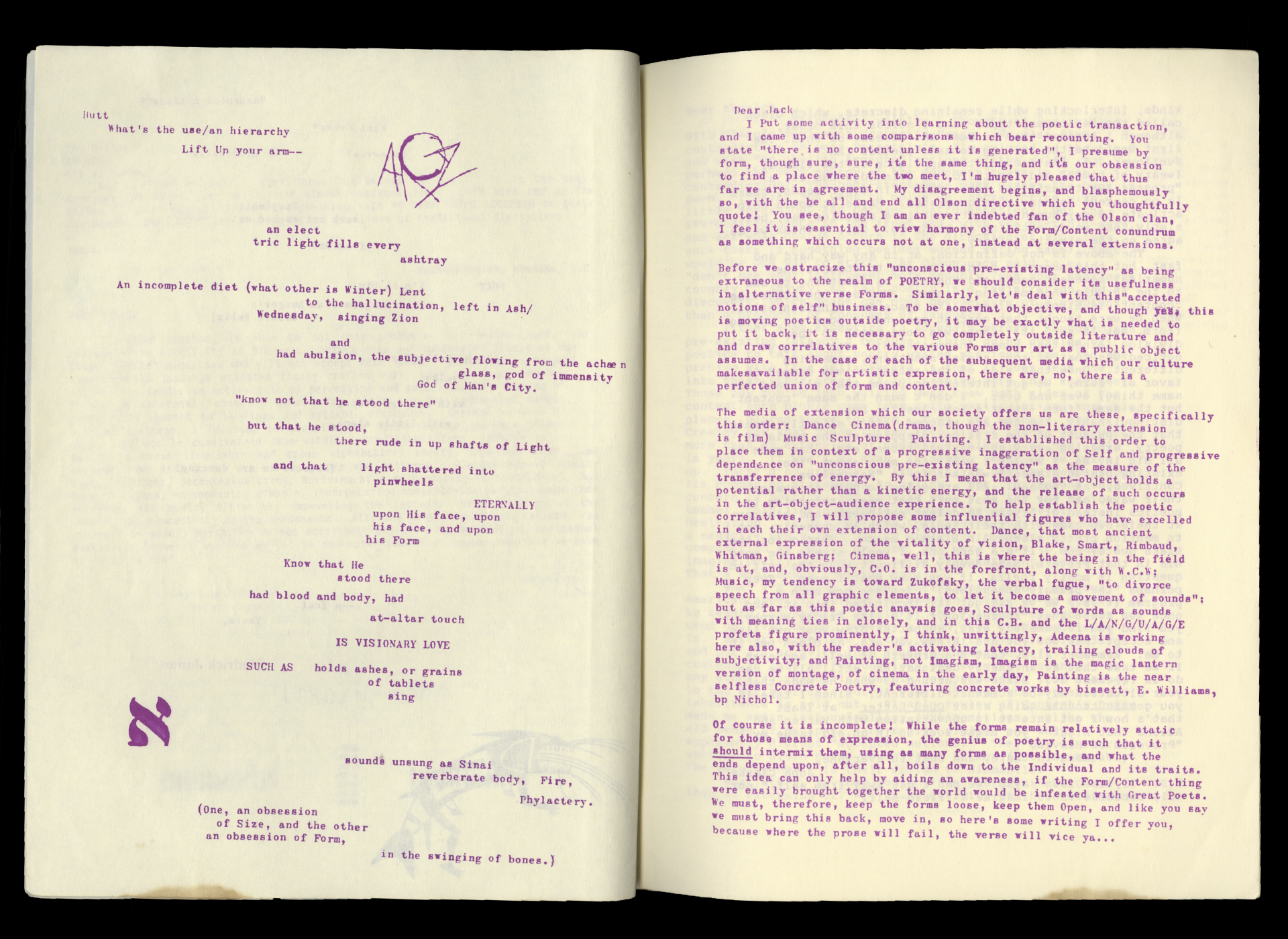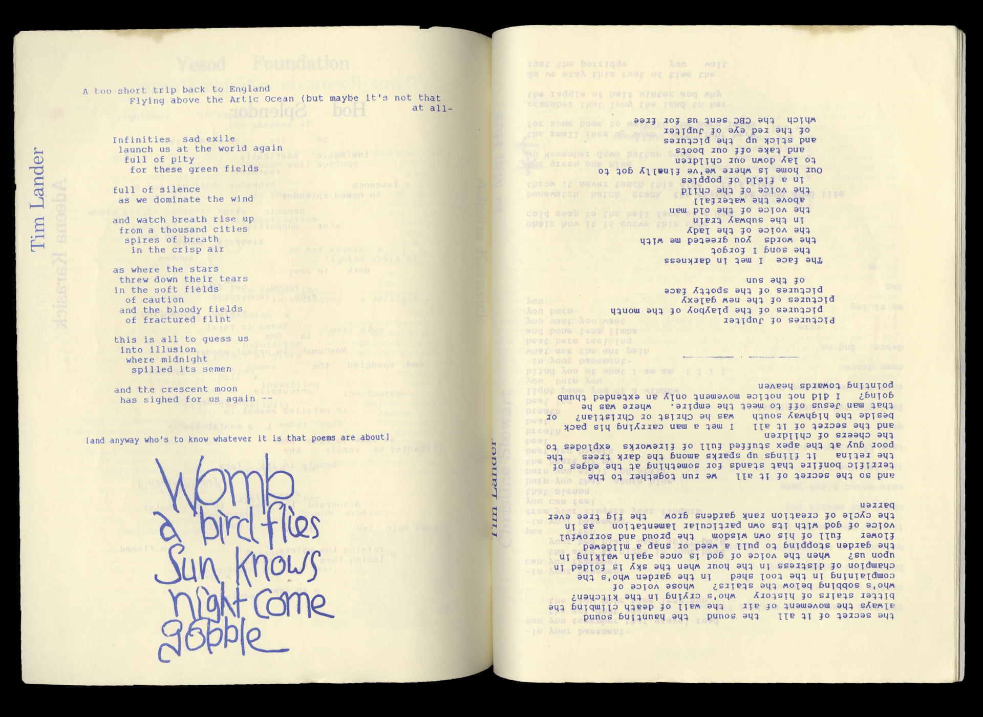 The body text is composed of a set of four typewriter typefaces including Courier, and possibly “Imperial Elite” from an Olivetti Lettera 22 model. Two of them remain unidentified: the condensed version on Sessa’s page and the extended one, composing the mailing address on the back cover. They appear to related to Courier. The layout is complemented by Century Schoolbook for author names, along with University Roman, Pump, and Stam (all available from Letraset), used as illustrative elements on single glyphs and short words.