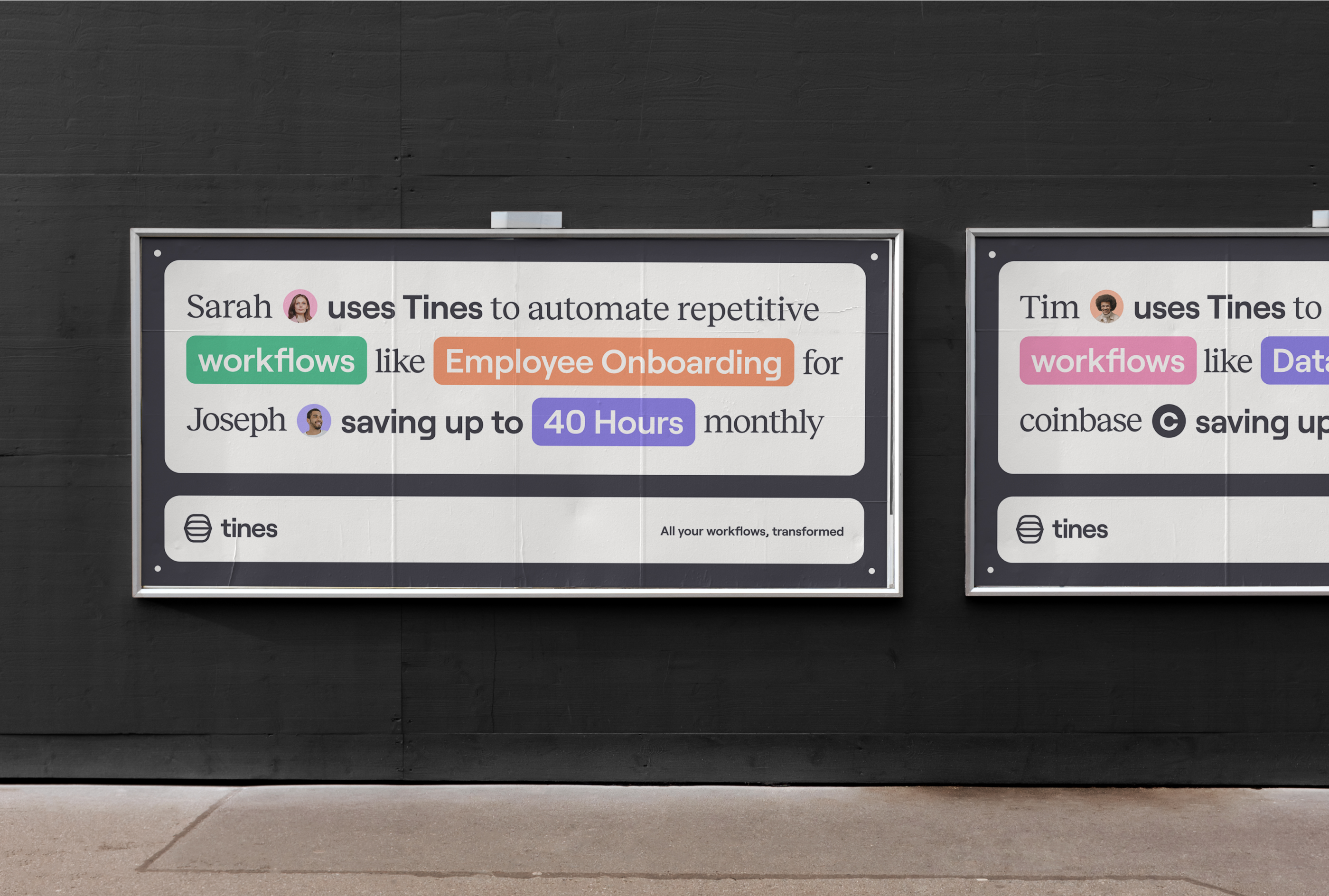 Tines’ typographic system is composed of two typefaces by Displaay Type Foundry: Roobert and Reckless. The primary brand typeface is the sans-serif Roobert. Its geometric construction communicates simplicity with a tech-native sentiment, while its rounded square features mirror the character of the brand’s layout style and usage button shaped control elements.
