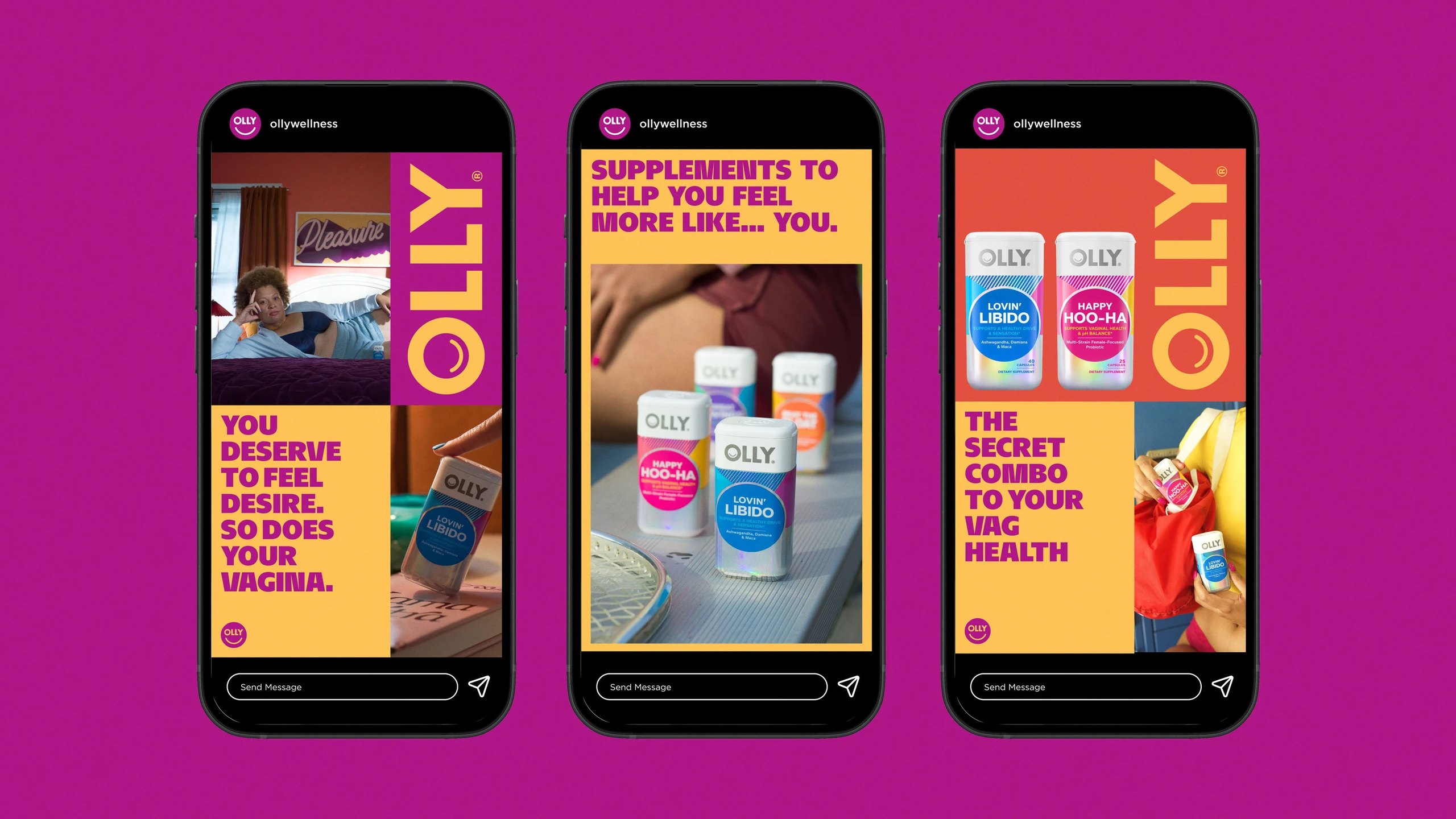 OLLY is a wellness company working to change the way society views and talks about health. The 2023 Big Vagina Energy campaign features their premium line of women’s wellness products. […] We wanted to dive into the meaning behind the Big Vagina Energy message […]. To bring the spot to life in an ownable way, we crafted the OLLYverse — from lighting, set development, and color palette, to the custom typographic elements built into each set and space.