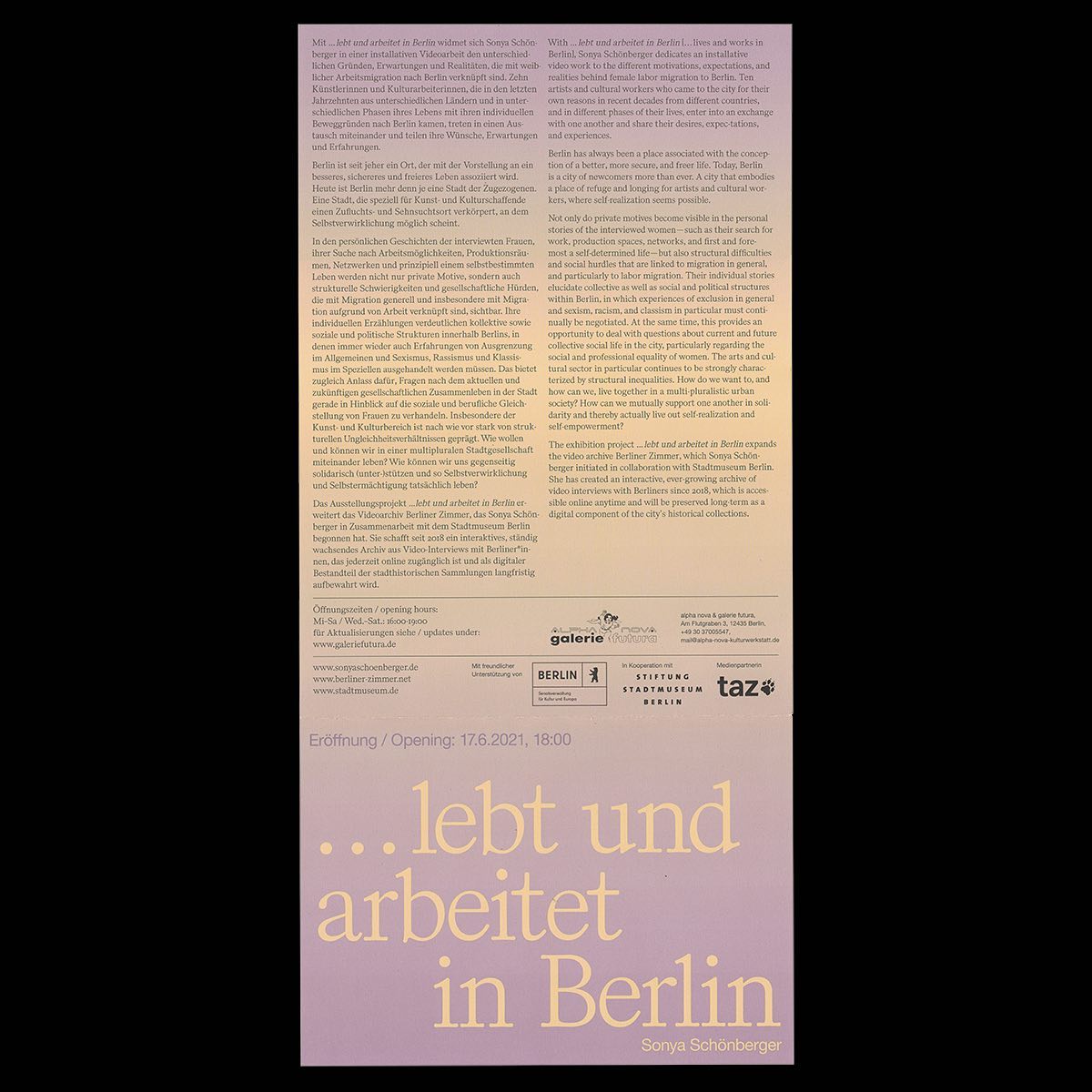 The exhibition …lebt und arbeitet in Berlin / …lives and works in Berlin by artist and filmmaker Sonya Schönberger was shown at alpha nova & galerie futura.