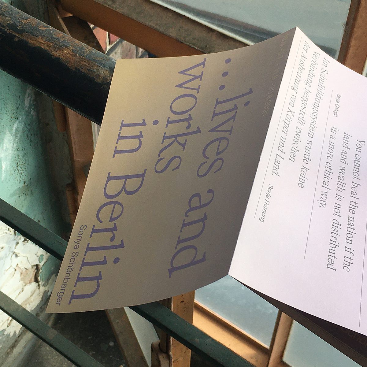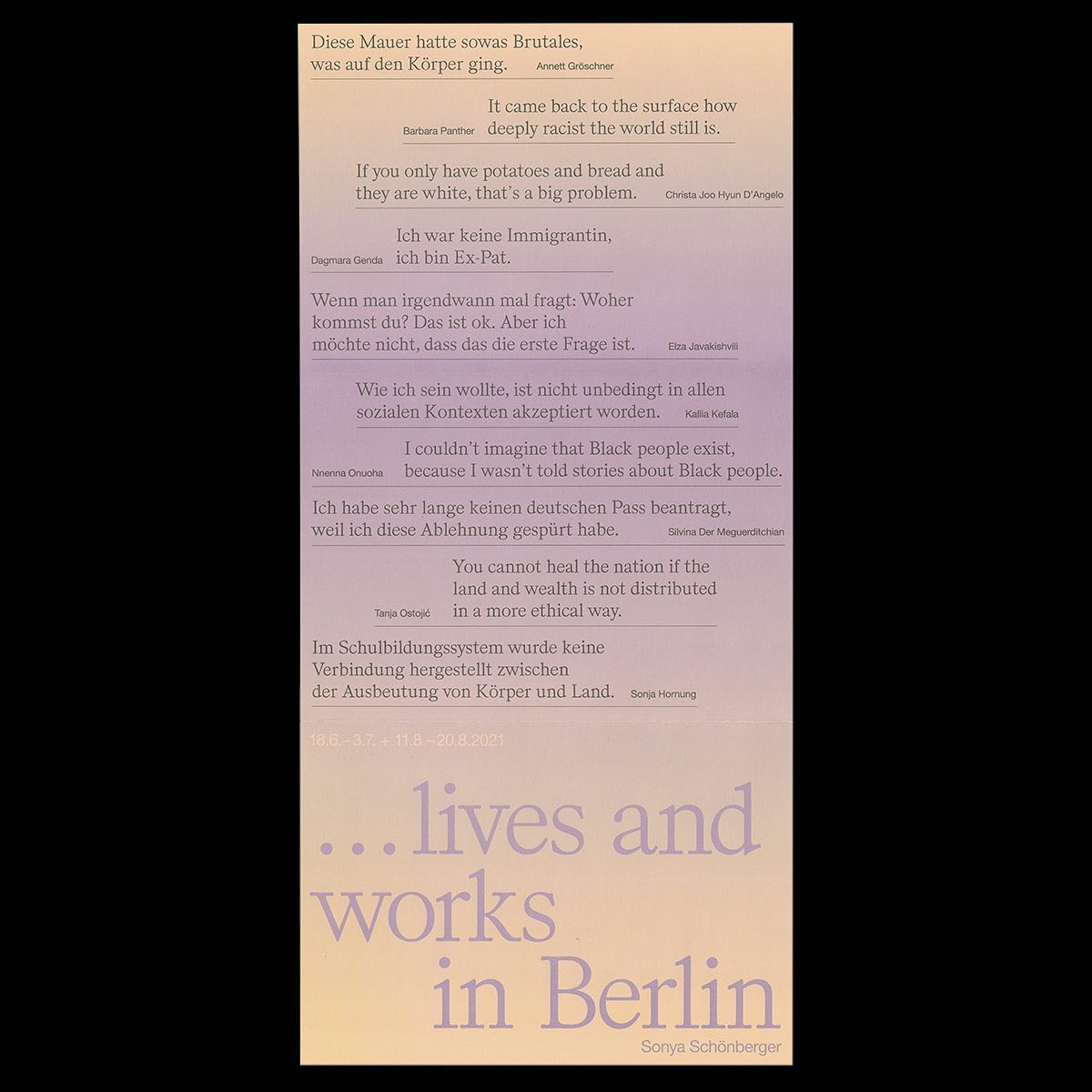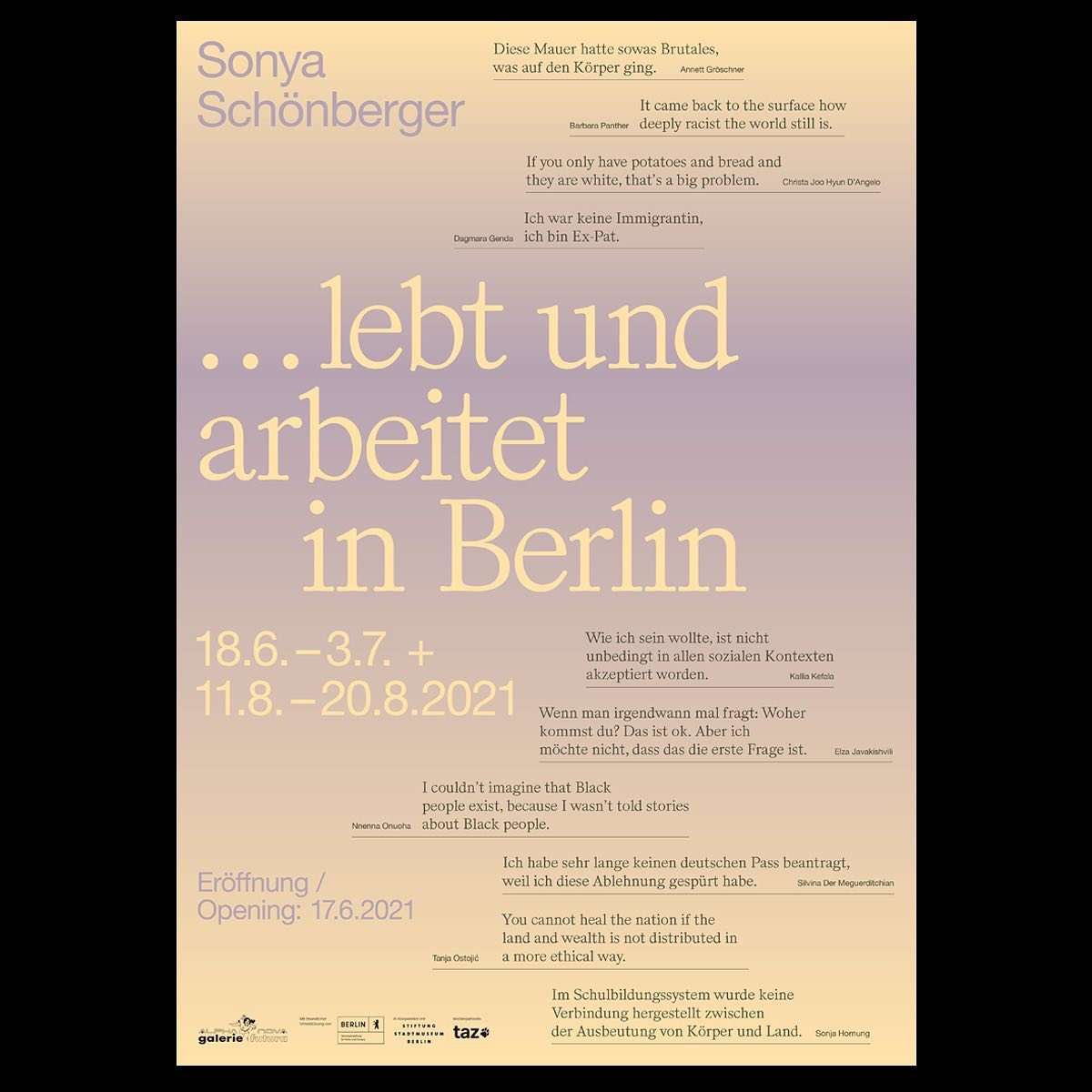 …lebt und arbeitet in Berlin features stimulating conversations with several contributors including Annett Groschner, Barbara Panther, Christa, Dgenda, Elza Javakhishvili, Kallia Kefala, Theirstorian, Silvina Der Meguerditchian, Tanja Ostojic, Sonja Hornung, and is a part of the ongoing video archive Berliner Zimmer, in collaboration with Stadtmuseum Berlin.