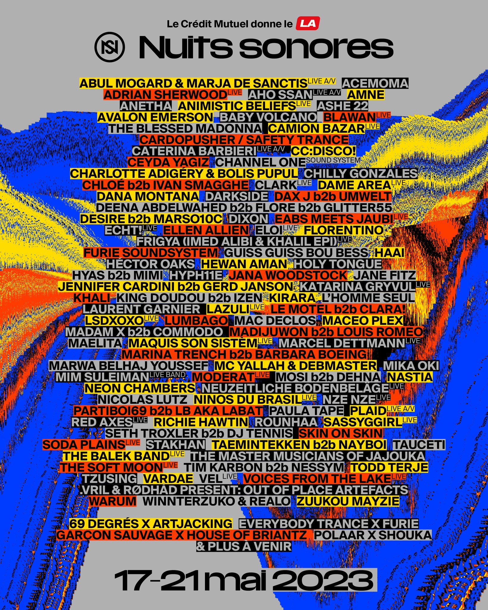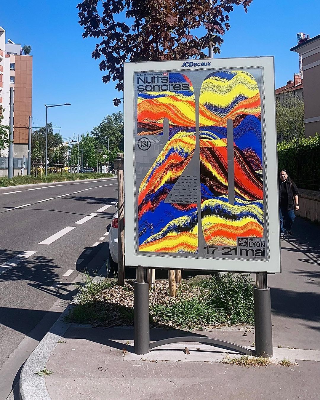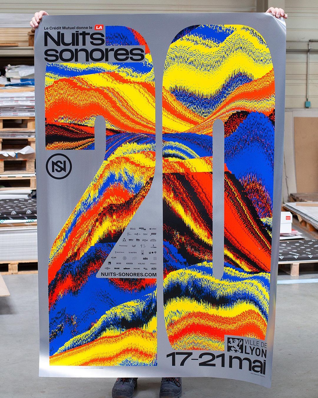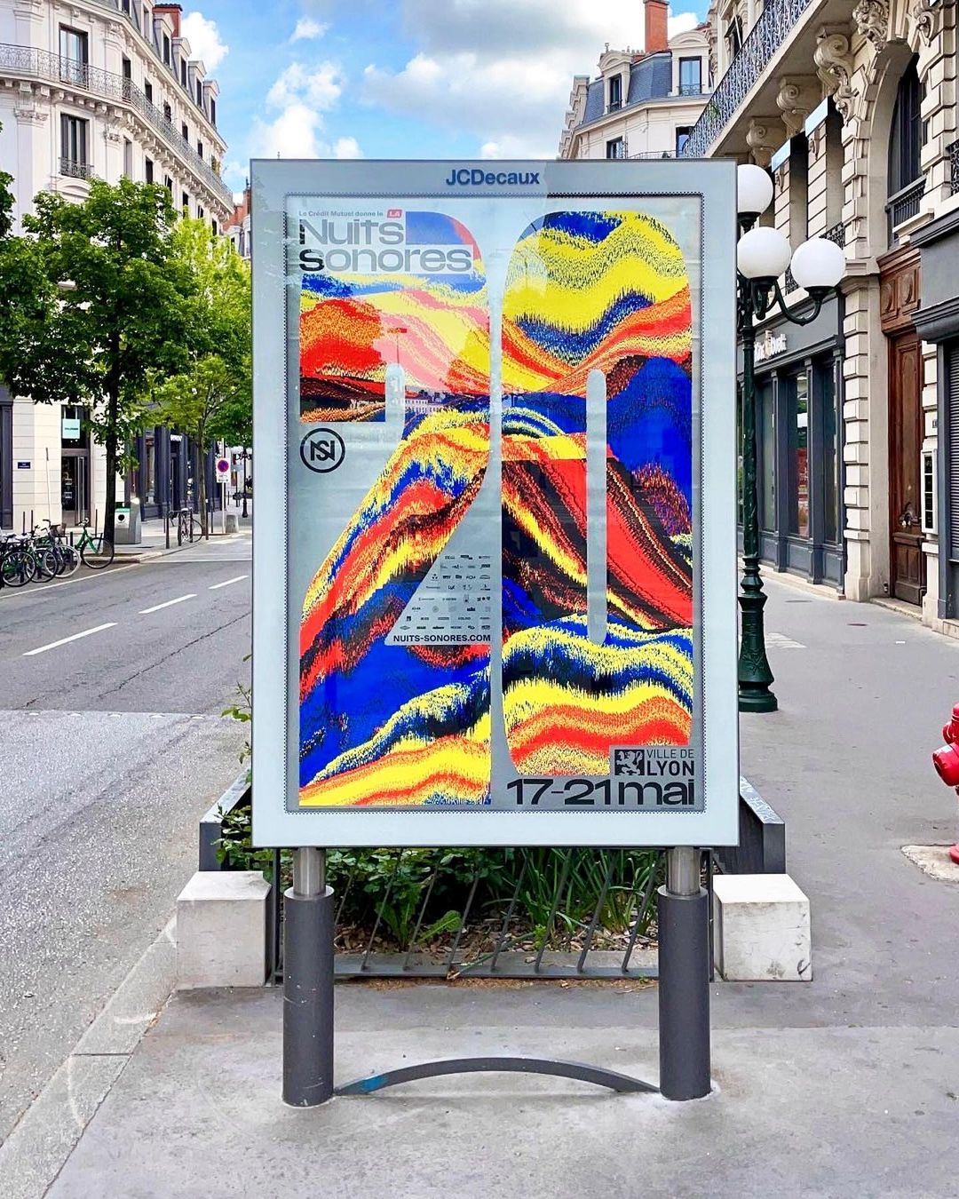 In 2023 Nuits sonores celebrated twenty years of existence. On that occasion the curators wished to celebrate the jubilee with an exceptional visual identity. They asked Lyon-based studio Superscript², consisting of Patrick Lallemand and Pierre Delmas Bouly, to pick a young emerging talent to collaborate with – and they chose Anthony Couret of Studio Antho, a specialist in creative coding. Together they conceived the basic approach.