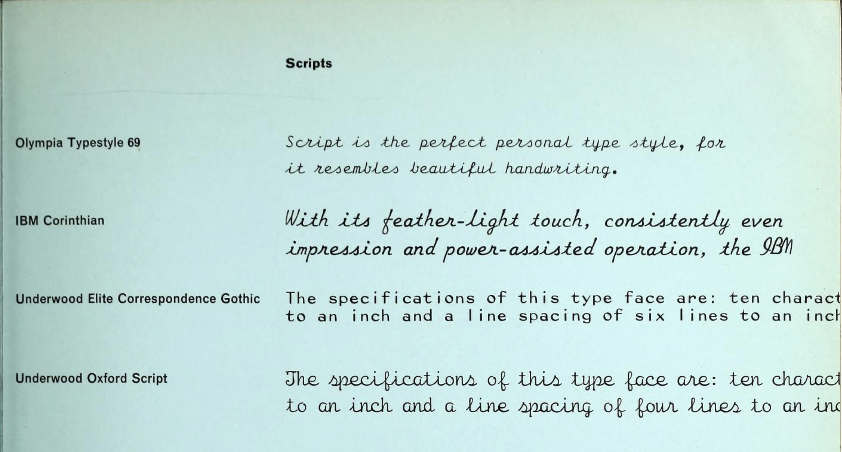 The original went under the name of Olympia Typestyle 69. Contrary to what one might assume, “69” doesn’t refer to the year 1969. The design is older than that, and is shown already in 1962 in Alan Bartram’s article “Typewriter type faces” for Typographica no. 6. There, it’s one of just four styles listed in the Script category. The style was previously digitized by Brett T. Johnson. His Typewriter Olympia SM8 (2016) is rather crude, with letterforms that look autotraced. Rigaud’s interpretation is smoother. In addition to the Regular – which is based on the original, and which is used here – she also added a second lighter weight.