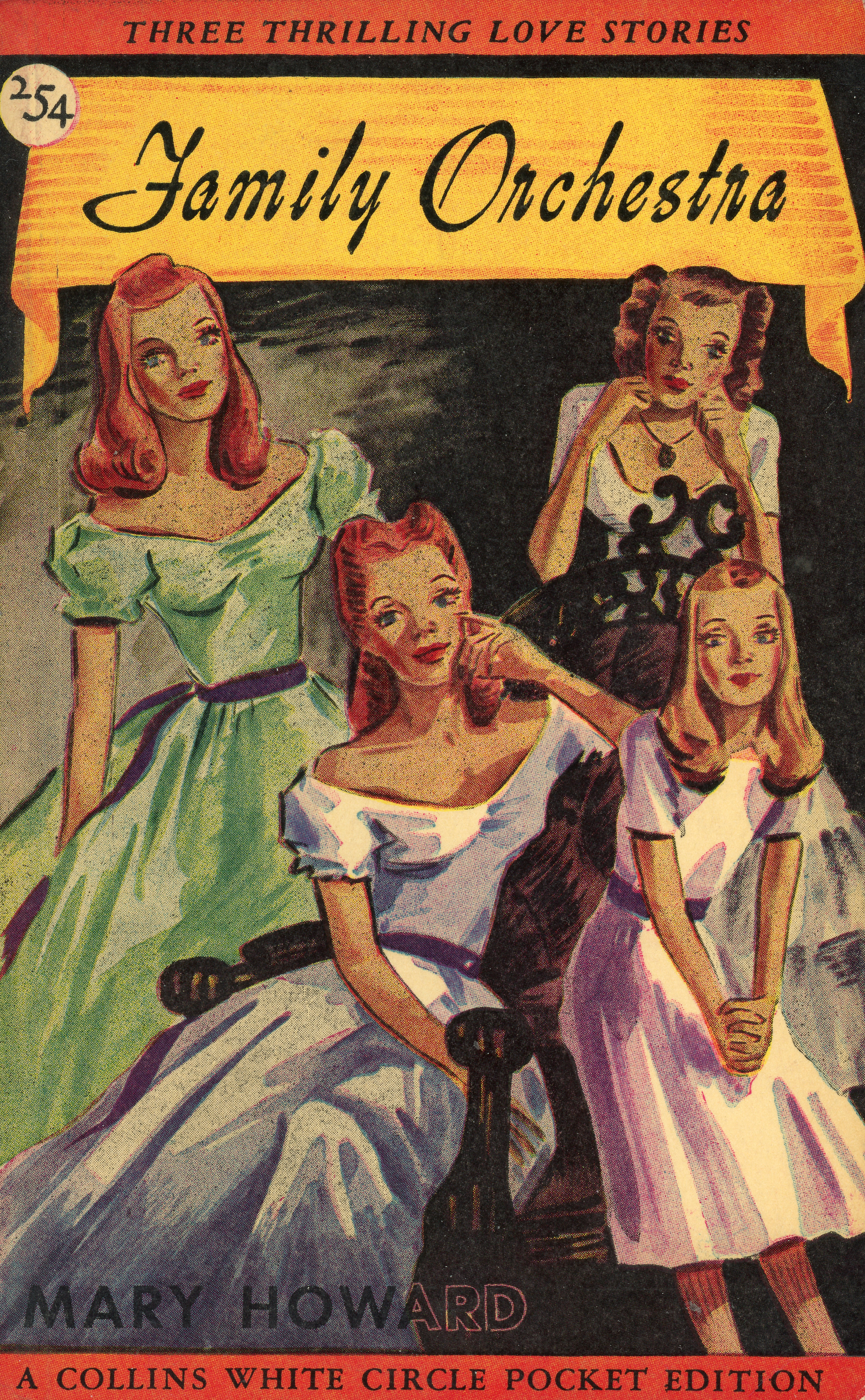 British writer Mary Mussi, née Edgar (1907–1991) authored more than fifty romance novels under the pen name Mary Howard. Her Family Orchestra from 1945 contains “three thrilling love stories”. The shown Canadian paperback edition was published by Collins as White Circle Books 254 in 1946, with cover art by Margaret Paull (1920–2008).