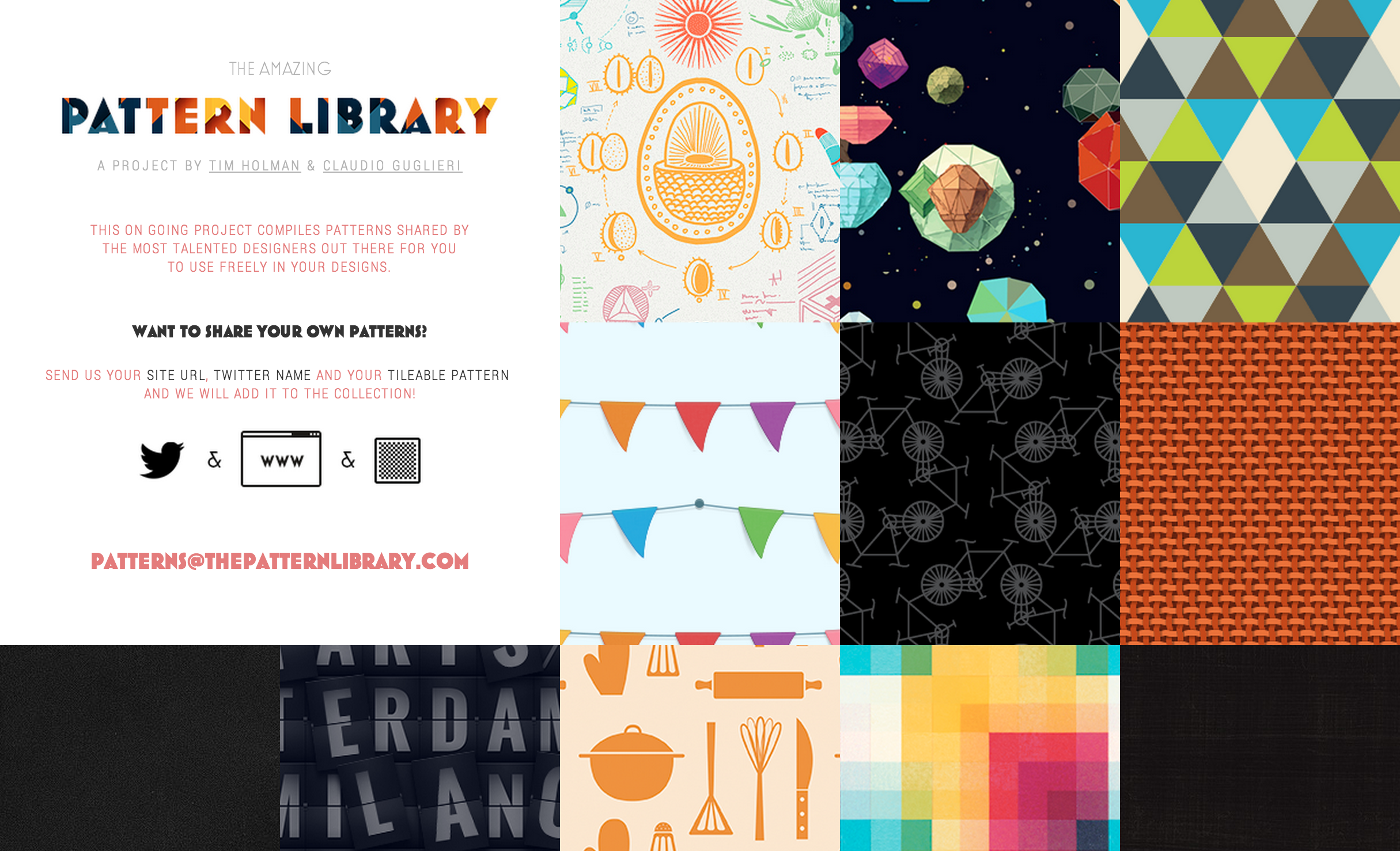 The Amazing Pattern Library Contributed by Stephen Coles on Jan 22nd, 2014. Artwork published in 2014. Source: thepatternlibrary.com License: All Rights Reserved. Source: thepatternlibrary.com License: All Rights Reserved. Source: thepatternlibrary.com License: All Rights Reserved. Source: thepatternlibrary.com License: All Rights Reserved. Source: thepatternlibrary.com License: All Rights Reserved. Source: thepatternlibrary.com License: All Rights Reserved. Source: thepatternlibrary.com License: All Rights Reserved. Source: thepatternlibrary.com License: All Rights Reserved. Typefaces More about Mostra NuovaGet Mostra NuovaMore about Roboto CondensedGet Roboto Condensed Formats Web (5565) Topics Graphic Design (2985) Art (4633) Designers/Agencies Tim Holman (1) Claudio Guglieri (1) Tagged withpatterns/textures (352)webfonts (449)type with image fill (165)type with pattern fill (149) Artwork location United States (9840) New York City (2890) Post a comment Name Email – will not be published Website Your response Submit Comment More Mostra Nuova in use Chocolat Breitling candy tin2015Jeremia AdatteAdatte DesignContributed by Stephen Coles Staff Pick Scarborough Infographic: Shaken & Stirred Millennials2013Josh KorwinScarboroughContributed by Stephen Coles Biblia para el Líder de Jóvenesc. 2013creatorstudioContributed by Martin Piñeyro Sponsor More in Art US Today After2010Bureau 205Contributed by 205TF Liturgy by Flora Yin-Wong2022NMRContributed by Virgile Flores Roma by Massimo Siragusa2020Tomo TomoContributed by Luca Pitoni The Thing Quarterly issue 32: “The No-Thing”2016Experimental JetsetContributed by Nick Sherman Staff Pick More in Web Duogrammac. 2025Gianluca RinaldiMarianna RossiContributed by Marianna Rossi Lukas Haider Design & Art Direction website2015Lukas HaiderContributed by Lukas Haider Otuzuc Kirkbes2025Arda CemContributed by Arda Cem Light Art invitation2020Jitka SchneiderContributed by Jitka Schneider Staff Pick More Fonts In Use Go to the Widow-Maker, Delacorte first edition1967Paul BaconContributed by Stephen Coles Staff Pick Poems to a Greek Lover by David Plantec. 2024Wolfe HallGregorio MagnaniContributed by Jack Niblett Staff Pick Revista de Ventallóc. 2017Senyor EstudiContributed by Lluís Serra Staff Pick Hotel Seidenhof2022SkalaSamara KellerCreative SupplyContributed by Maxitype Staff Pick