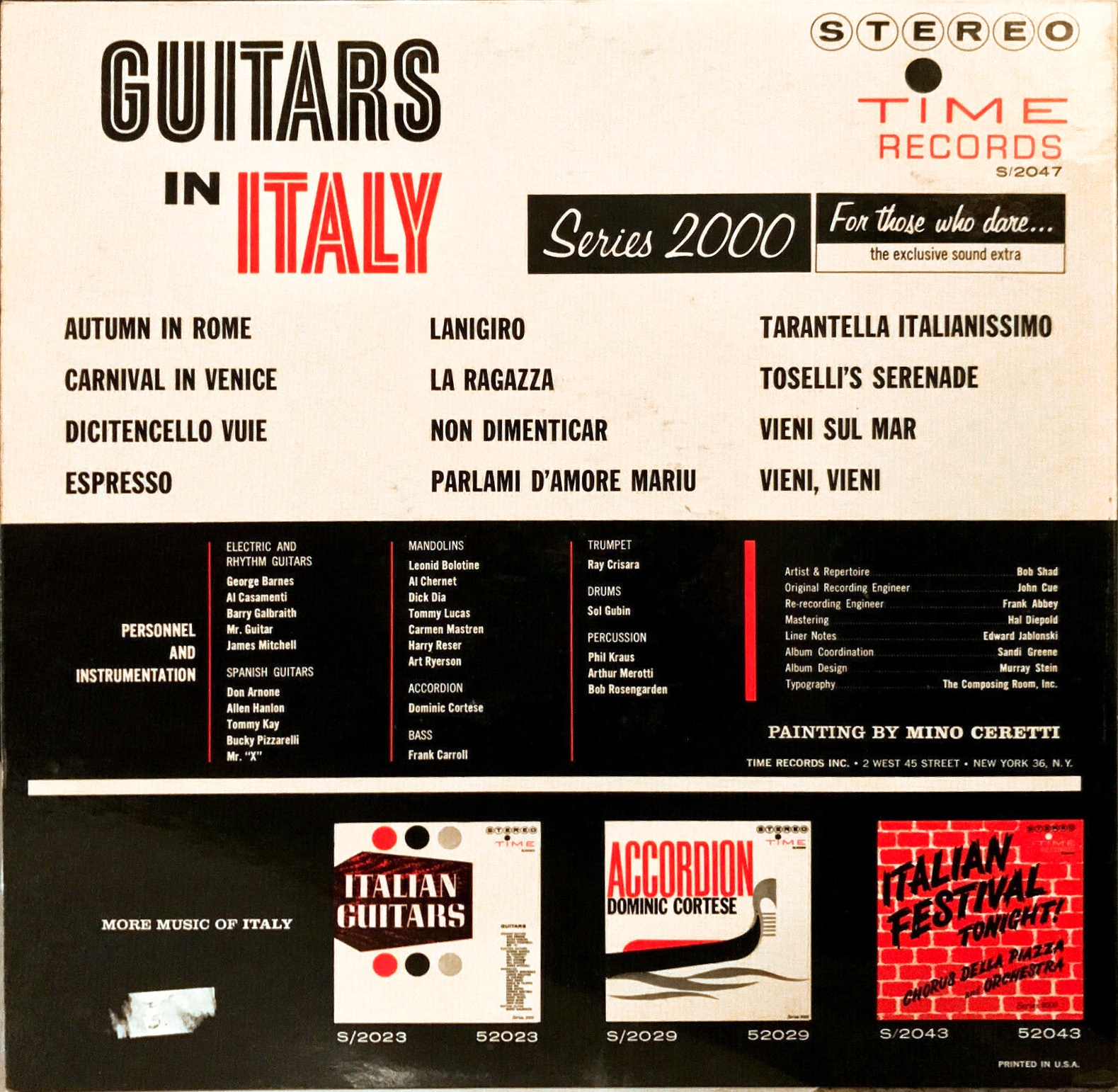 Guitars in Italy album art Contributed by Fonts In Use Staff on Jan 1st, 2025. Artwork published in 1961. Source: www.ebay.com simply_lo (edited). License: All Rights Reserved. In addition Quick, the front cover features Venus Extended in two weights and Century Expanded Italic for “Series 2000”. Filmotype Quick is an inline variant of Ginger, issued in c.1958. In 1961, designer Murray Stein specified it for an album of Italian guitar music, released by Time Records in their Series 2000. The cover painting is by Mino Ceretti. The typography was carried out by The Composing Room, Inc., New York. [More info on Discogs] Source: www.ebay.com zila2001. License: All Rights Reserved. On the gatefold, “GUITARS” and “ITALY” were aligned to the letter I, and the open stems extended all the way to the top edge. Source: www.ebay.com simply_lo (edited). License: All Rights Reserved. The back cover typography has Filmotype Jefferson for “Series 2000”, all-caps Franklin Gothic Extra Condensed for the track list, Trade Gothic in two widths for credits and address, and Clarendon. Typefaces More about Filmotype QuickMore about Filmotype JeffersonMore about Venus ExtendedGet Venus ExtendedMore about Franklin GothicGet Franklin GothicMore about Century ExpandedGet Century ExpandedMore about Trade GothicGet Trade GothicMore about Clarendon Formats Album Art (4310) Topics Music (6462) Designers/Agencies Murray Stein (7) The Composing Room, Inc. (6) Tagged withTime Records (8)Series 2000 (6)album records (2875)gatefold (114)vinyl records (3415)1960s (791)Italy (47)red and black (1154)hyper-extended glyphs (343)back covers (2325)track listings (1284) Artwork location United States (10083) New York City (2986) In SetsFilmotype (Florian Hardwig) (192)Franklin Gothic Condensed & Extra Condensed (Nick Sherman) (149)RADIOGIAPPANESE (Leonardo de la Fuente) (2878) 2 Comments on “Guitars in Italy album art” Iman Zaim says: Feb 12th, 2026 6:46 am Can you give me a glyph set of VGC M-3? Florian Hardwig says: Feb 13th, 2026 8:32 am Hi Iman, I can see what I can do. In the meantime, you can already see a glyph set for Filmotype Quick in a 1960s catalog. It’s not of very high resolution, but it might be a start. Post a comment Name Email – will not be published Website Your response Submit Comment More Filmotype Quick in use Various Artists – Original Goodies album art1963Murray SteinThe Composing Room, Inc.Contributed by Florian Hardwig Staff Pick Various Artists – Underground Gold album art1969Gabor HalmosRoger ChouinardPhoto(s) by Klaus Hiltscher on Flickr. Clip Books of Line Art, Volk (1960)1960Harry Volk Jr. Art StudioPhoto(s) by Bart Solenthaler on Flickr. Staff Pick Sponsor More in Music Apero Records & Wine2024Éma PerretIma StudioContributed by Éma Perret The Guess Who – “Follow Your Daughter Home” / “Bye Bye Babe” German single cover1973Contributed by Garrison Martin B77 – “Another Day” single coverc. 2022HordeContributed by Dennis Moya Razafimandimby “Christmas Wrapping” / “Hangover 1/1/83” – The Waitresses1982Contributed by Garrison Martin More in Album Art Qypthone – Modernica in the House album cover2000unknownContributed by Arra Reai The Moments – Look at Me album art1975John PascheDudley ThomasGull GraphicsContributed by Florian Hardwig Alocados Mixtape2015Joe NewtonContributed by Indra Kupferschmid Hap Palmer – Homemade Band album art1973Kristie KellyContributed by Florian Hardwig Staff Pick More Fonts In Use David protein bars2024Day JobContributed by Jordan Egstad Staff Pick Quilo: Journal of Photographic Tales from Brazilc. 2023Porto RochaNatalia OledzkaVictor CarvalhoContributed by Mico Toledo Staff Pick NOS2014Wolff OlinsContributed by R-Typography Staff Pick Herman Miller ads for George Nelson Designs, 1948–501949Irving HarperContributed by Stephen Coles Staff Pick