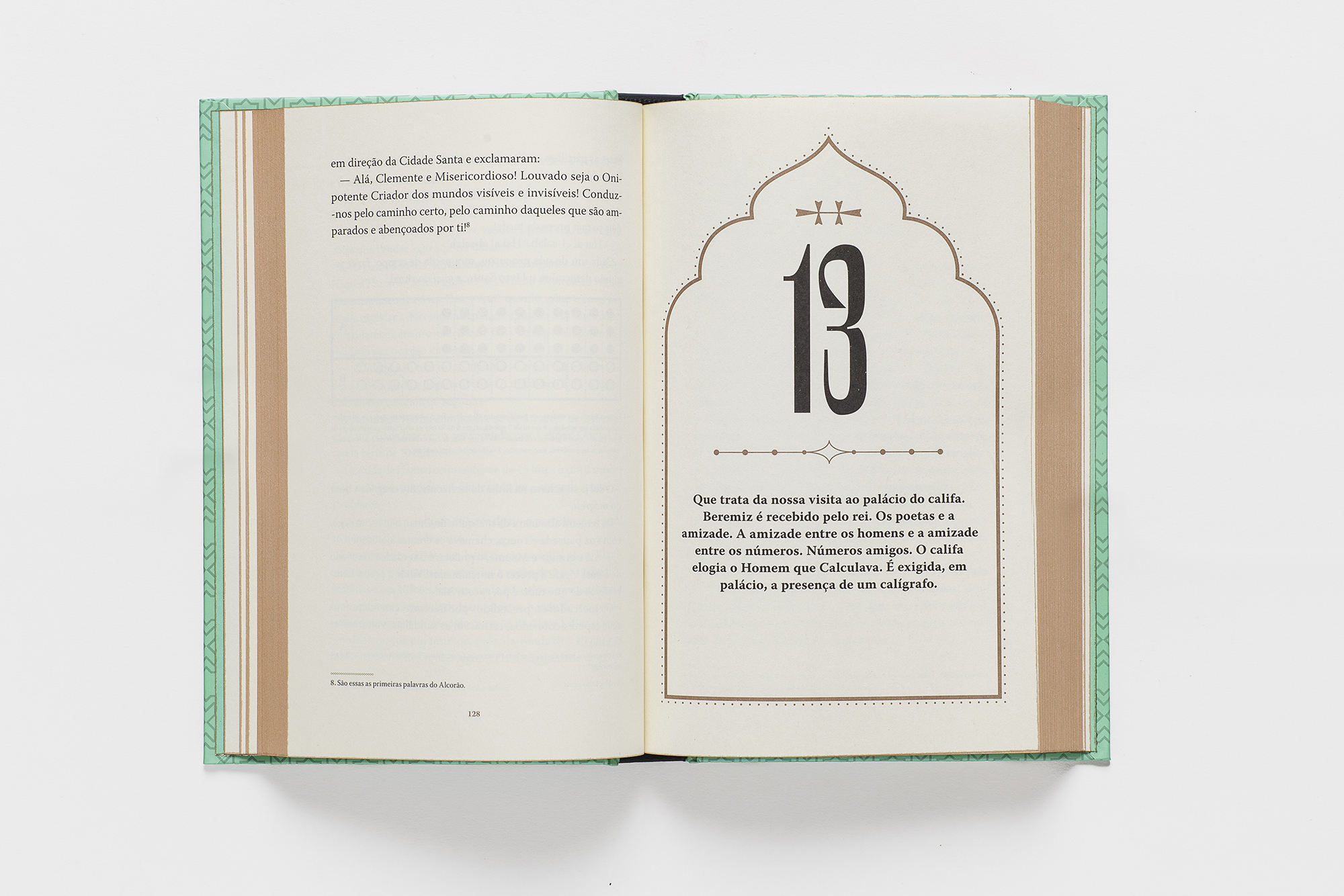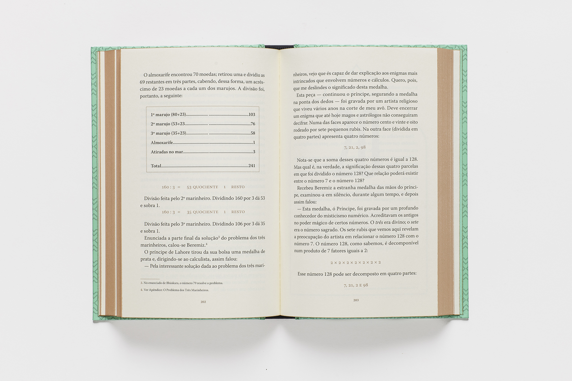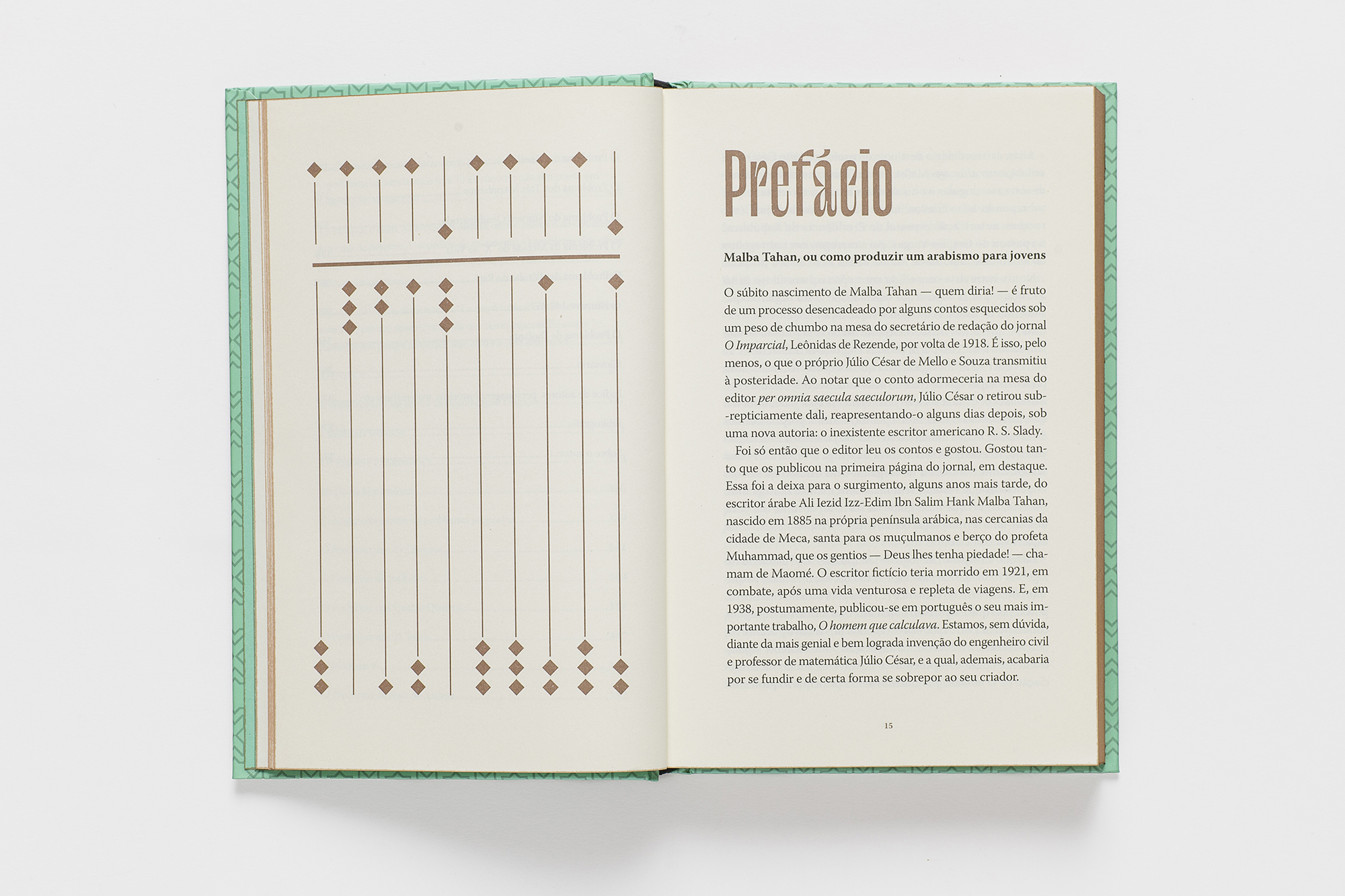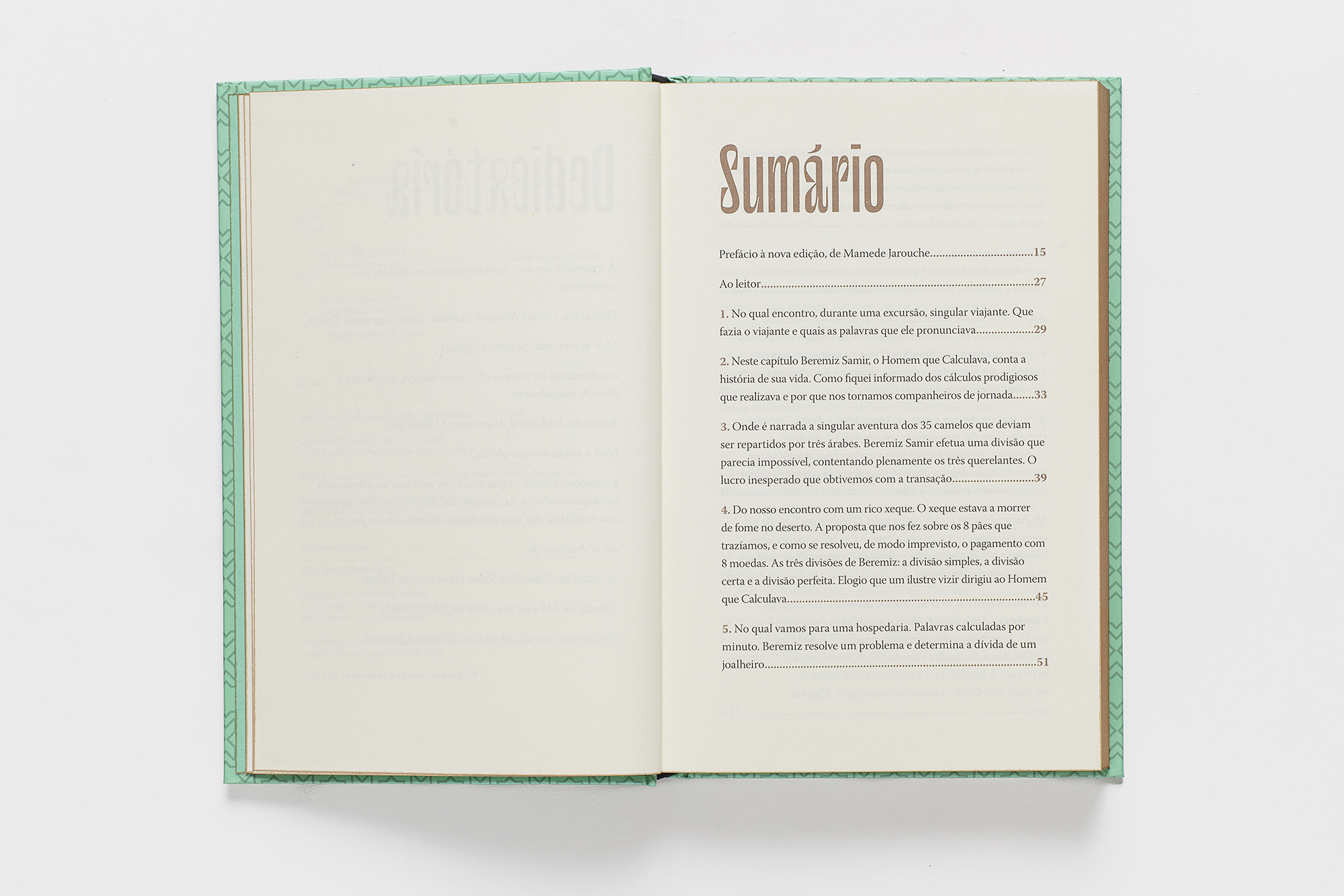 In 2021, Editora Record published the book’s 100th edition as O Homem que Calculava. The design uses Le Murmure and Vampiro for title and author, with their Arabic counterparts set in Noto Naskh Arabic and Reem Kufi. The edition notification is set in Impetus, and blurb and text are set in Warnock.