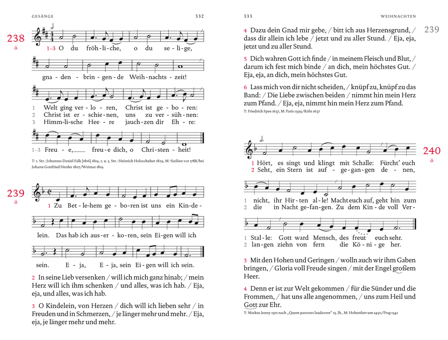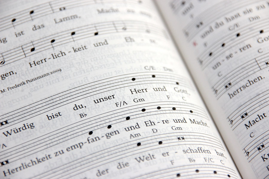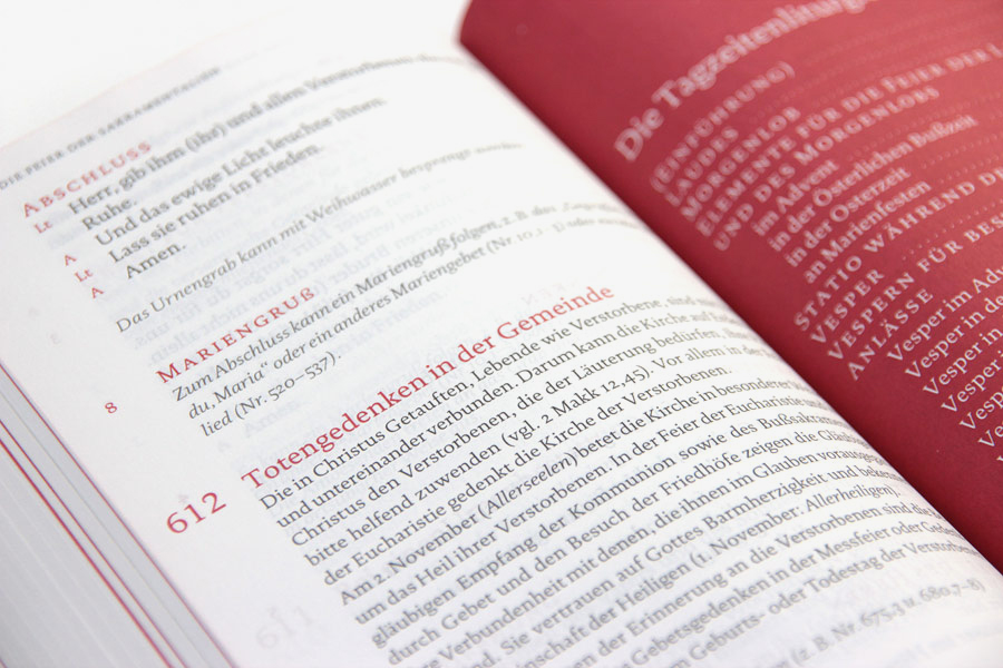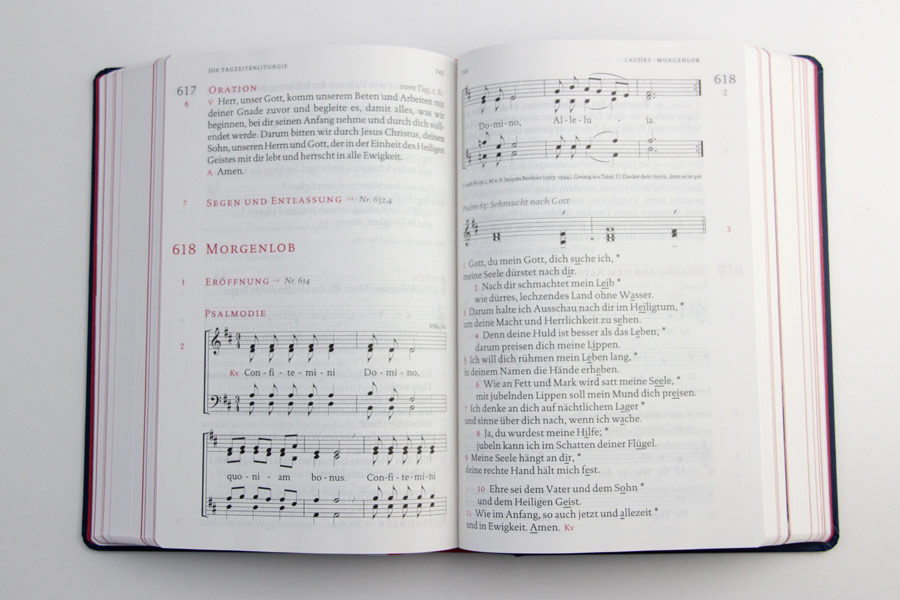Responsible for the design of Gotteslob was Matthias Bumiller from the design agency Finken & Bumiller in Stuttgart, Germany. In 2006 he started with the design of this magnum opus, which resulted in a positively received test version in the next year. Legibility had the highest priority and factors like low light in churches in combination with the inevitable relatively small point sizes were taken into account. After testing several typefaces, Frank E. Blokland’s DTL Documenta was selected.