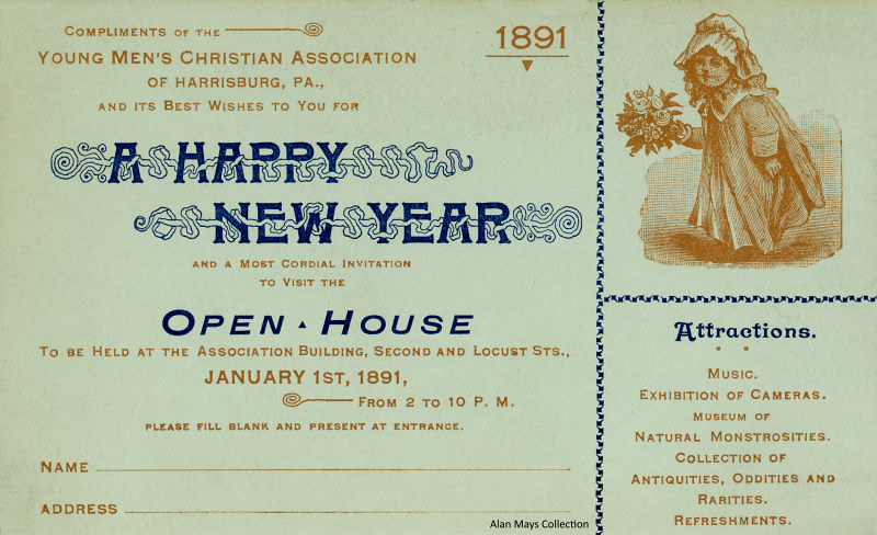 A New Year’s greeting and invitation card for a YMCA open house held in Harrisburg, Pennsylvania, on January 1, 1891.