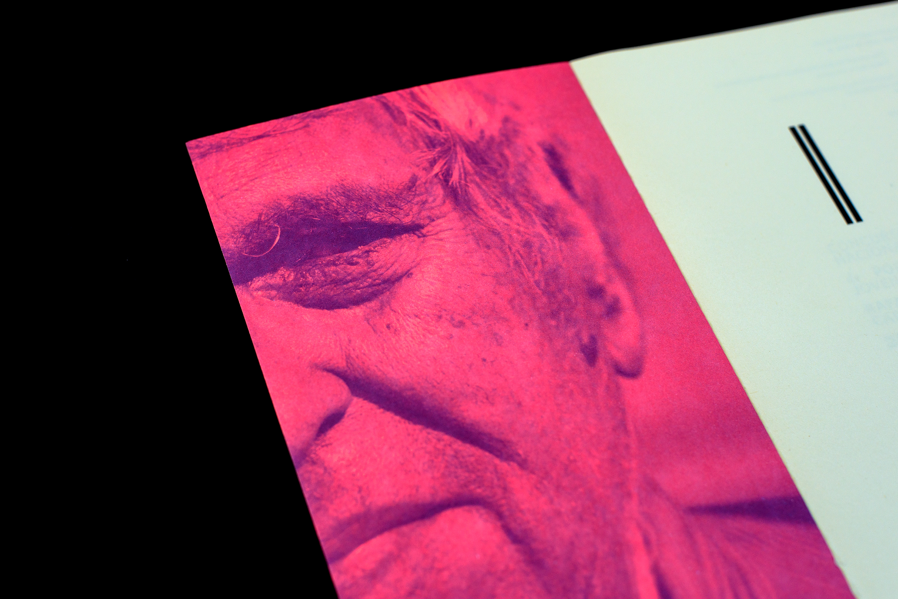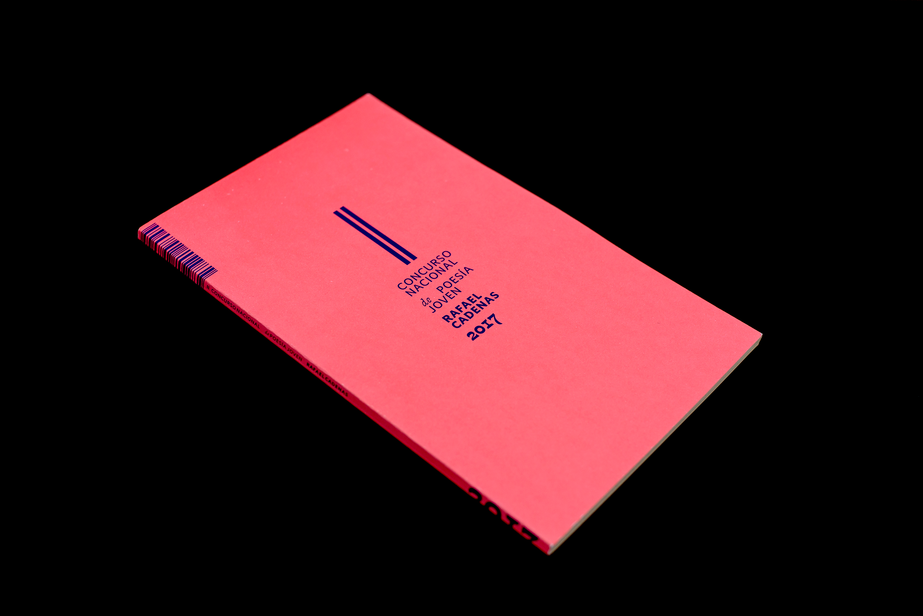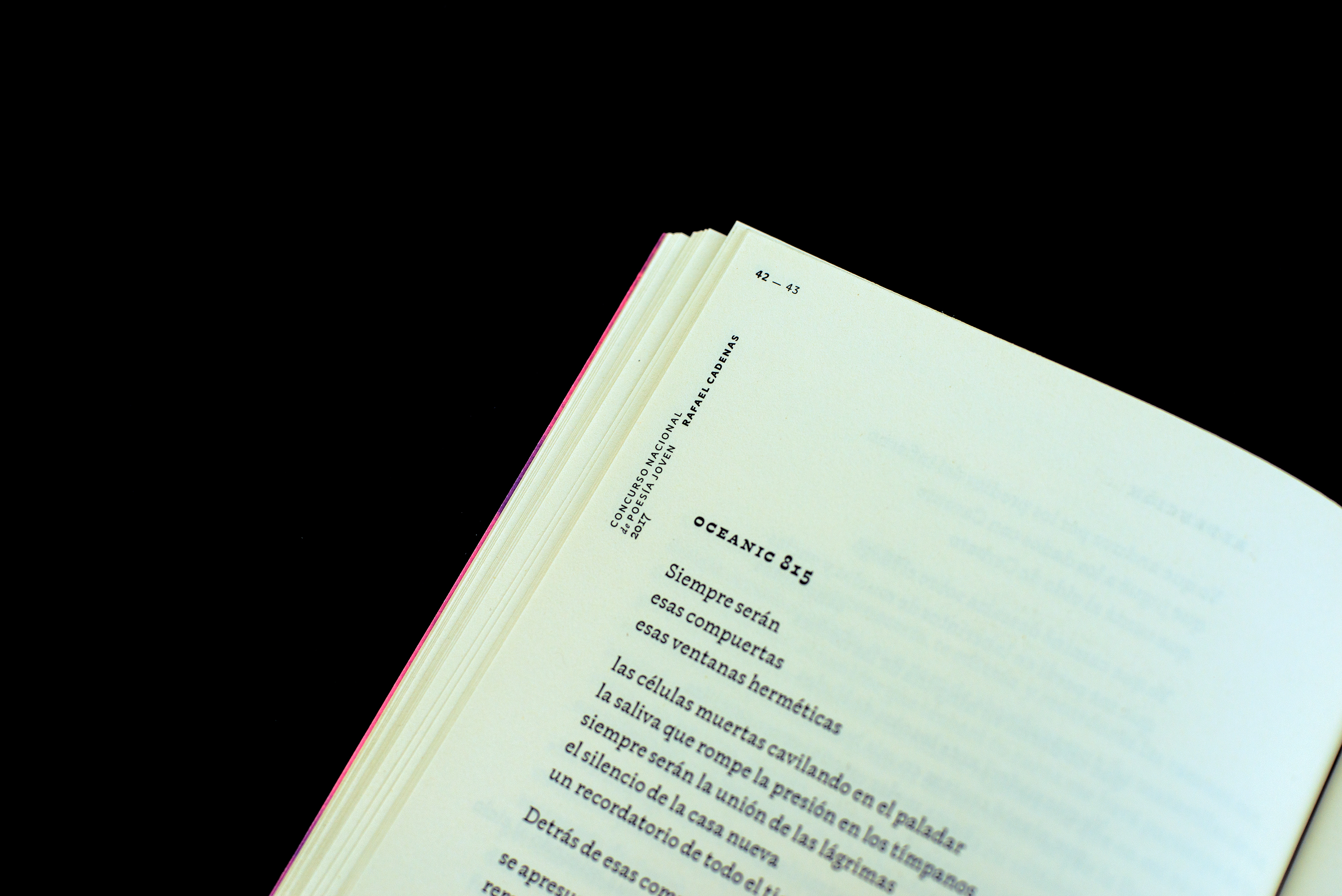 The cover beckons with an expanse of enticing, intense salmon-pink. Printed on it: the title, compactly in ink blue. The barcode – usually a tiresome addition – adorns the spine here as traversing lines that spill over to the front and back. On the inside cover, a truncated portrait of the writer Rafael Cadenas, whose gaze seems to watch over the contributions for the National Young Poetry Competition in Venezuela. The poems by 26 individualists have individual forms as well – their verse lengths, structures, peculiarities of typesetting: contour type, italicisation, indents, unusual word spacing. Which makes it tricky for the designer. The name of the competition is presented as a vignette, together with double page numbering, at the top on the left side of the left-hand pages – this defines the double page as an open space. The font is chosen particularly carefully, used for the first time ever in this book. The serifs are designed as fluent recollections of a quill pen; the structure of an Antiqua is alive in the grey tone – and its bold-fine style is borrowed from the Wild West versions of the Egyptienne typeface. This is noticeable on the rounded minuscules, but is even more striking in the bold capitals where the low lines lie horizontally. Writing, book printing, Latin America – these features are breathed into the font modestly yet confidently. The book designer casts a spell on the competition documentation, turning it into a document of graphic poetry.