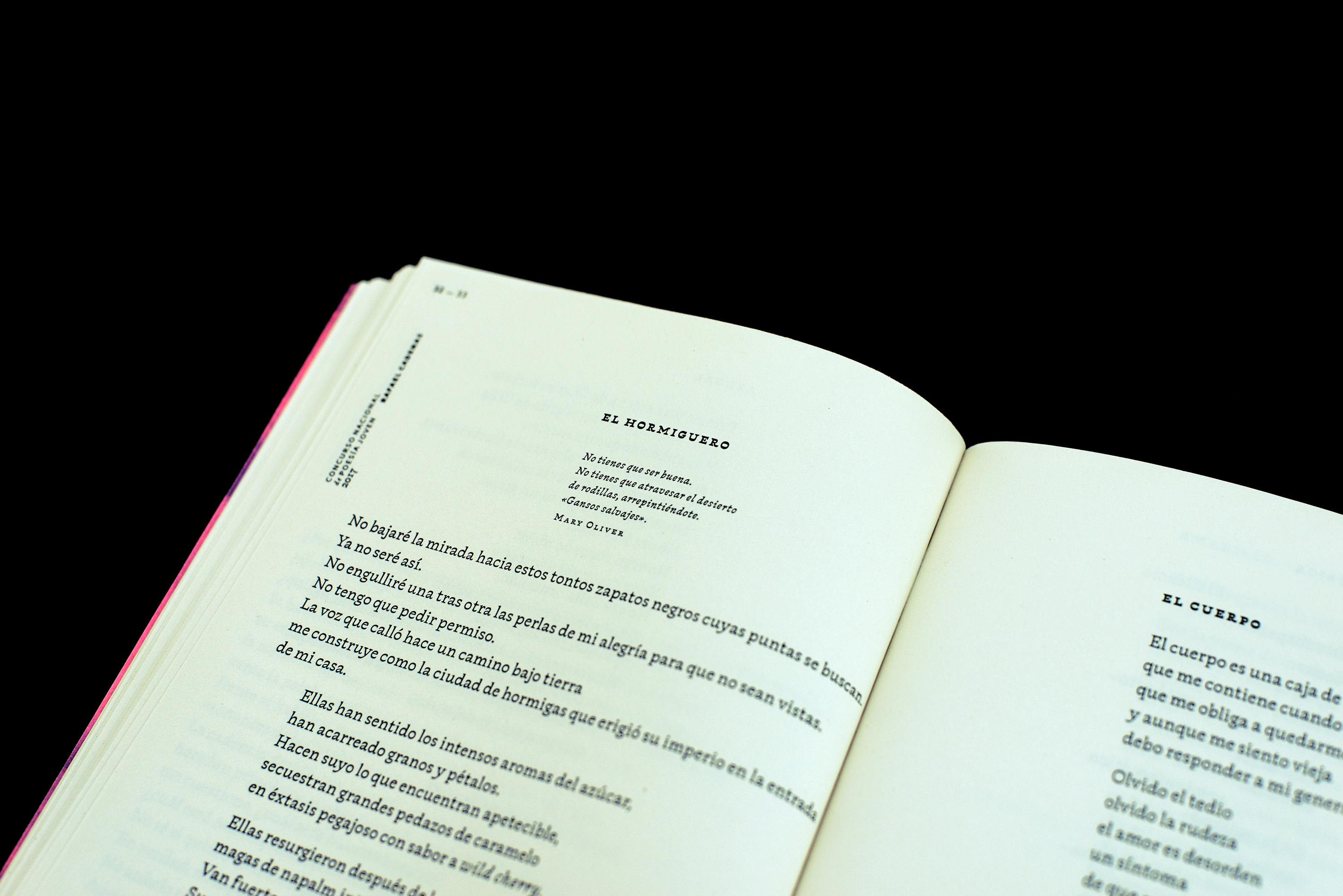 This book is a compilation of poems submitted by Venezuelan poets to the II. Rafael Cadenas National Youth Poetry Competition. In 2018, it was awarded an Honorary Appreciation in the Best Book Design from all over the World competition held in Leipzig, Germany. The two typeface families used in this book, Lira Sans and Violeta, had not been officially published to that date.