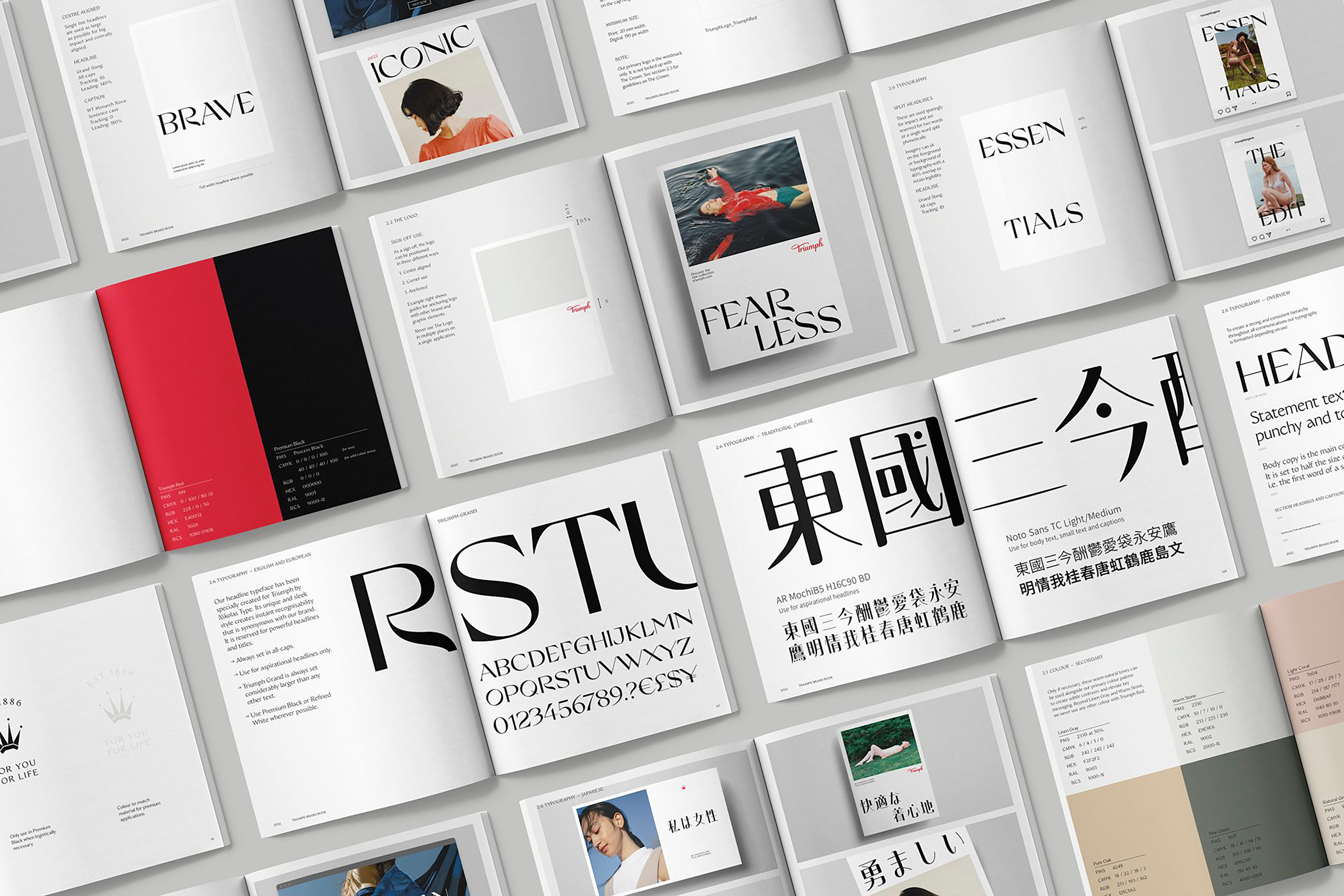 The primary typeface is a modification of Grand Slang, designed by Nikolas Type, called Triumph Grand, with softened edges and rounder points. Classic typography styled boldly to reflect Triumph’s dynamic future.. The secondary typeface is WT Monarch Nova by WiseType. The typographic pairing works to bring a heritage brand in to the modern landscape.