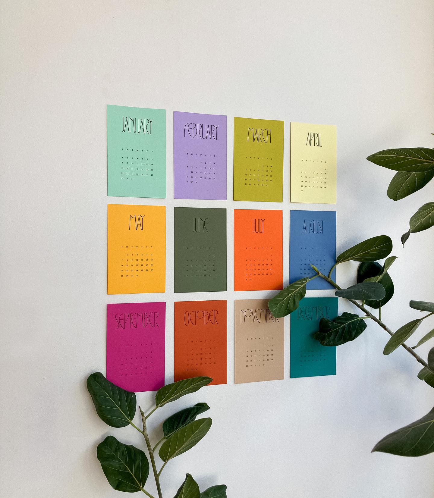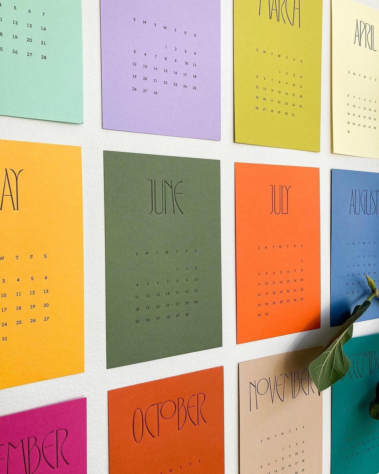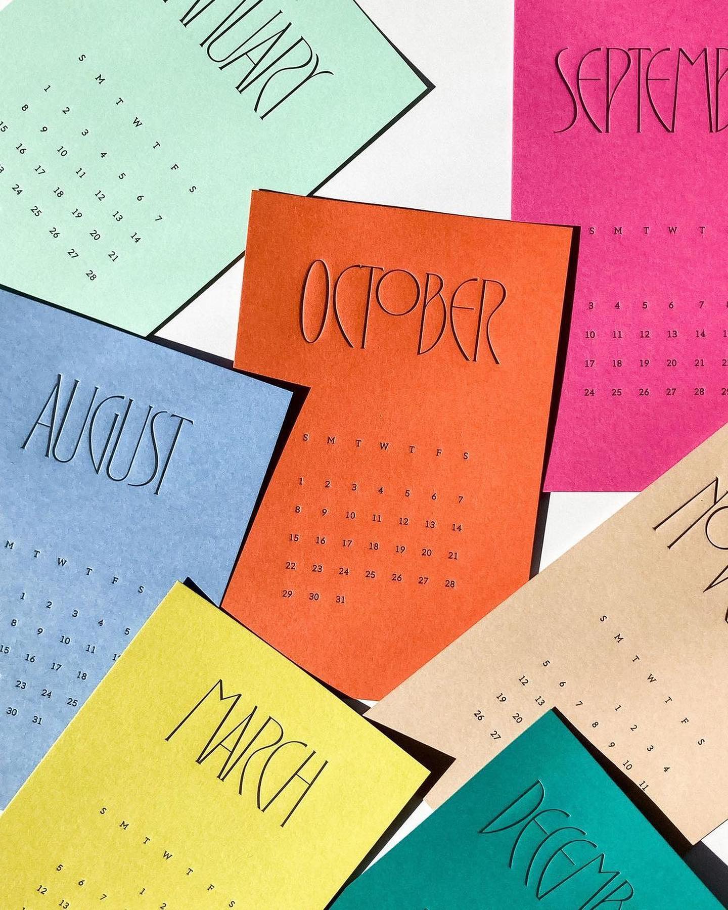 Month names are set in Eros, with numbers in an unidentified serif. The colored paper is by Colorplan.