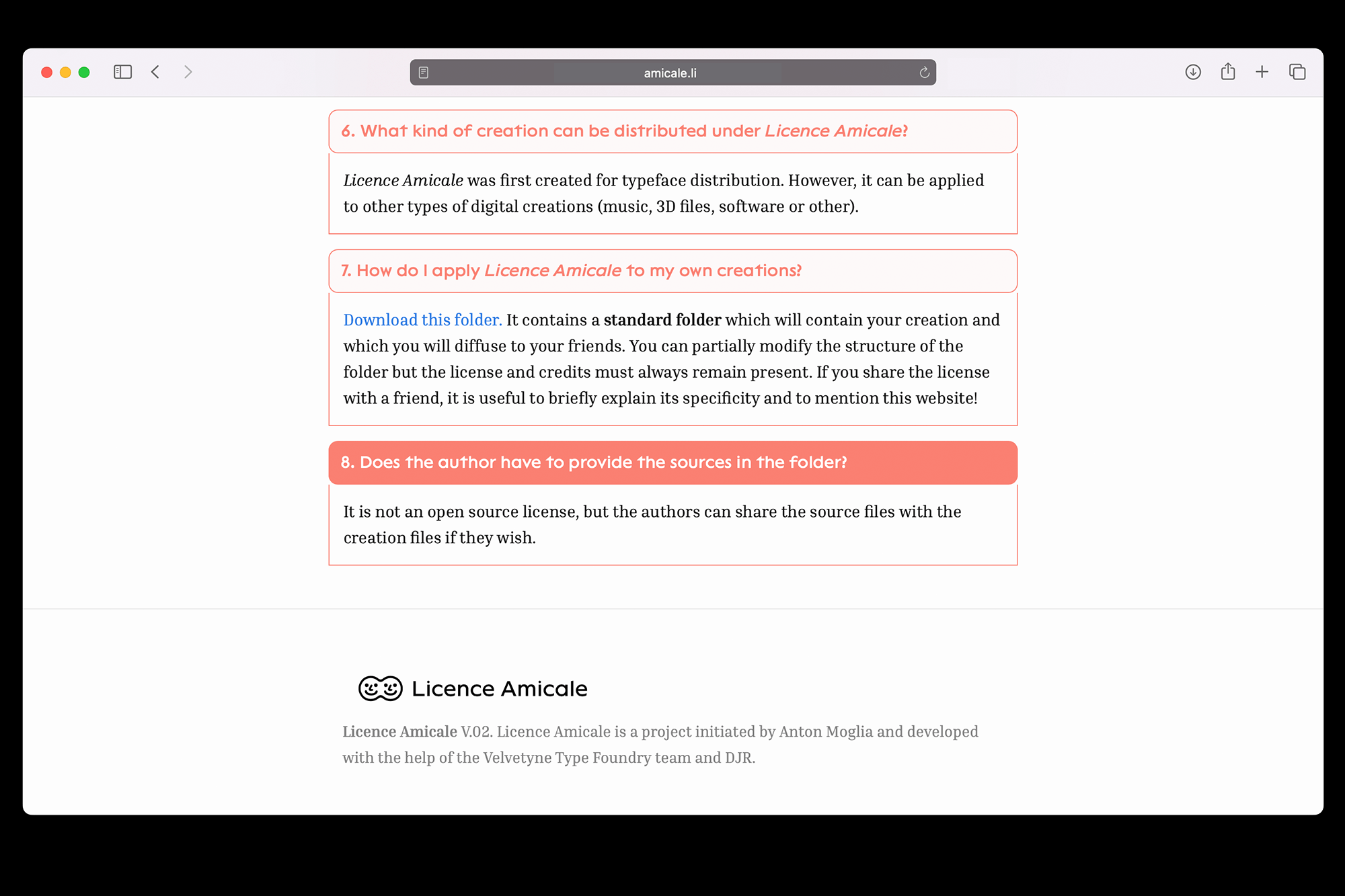 This initiative originated in France with Anton Moglia and was further developed through collaboration with the Velvetyne team and David Jonathan Ross. The single-page website for Licence Amicale features Lack for headings and Inria Serif for text blocks.