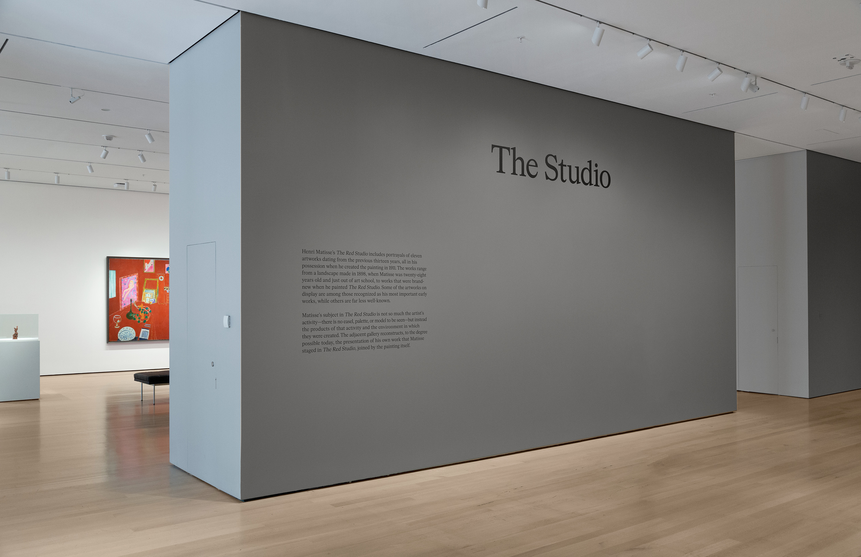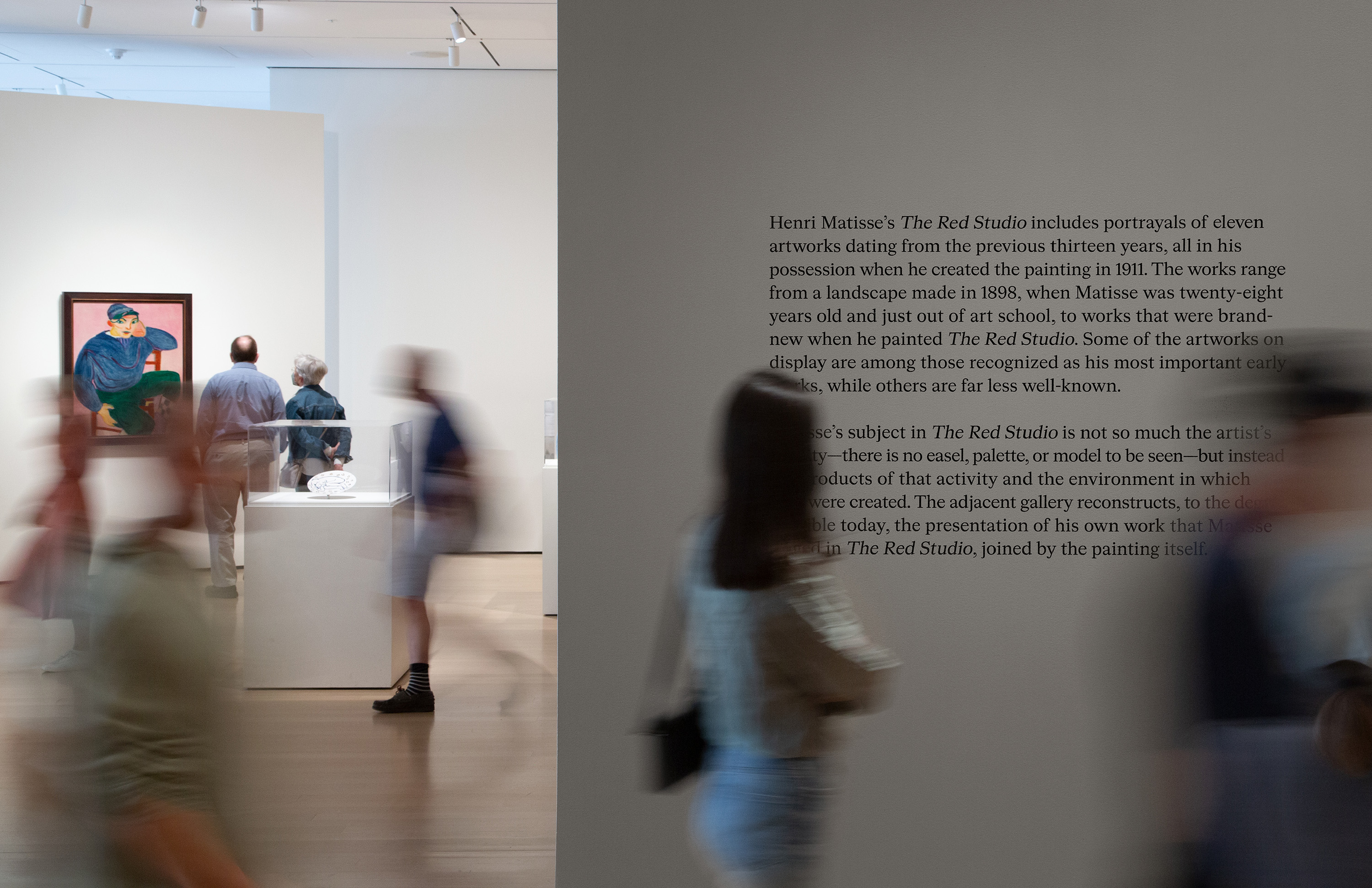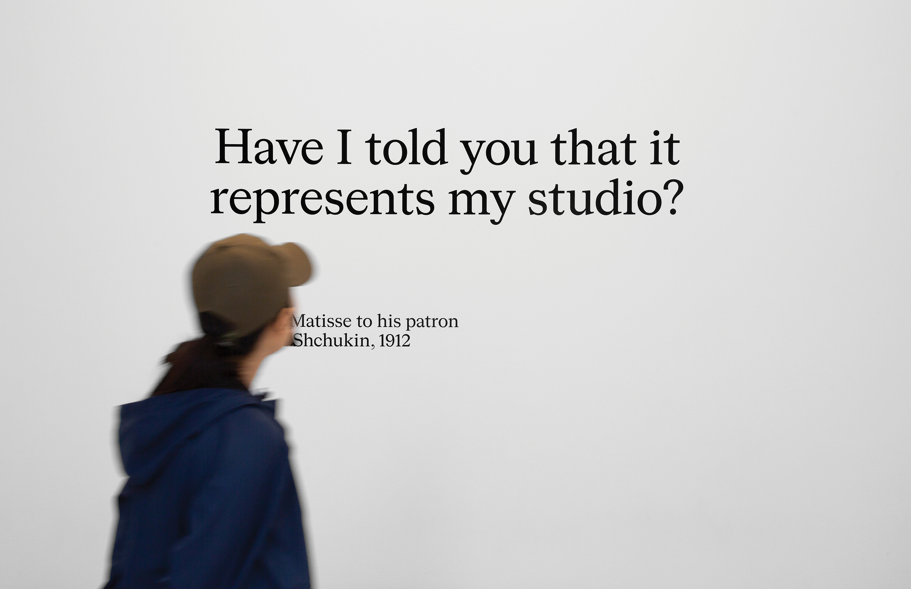 The gallery experience began in a long corridor with large typographic excerpts from Matisse’s letter to his patron articulating his intention behind his new painting. Upon entering the space, bold headings announced the exhibition’s layout on two large gallery walls—“The Story” and “The Studio”. In the former gallery, large chapter-like headers detailed specific moments in the painting’s history giving visitors an immediate sense of time and place with large wallpapers create an immersive effect.