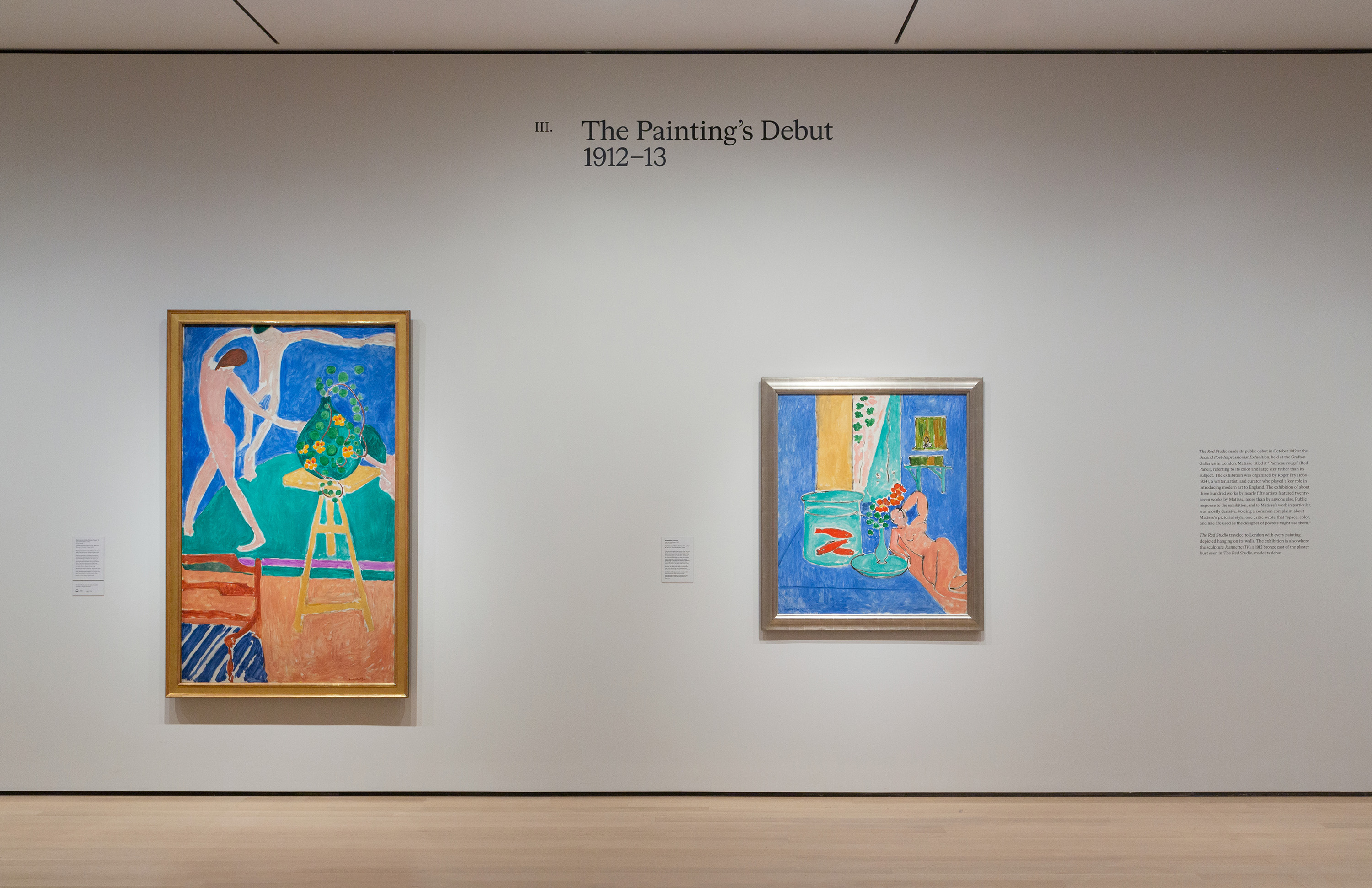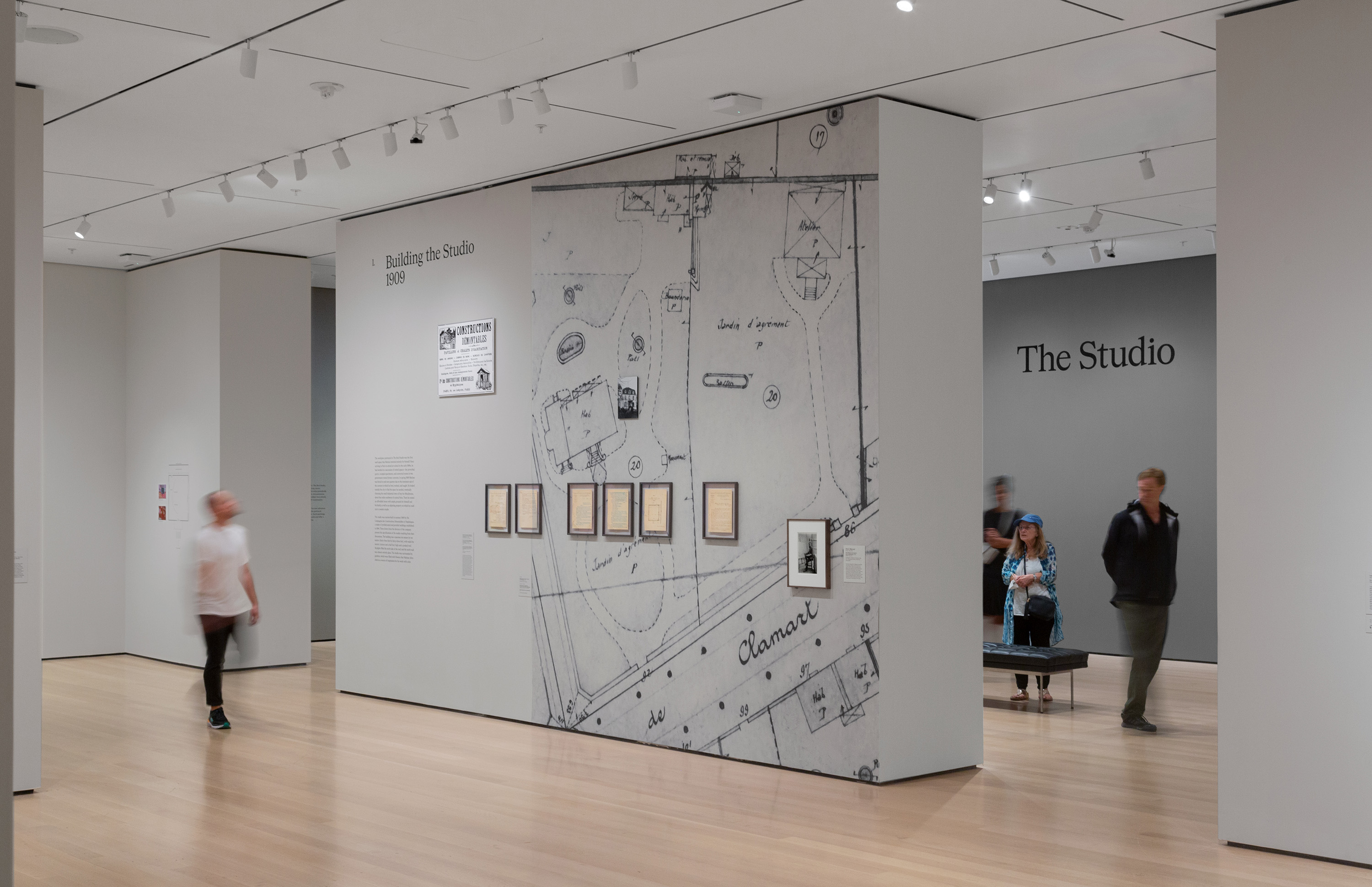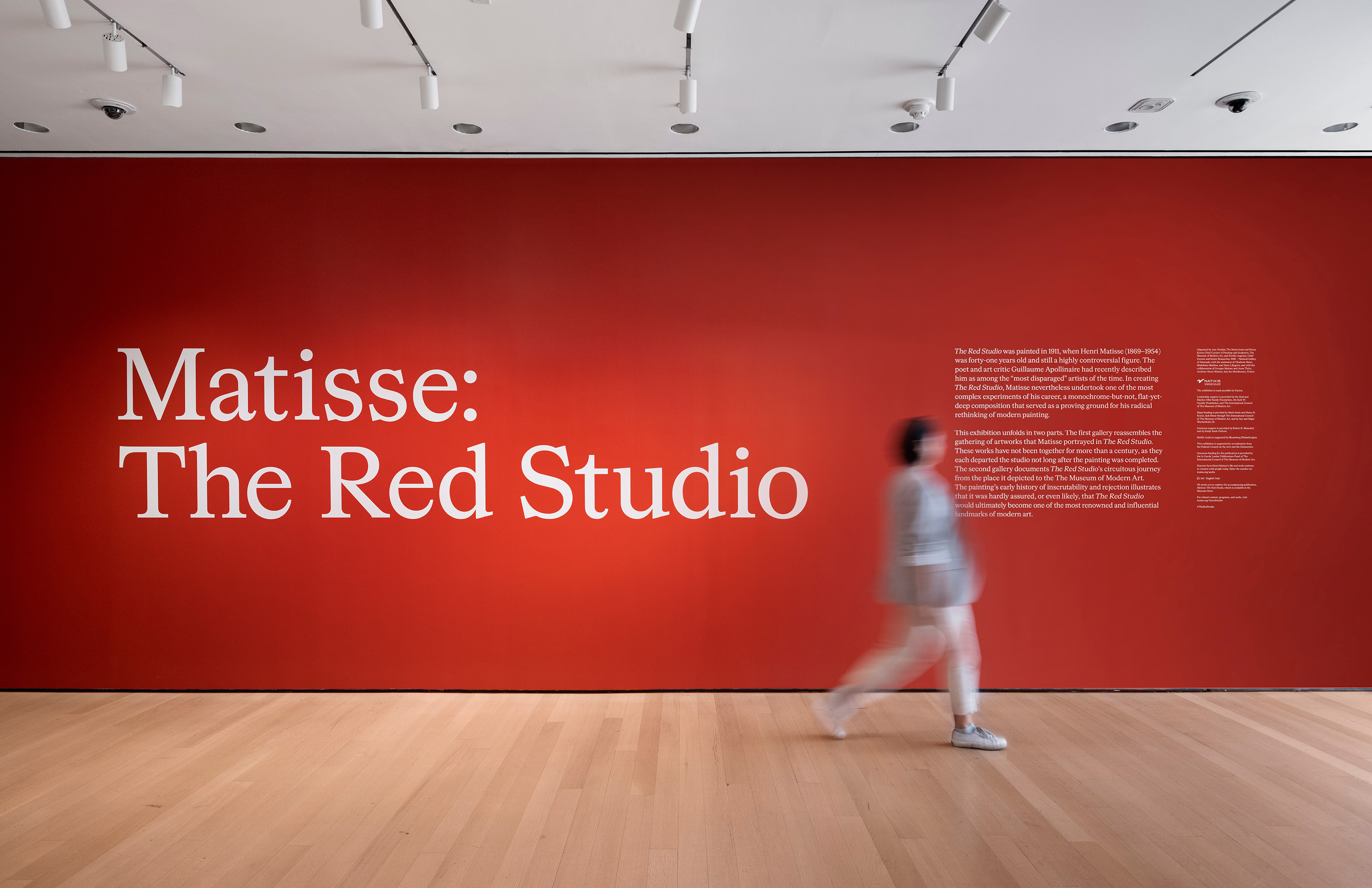 The gallery experience began in a long corridor with large typographic excerpts from Matisse’s letter to his patron articulating his intention behind his new painting. Upon entering the space, bold headings announced the exhibition’s layout on two large gallery walls—“The Story” and “The Studio”. In the former gallery, large chapter-like headers detailed specific moments in the painting’s history giving visitors an immediate sense of time and place with large wallpapers create an immersive effect.