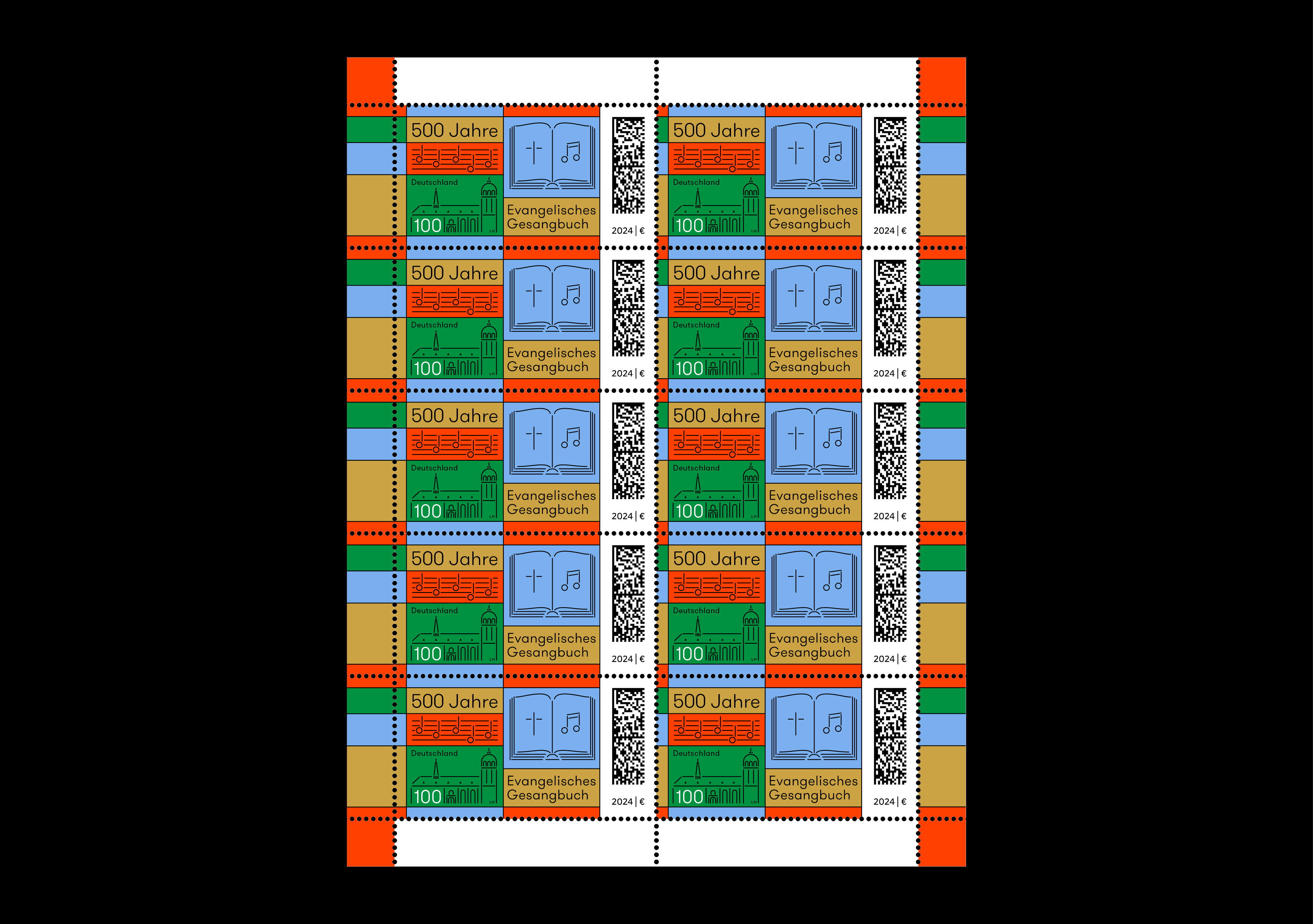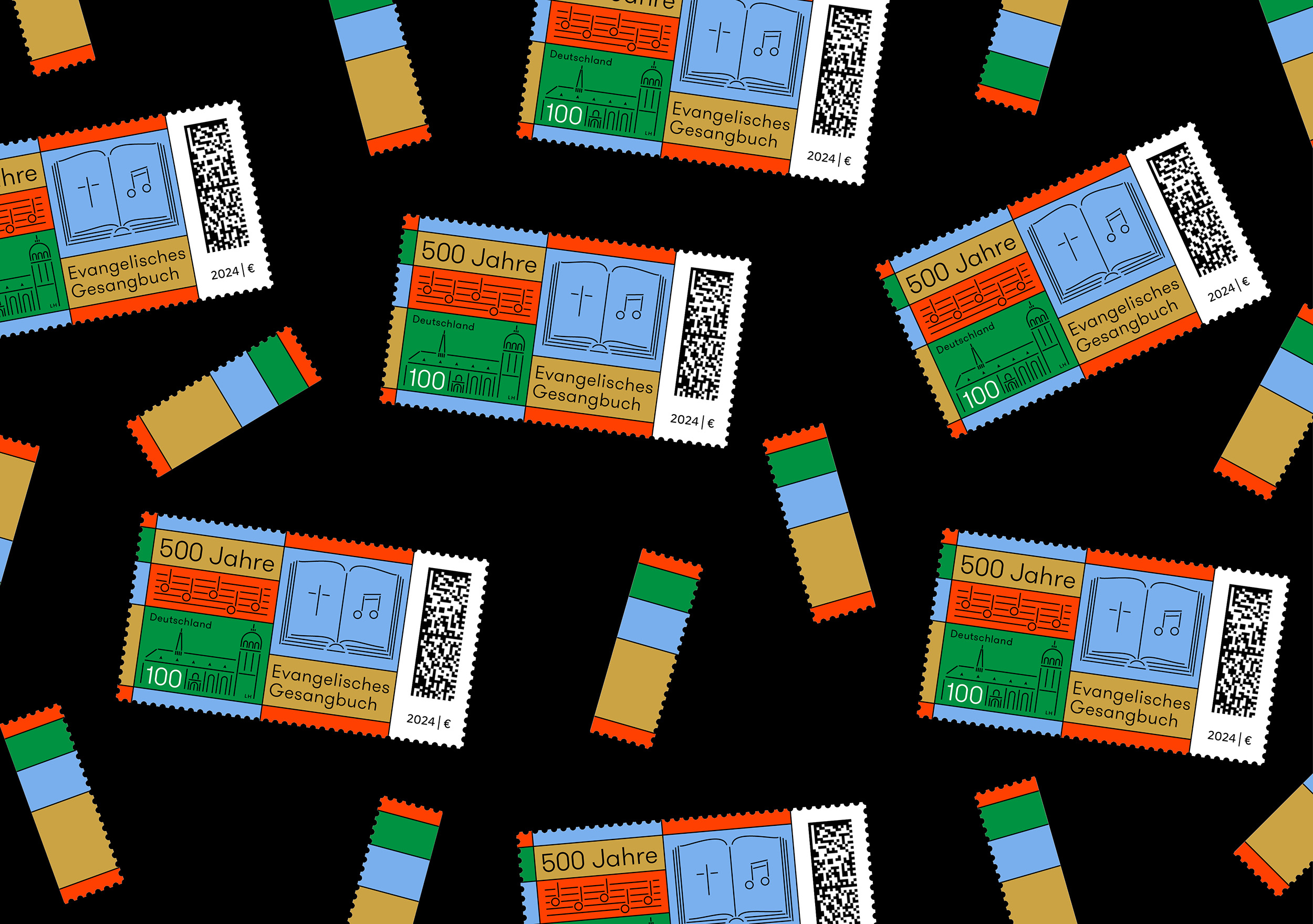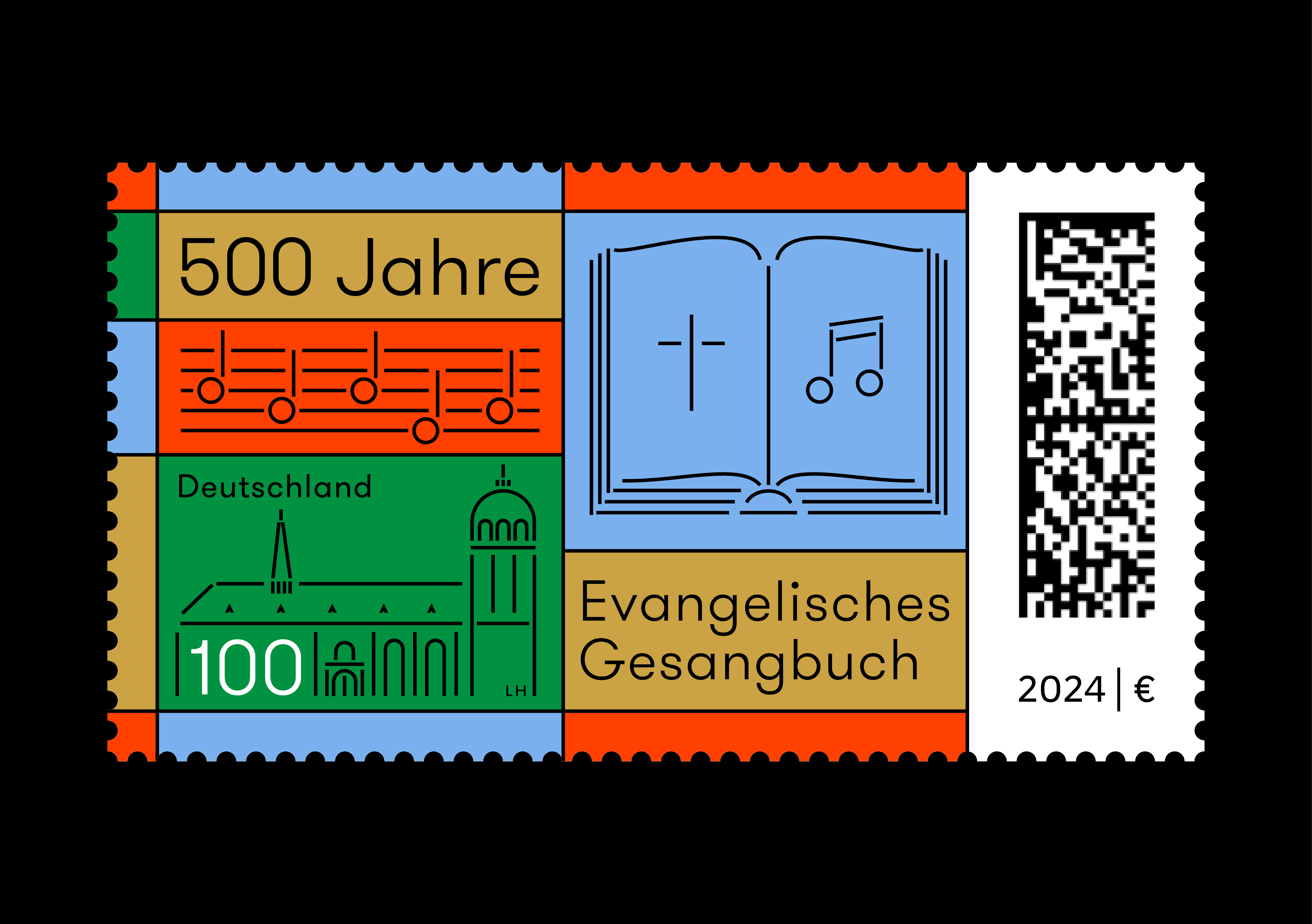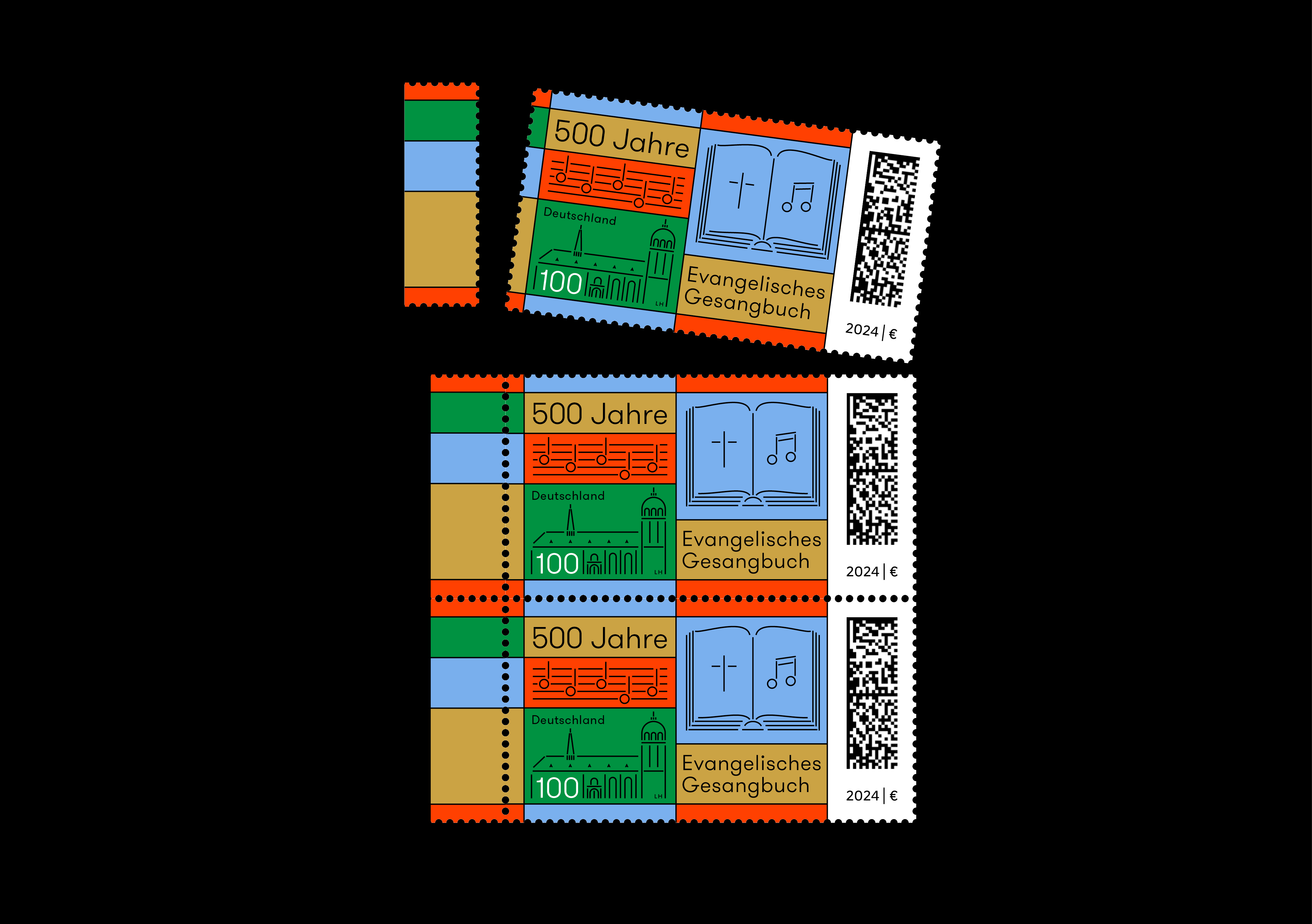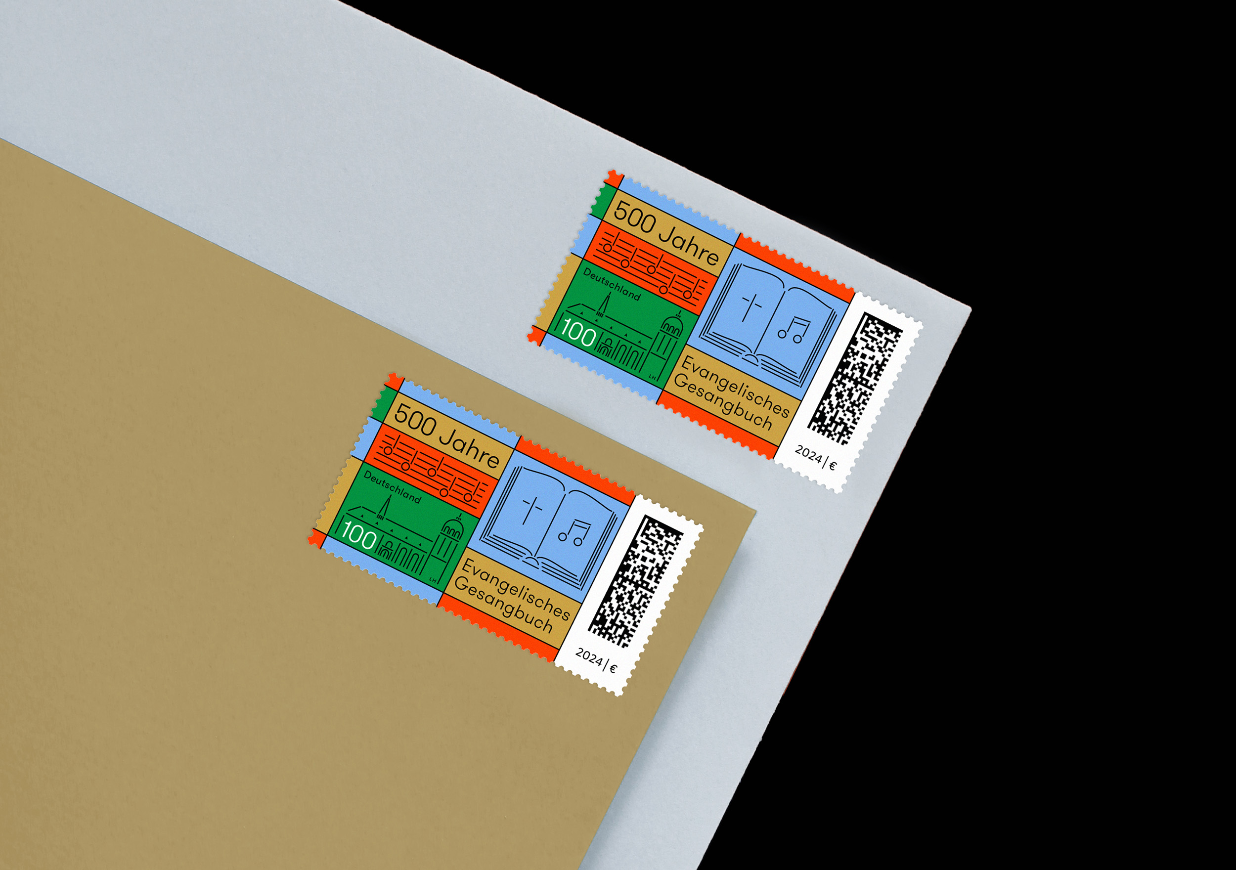 To mark the 500th anniversary of the Protestant hymn book, the German postal service published a stamp in January 2024. The stamp shows a stylized illustration of the hymn book and the church of Lutherstadt Wittenberge. I translated the historical theme into a contemporary, modern design , making visual reference to a church window that is illuminated. This effect intensifies when the stamp is arranged in a row with the margin of the sheet of ten stamps. GT Walsheim fits perfectly with the reduced, geometric illustrations and gives the stamp a modern character.