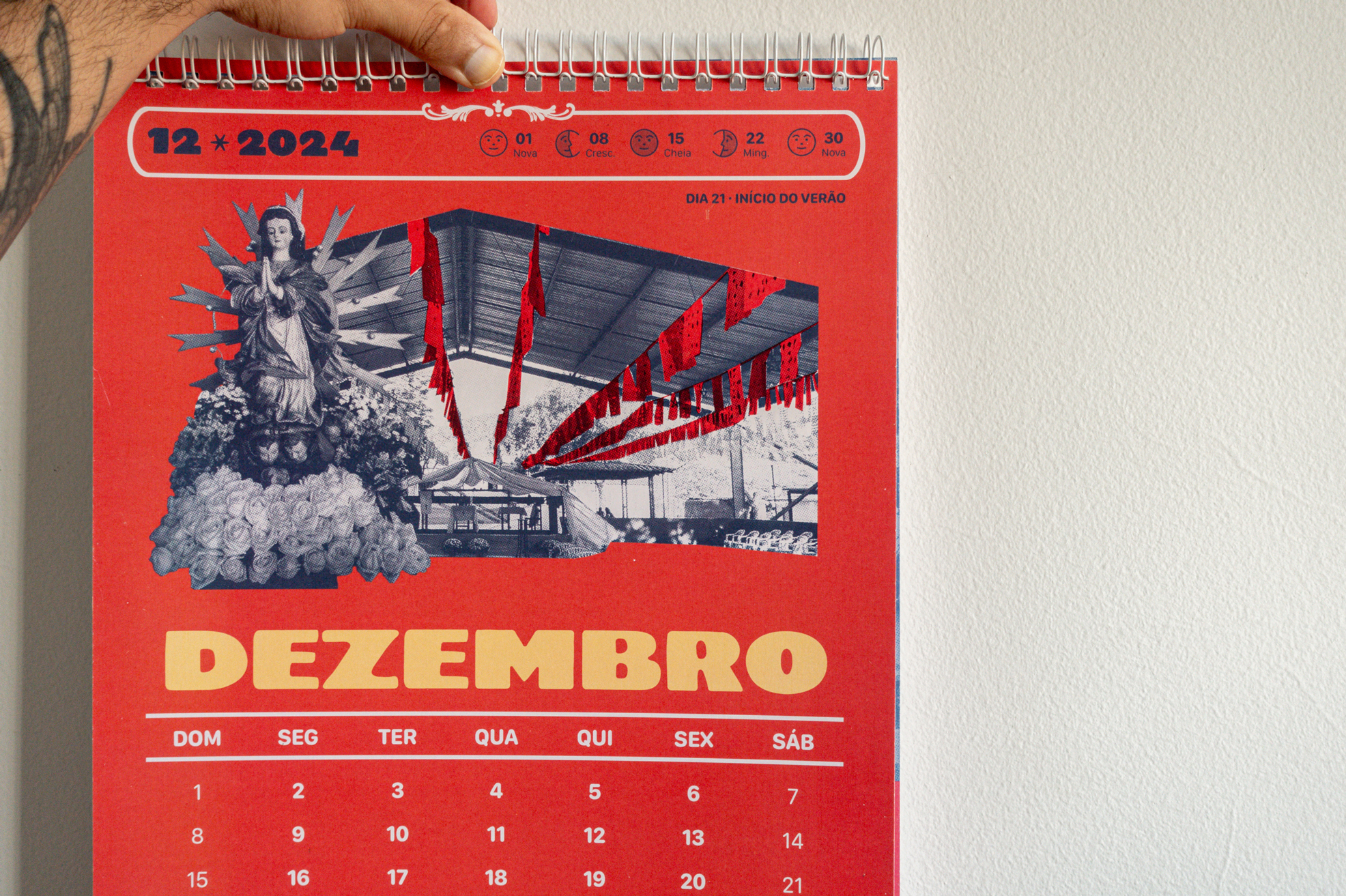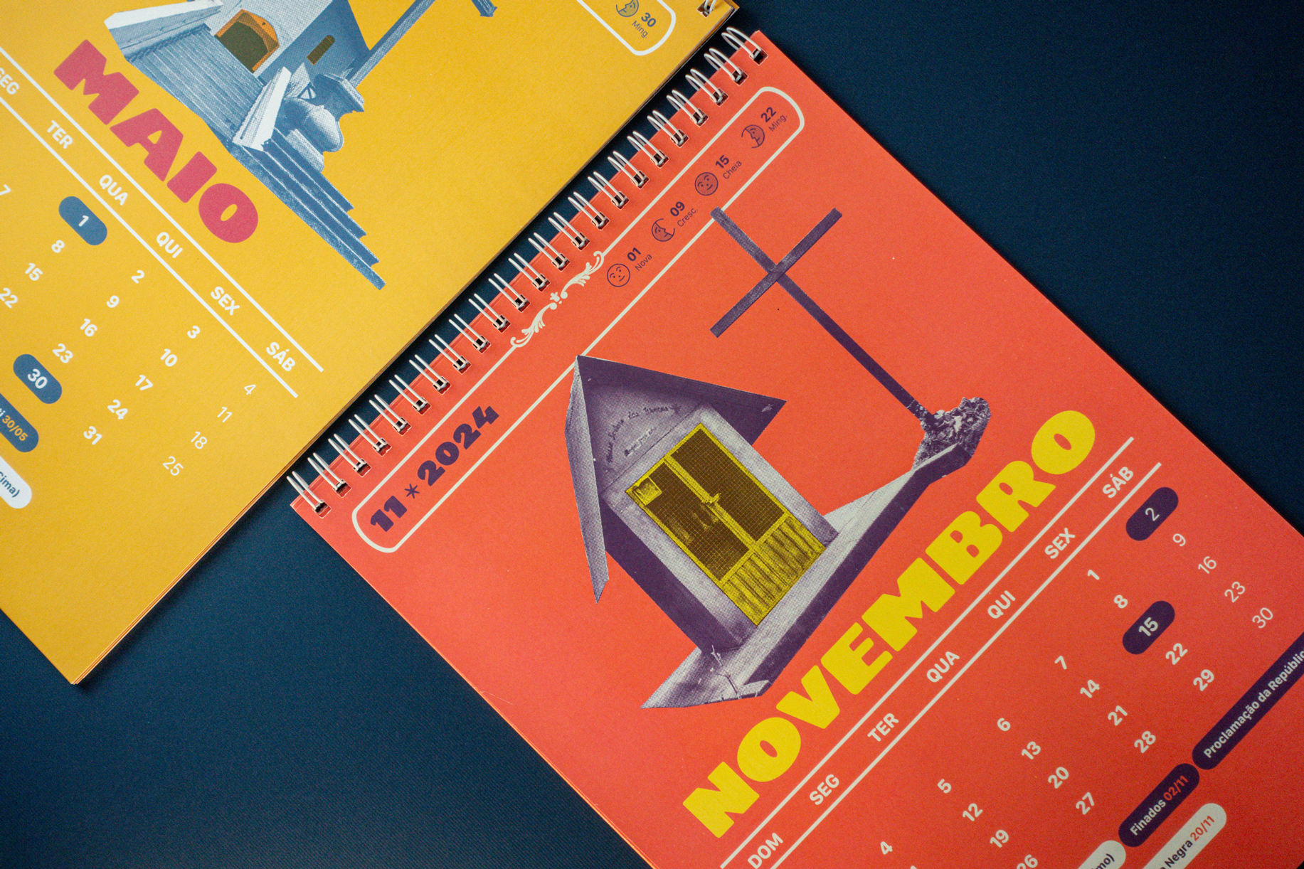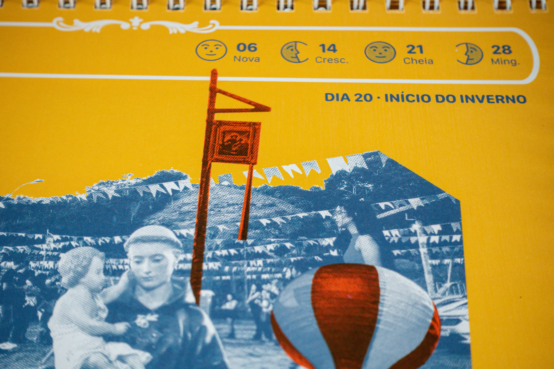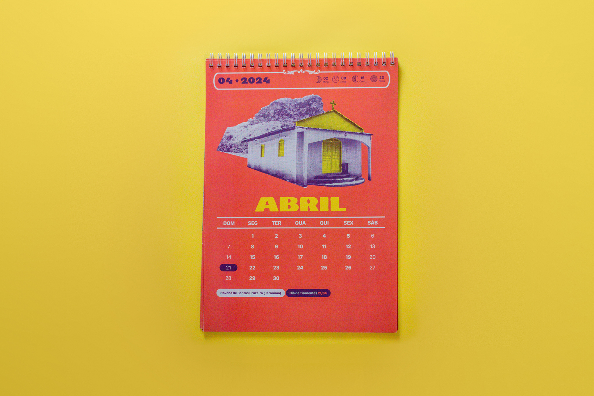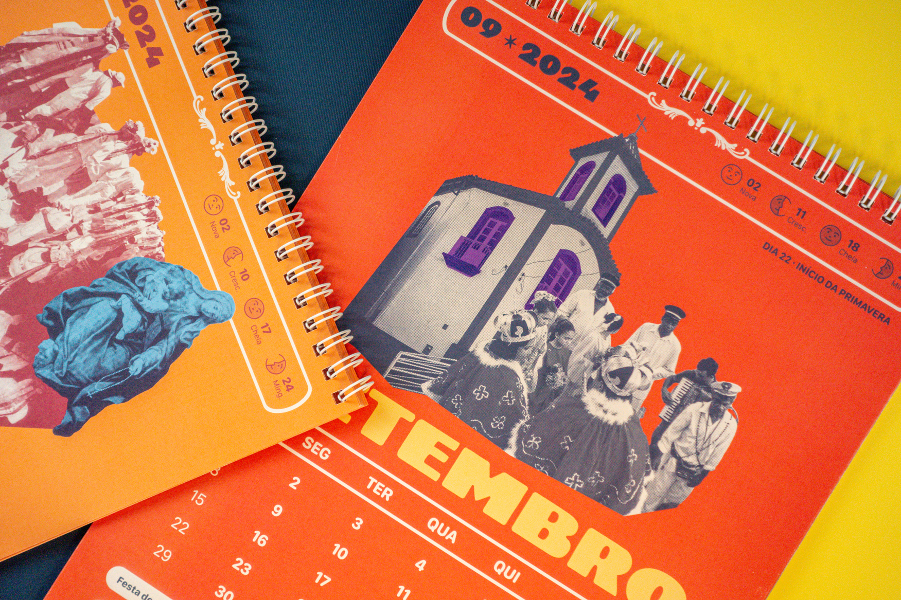 The cultural events calendars constitute a series comprising four editions for four different cities (Barra Longa, Mariana, Santa Cruz, Rio Doce), created upon invitation from the Renova Foundation. The purpose behind the creation of each calendar is to establish records marking the dates of characteristic cultural manifestations in each locality. This initiative aims to highlight a range of events in these cities, reinforcing the ancestral nature of these cultural expressions that persist in the lives of residents, even in the face of the impacts resulting from the dam collapse in Mariana, Minas Gerais, in 2015.