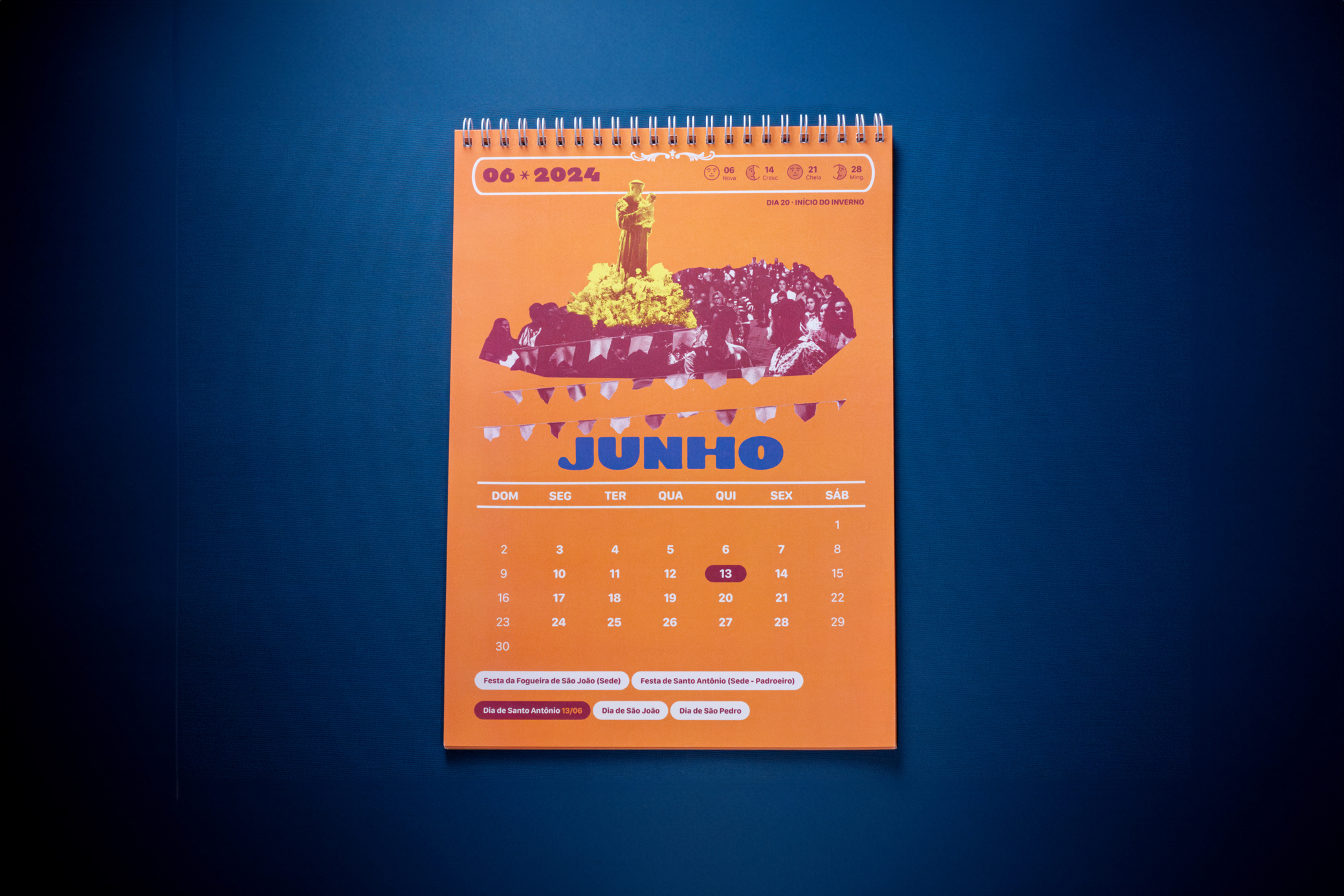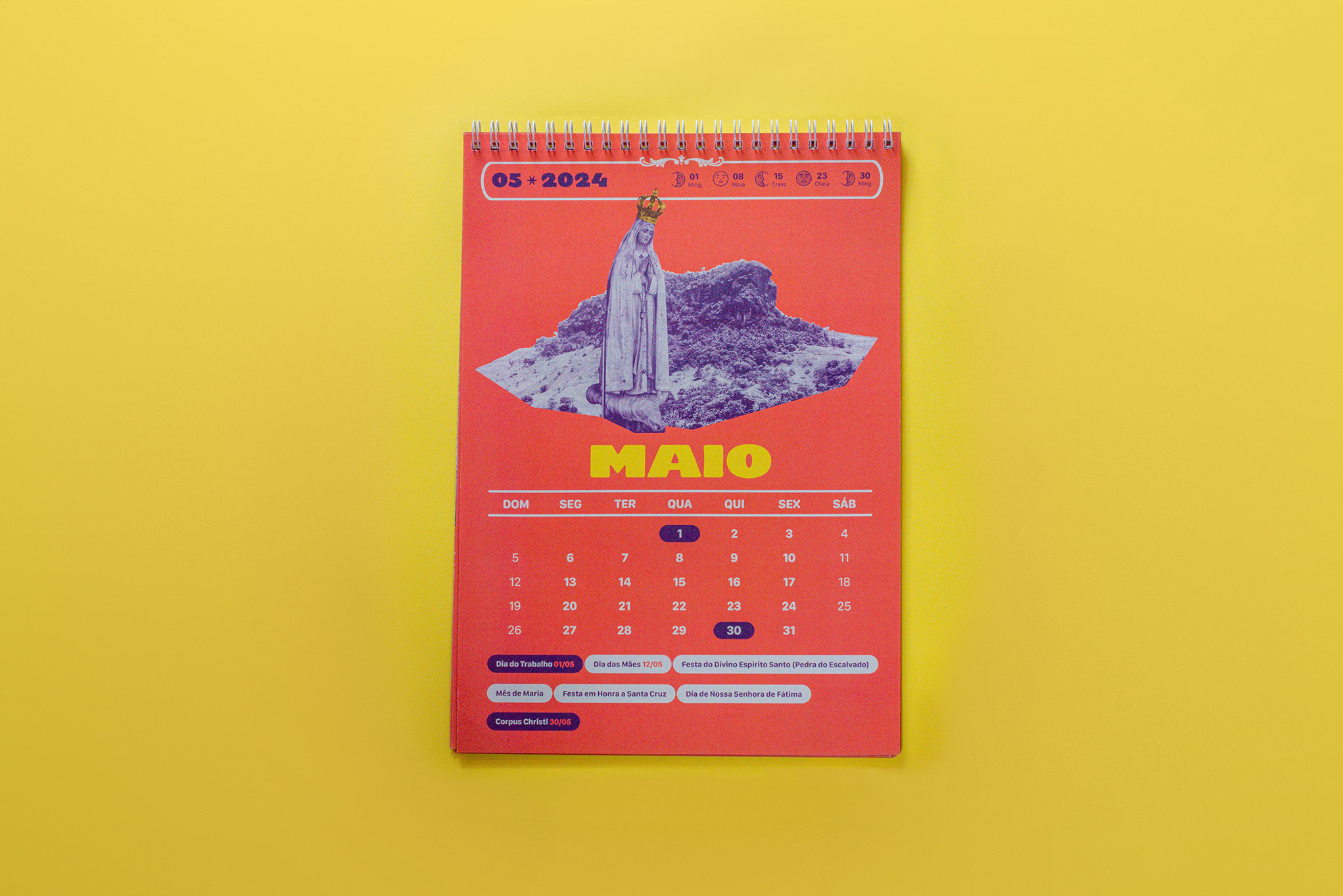 For the typographic choices, we opted to use rounded fonts inspired by 20th-century Catholic calendars, found in books and archives of the history of design and Brazilian graphic memory. These references are due to the fact that many of the events are Catholic festivities.
