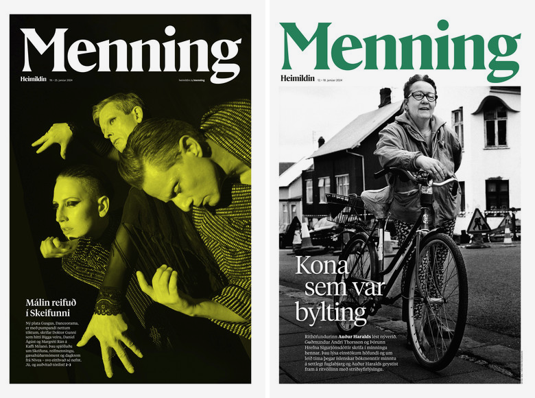 The new look was conceived by Jón Ingi Stefánsson, co-founder and former design director of Stundar. For the logo/nameplate, Stefánsson chose the Bold weight of Rector. This lapidary serif was designed by Hrvoje Živčić, and won him a Certificate of Typographic Excellence by the TDC. With its sharp details – like the wedge-shaped bars in H and e – Rector perfectly reflects Heimildin’s aspiration to be an incisive voice in Iceland’s media landscape. It’s also used for the logo of the supplement Menning (“Culture”), here starring its sculptural M and the defiant g. Rector is available from Production Type in a family of six weights in roman and italic. There is also Rector Display with Hairline and Outline styles.