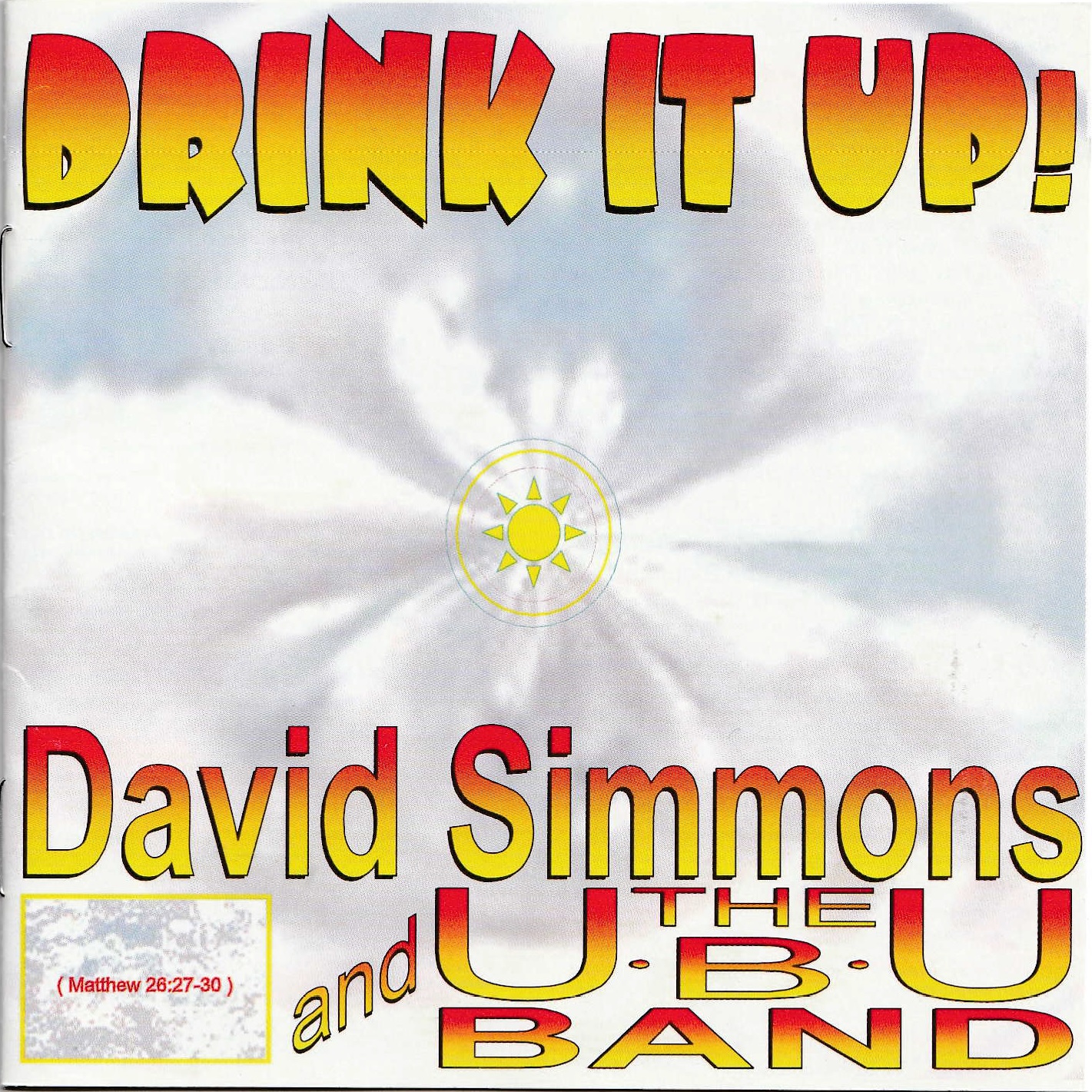 The packaging for Drink it Up!, an album by David Simmons & the U.B.U. Band – a bluegrass music band based in Inver Grove Heights, Minnesota – and apparently released by Joyful Records, who offered it on cassette and CD (the latter of which is shown here).